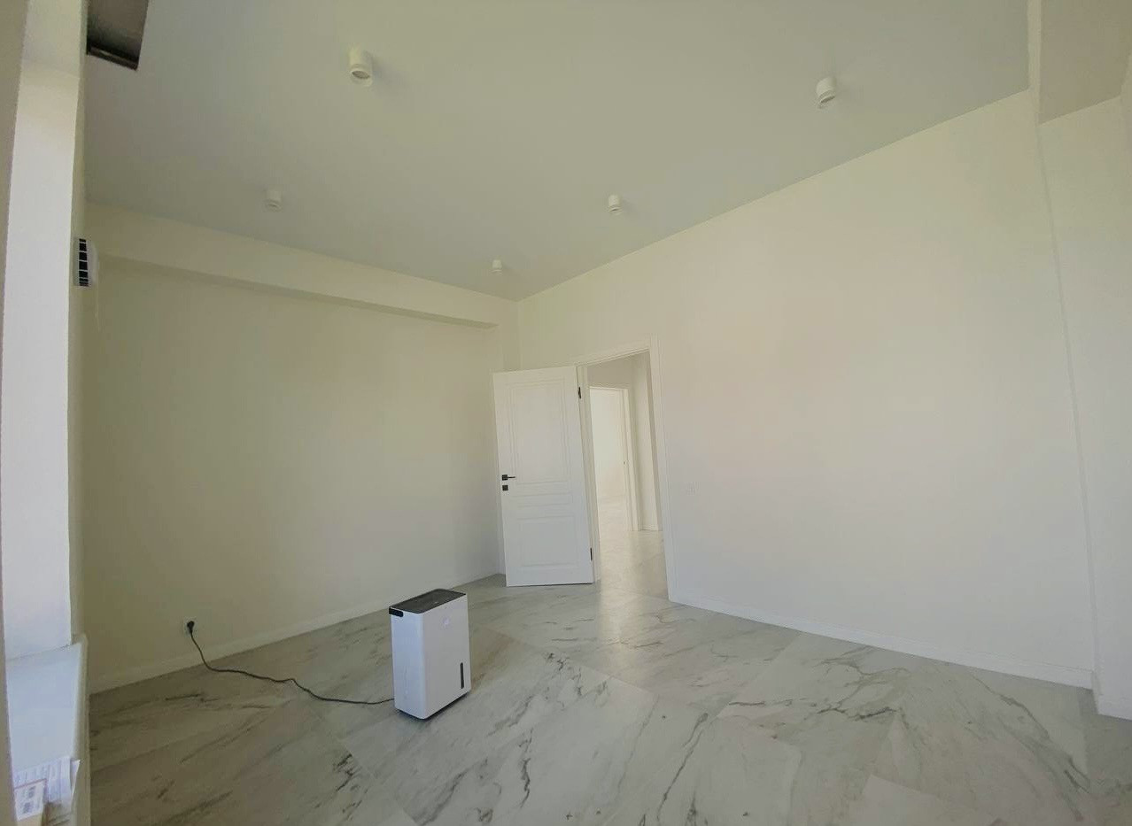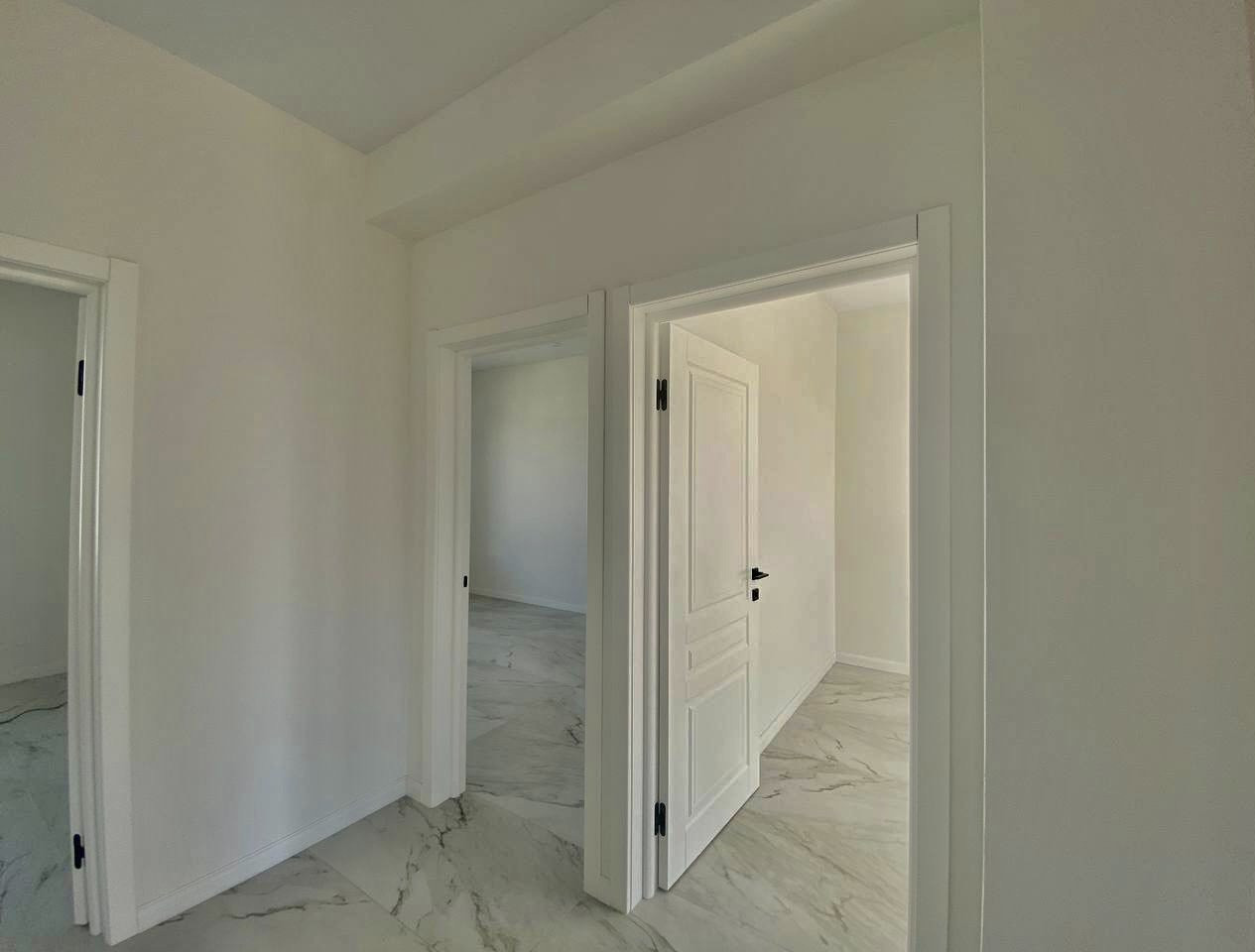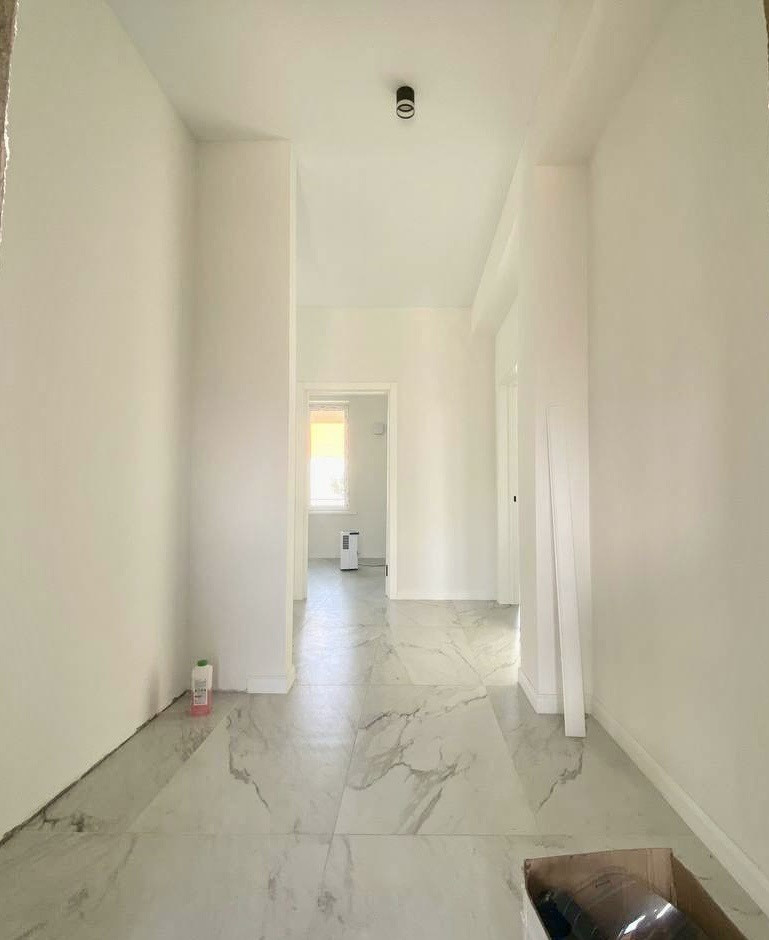 Внутри вы найдете просторную гостиную, которая объединена с кухонной и обеденной зоной, а также три спальни и санузел.