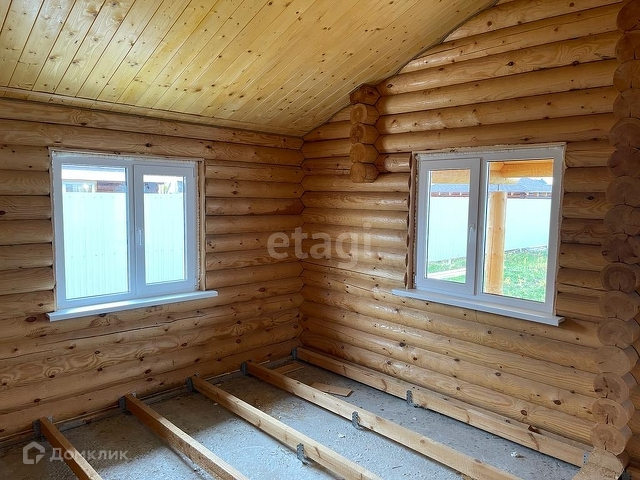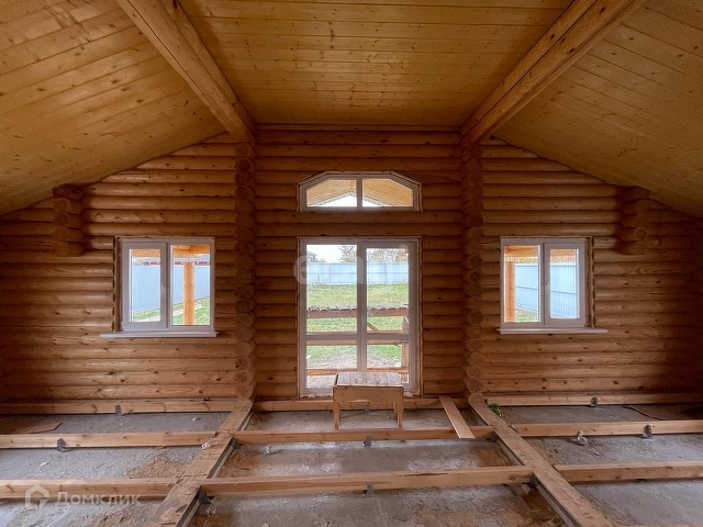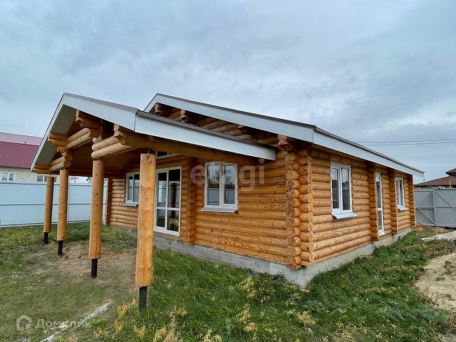 Дом выполнен из оцилиндрованного бруса, крыша - гибкая черепица.