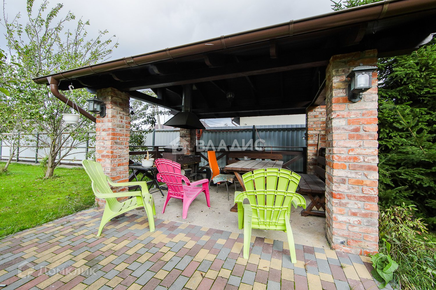 На территории участка построен великолепная крытая терраса-столовая с встроенной печью-барбекю.