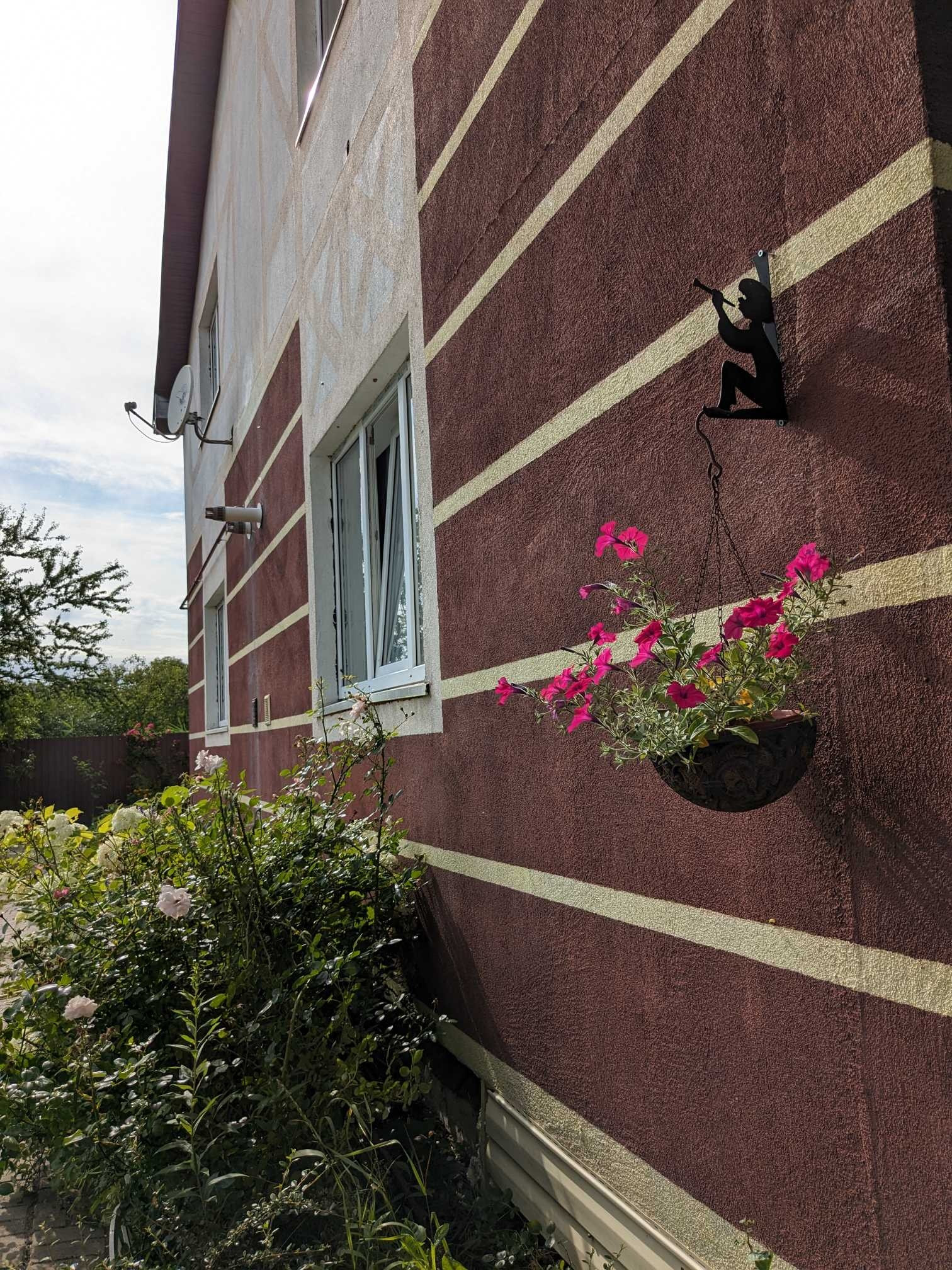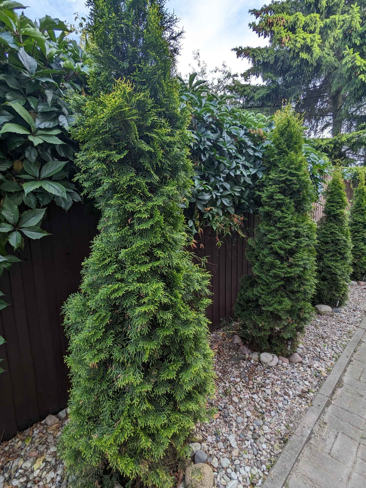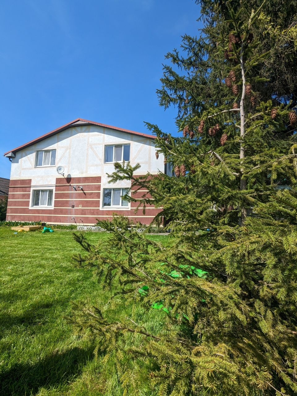 Вдоль секции высажены туи, под окнами растут гортензии и розы. На участке газон, ёлка, которую красиво можно нарядить на новый год, пластиковый хоз.домик. На краю соседнего участка расположены 2 огромные ели, которые дают прекрасный вид и создают тень в летнюю жаркую погоду.