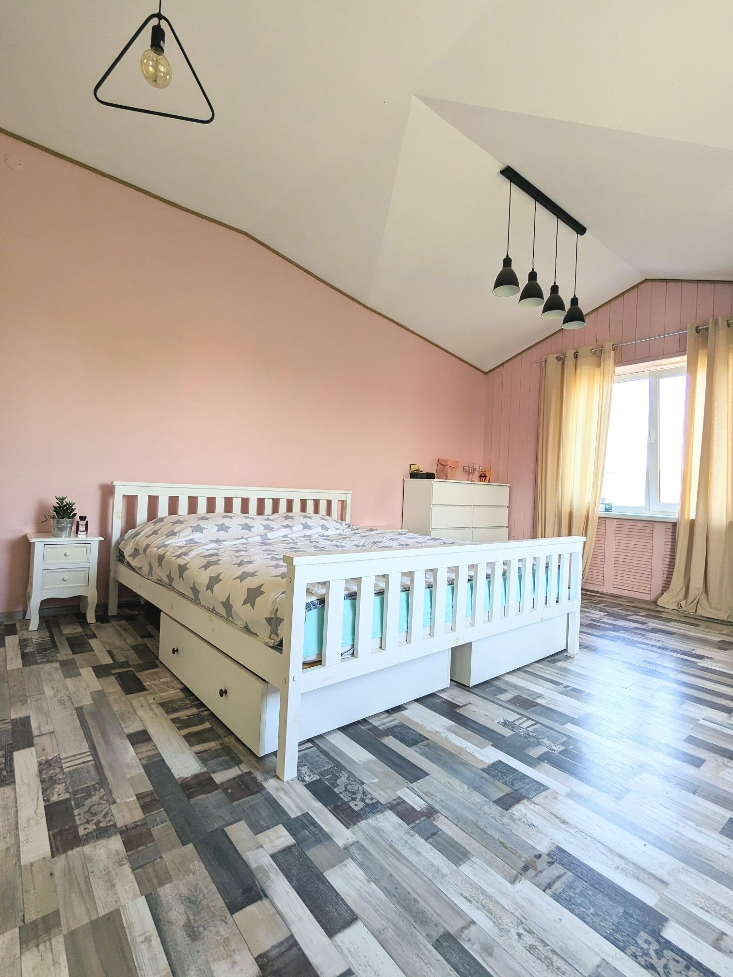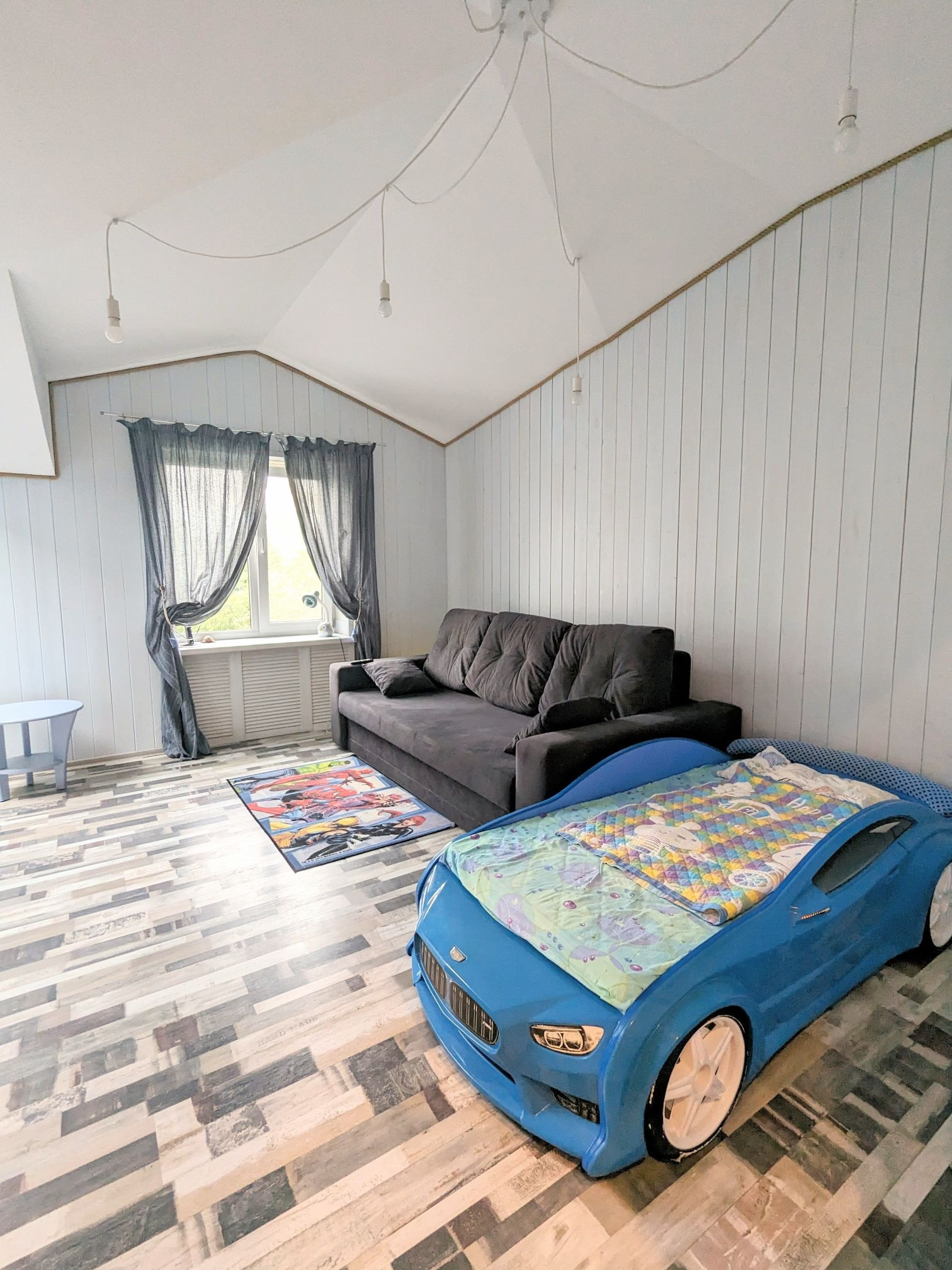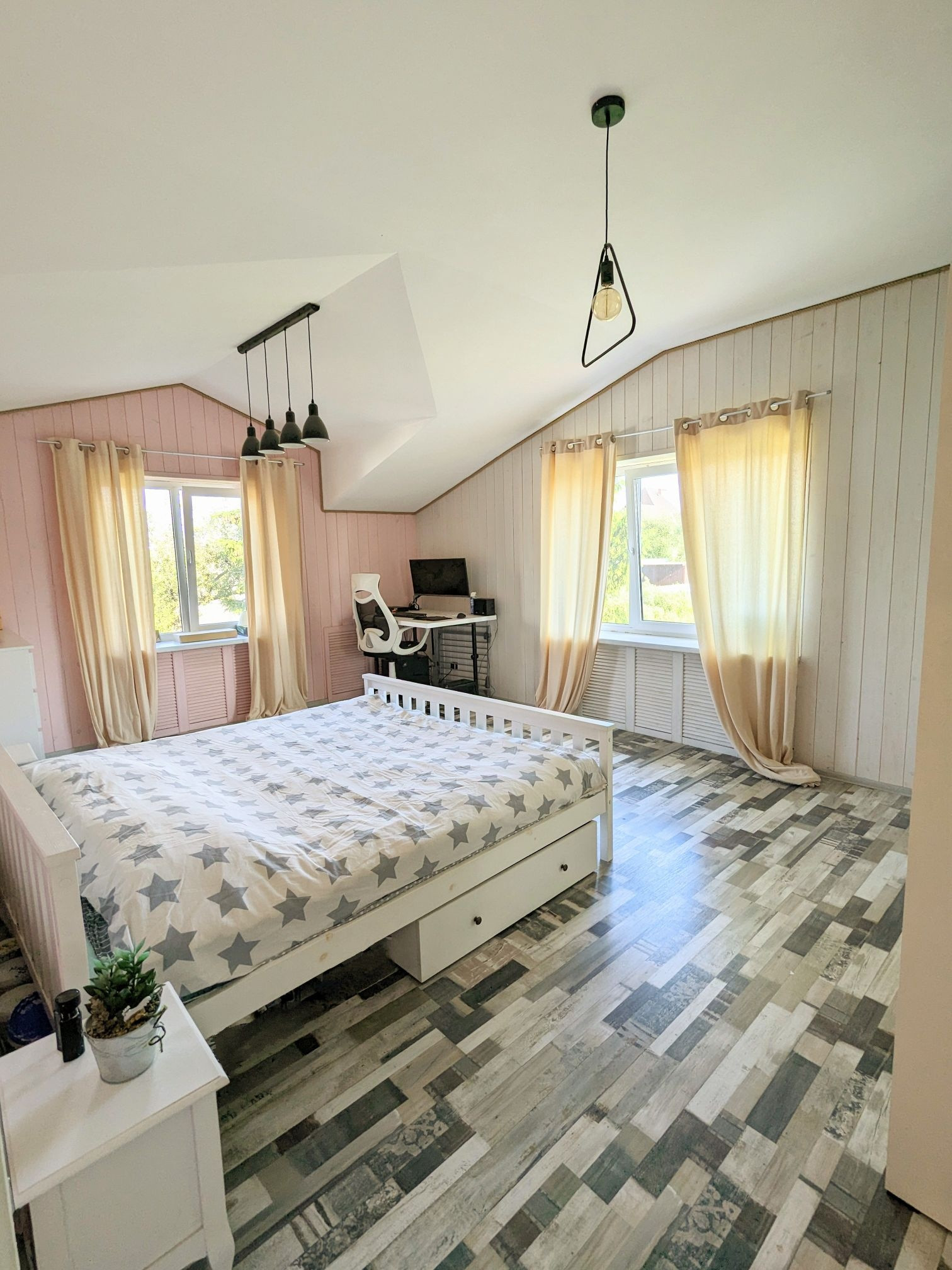 Второй этаж выполнен в эко стиле, с использованием евро - выгонки в моющейся немецкой краске. На втором этаже расположены две большие комнаты площадью 21,5 и 23,8 кв.м. Между комнатами сделана шумоизоляция. В каждой комнате имеется два окна, за счёт этого много света и хорошая вентиляция воздуха. Отопление - радиаторы, спрятаны декоративными решетками в стиль комнат.