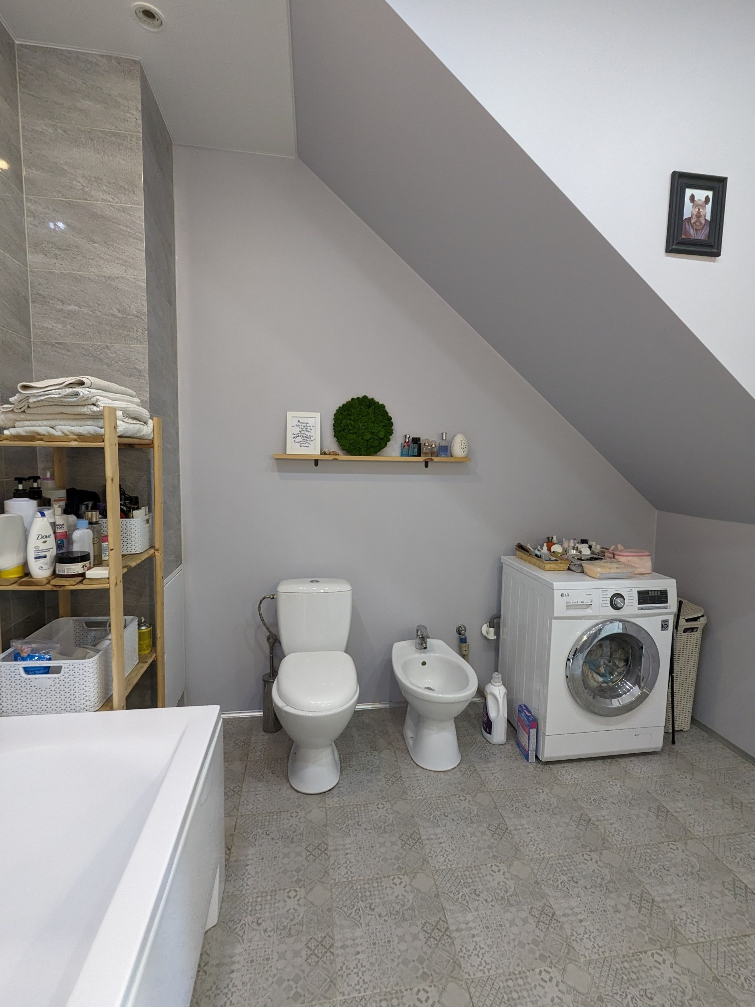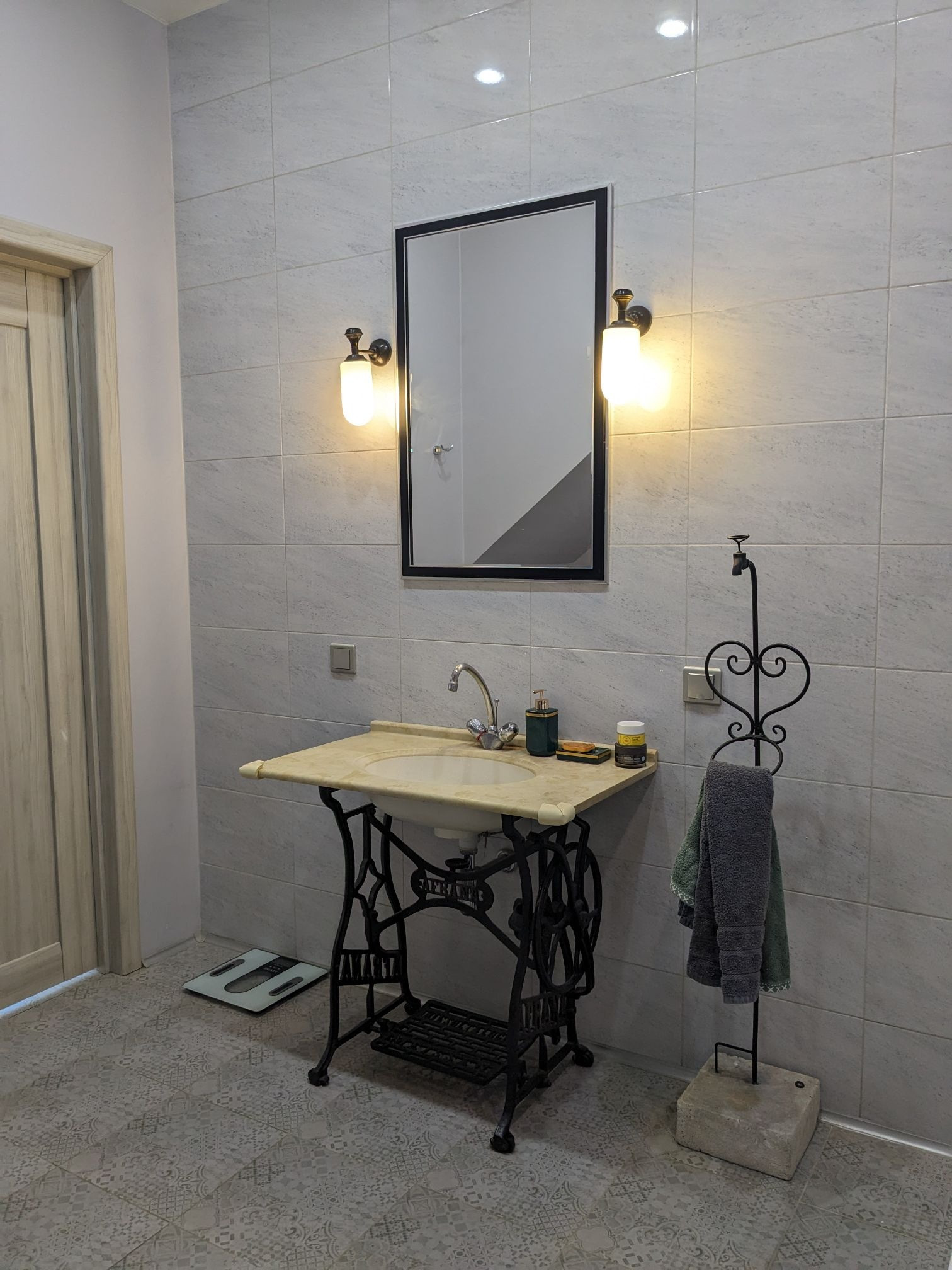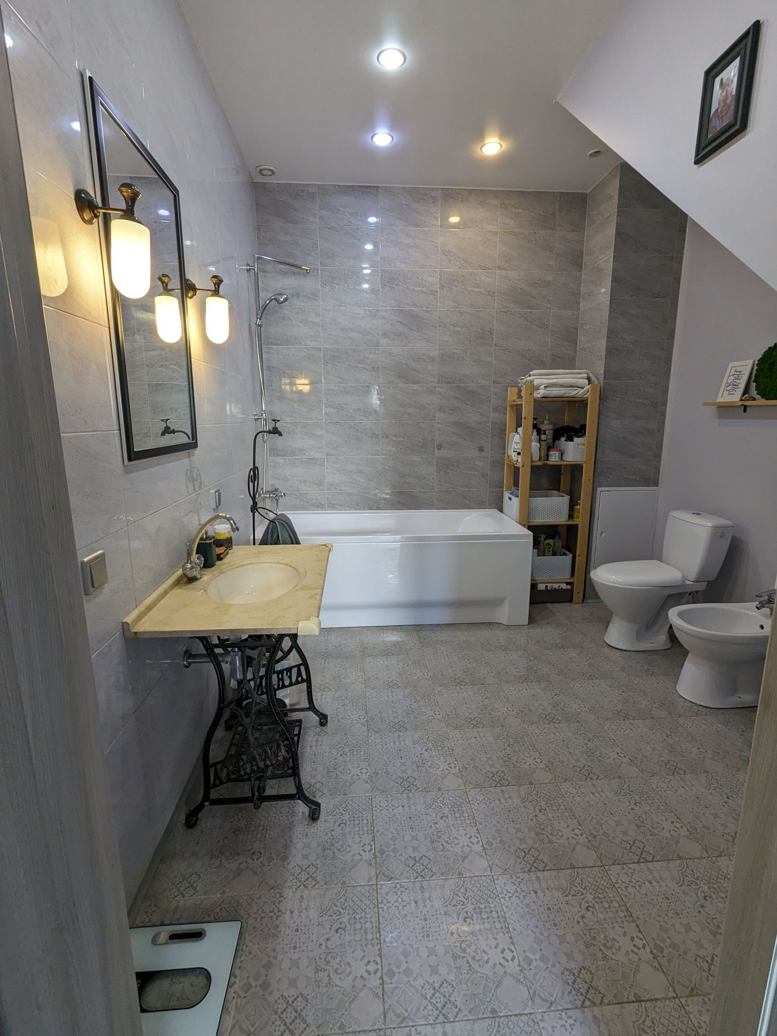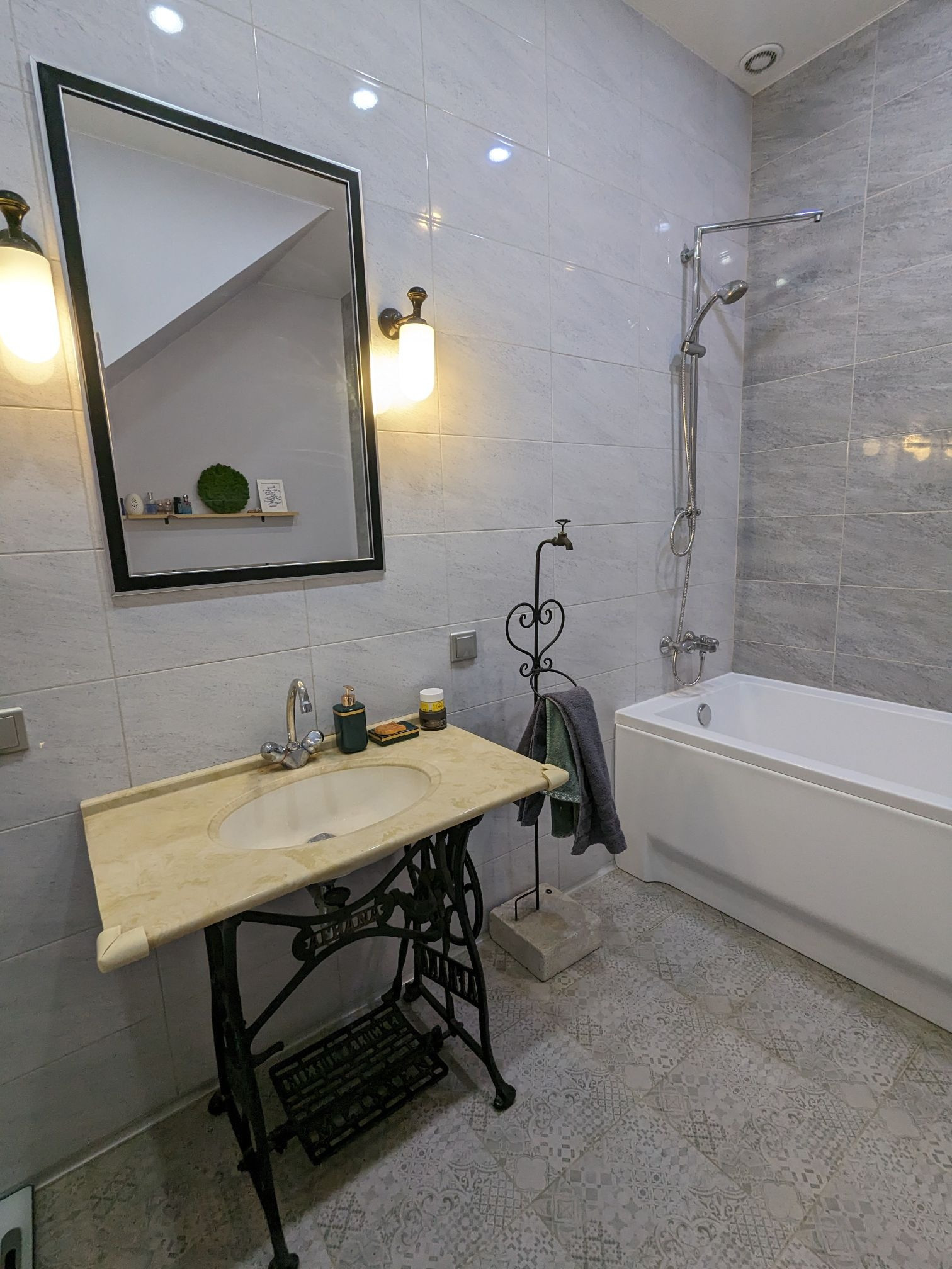 Ванная комната очень просторная, с польской акриловой ванной фирмы Varius, раковина выполнена из искусственного камня на редкой станине конца 19 века Afrana.