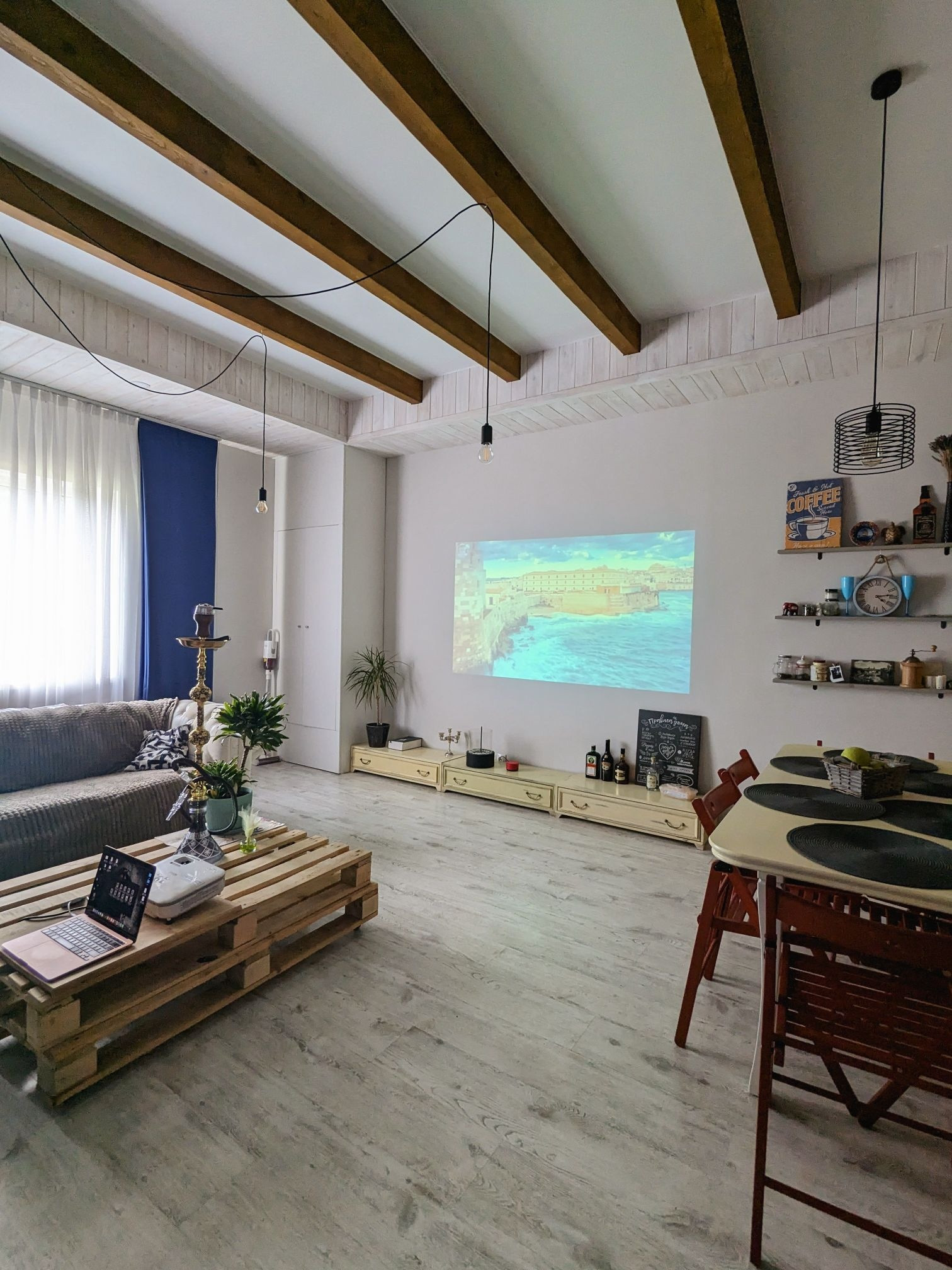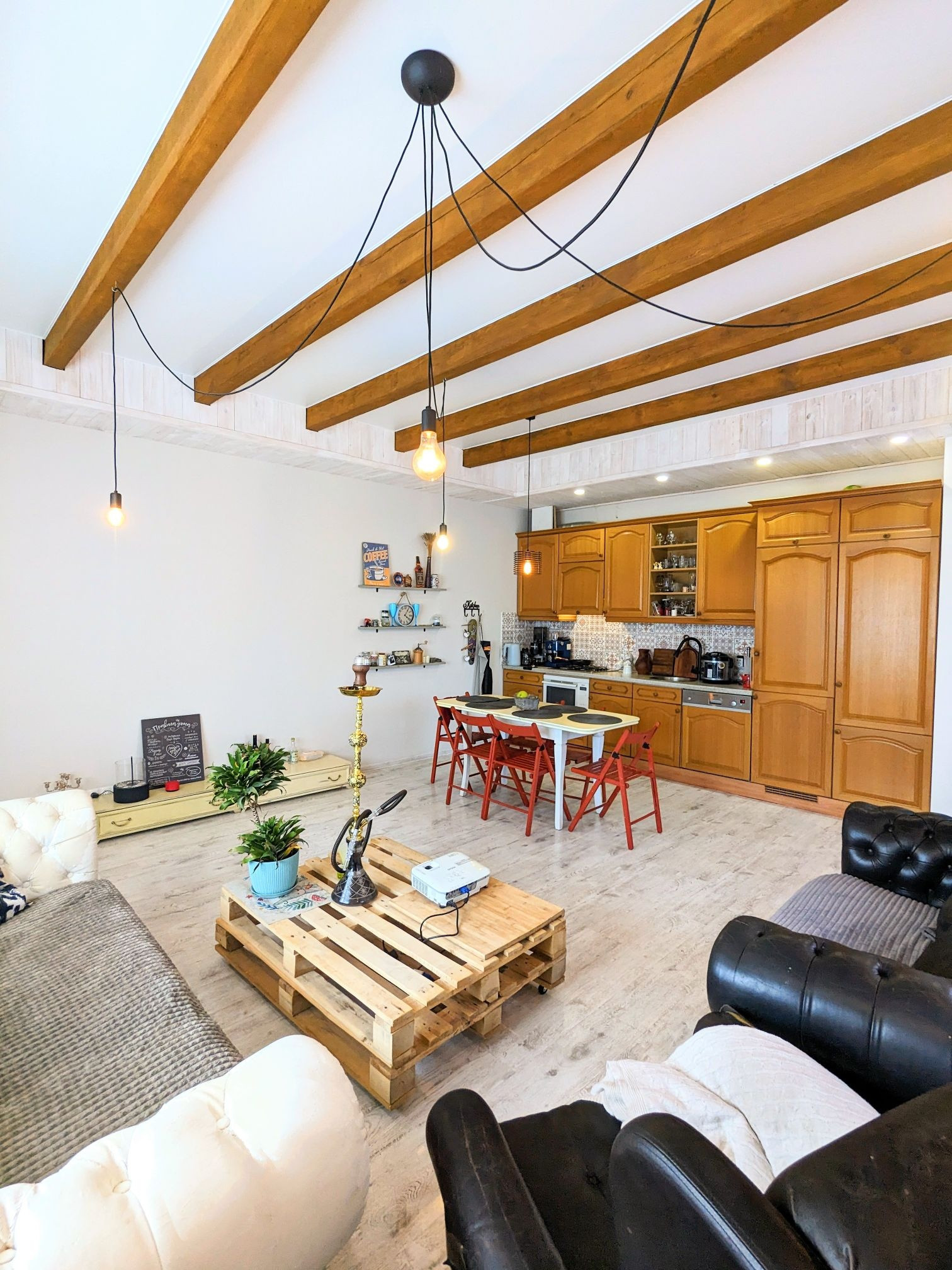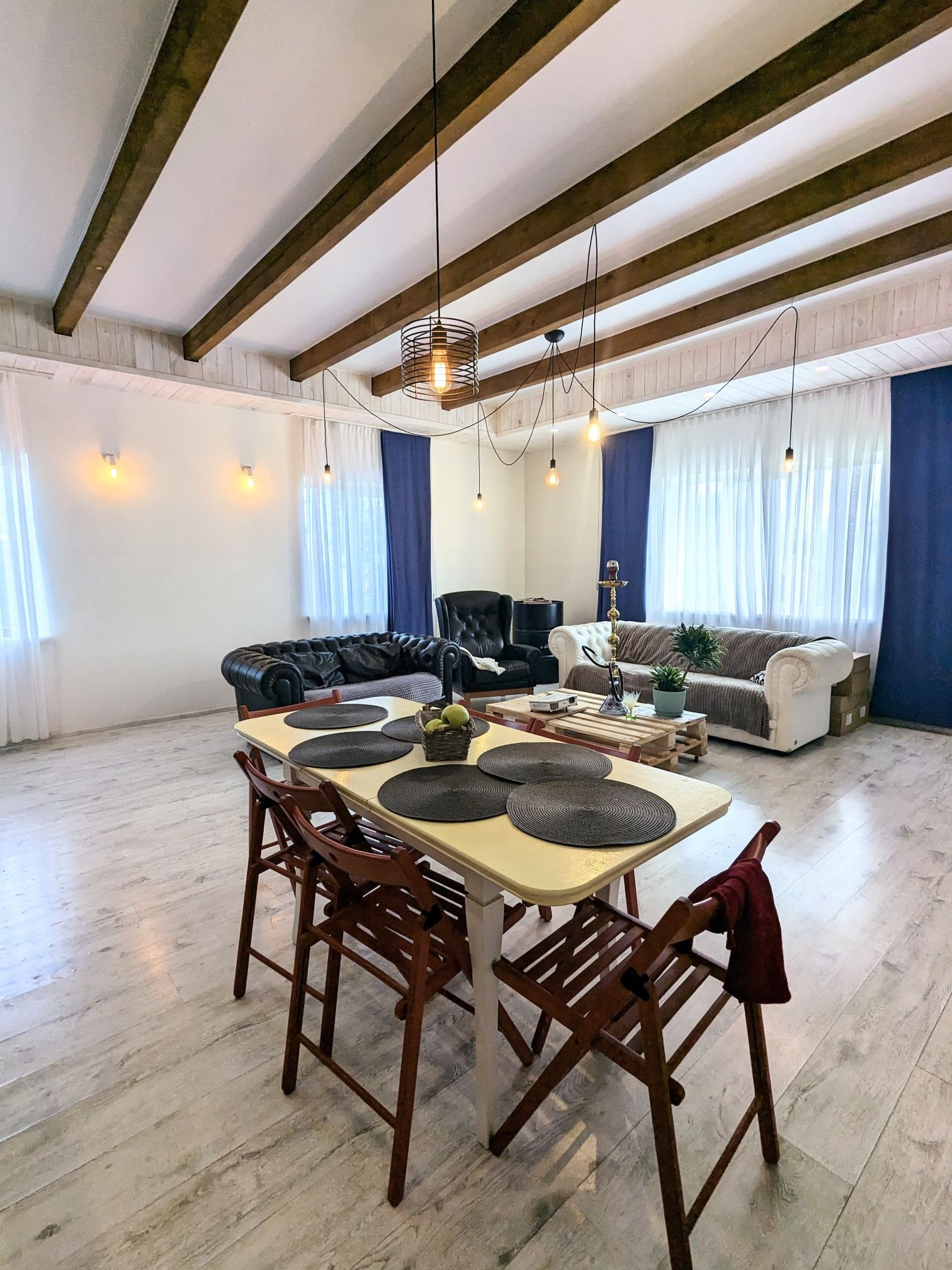На первом этаже расположены холл - 7,3 кв.м., санузел совмещённый - 8,5 кв.м и просторная кухня-гостинная 38,9 кв.м.. В кухне - гостинной выполненная дизайнерская отделка потолка в скандинавском стиле, с оформлением балок маслом цвета дуб и короба из дерева с подсветкой по периметру. Высота потолка между балок составляет 3,1 метра. Кухонный гарнитур длиной 4 метра выполнен из массива дуба со встроенной немецкой техникой (холодильник, посудомоечная машина, духовка со встроенной микроволновкой).