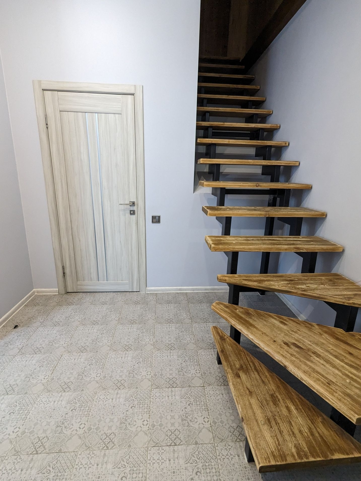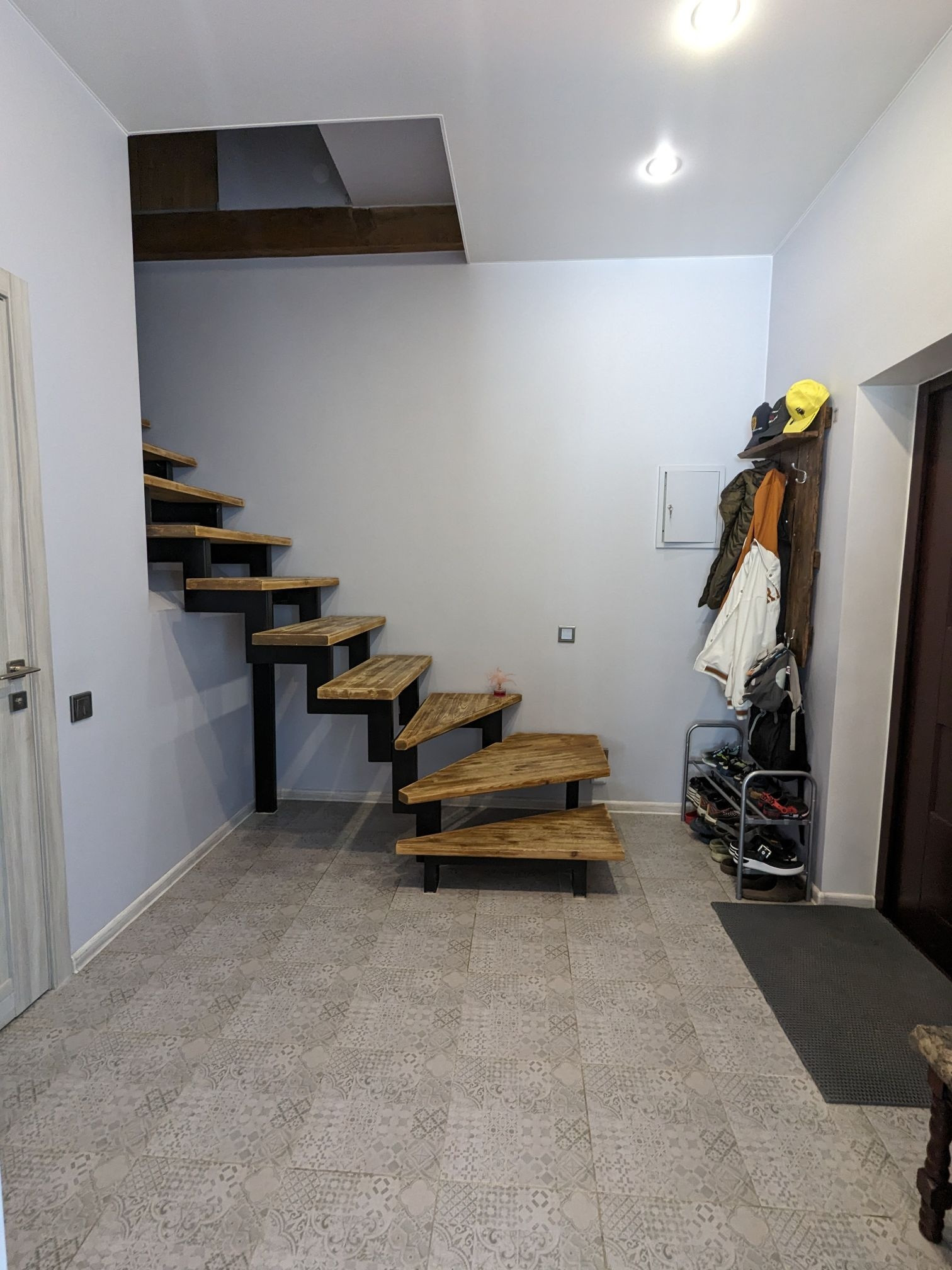 В холле лестница на металлическом основании с деревянными брашированнными ступенями.