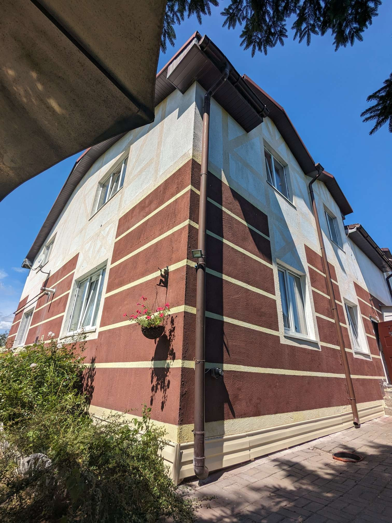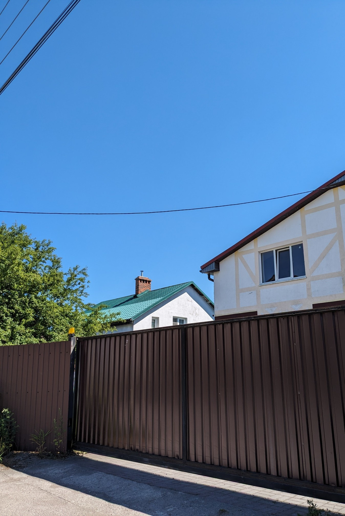 Вокруг дома выложена тротуарная плитка, имеется парковка внутри территории и электрические откатные ворота.