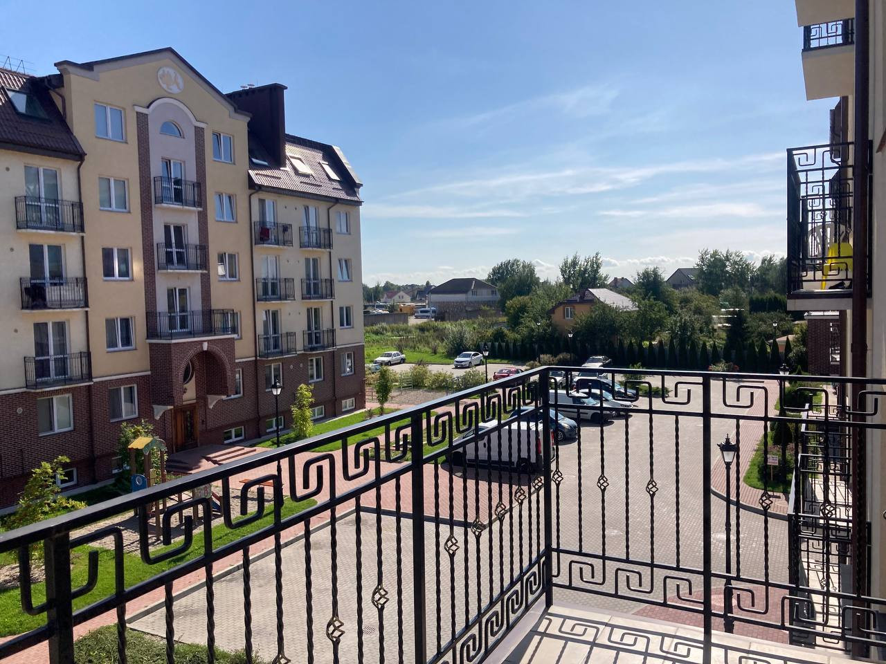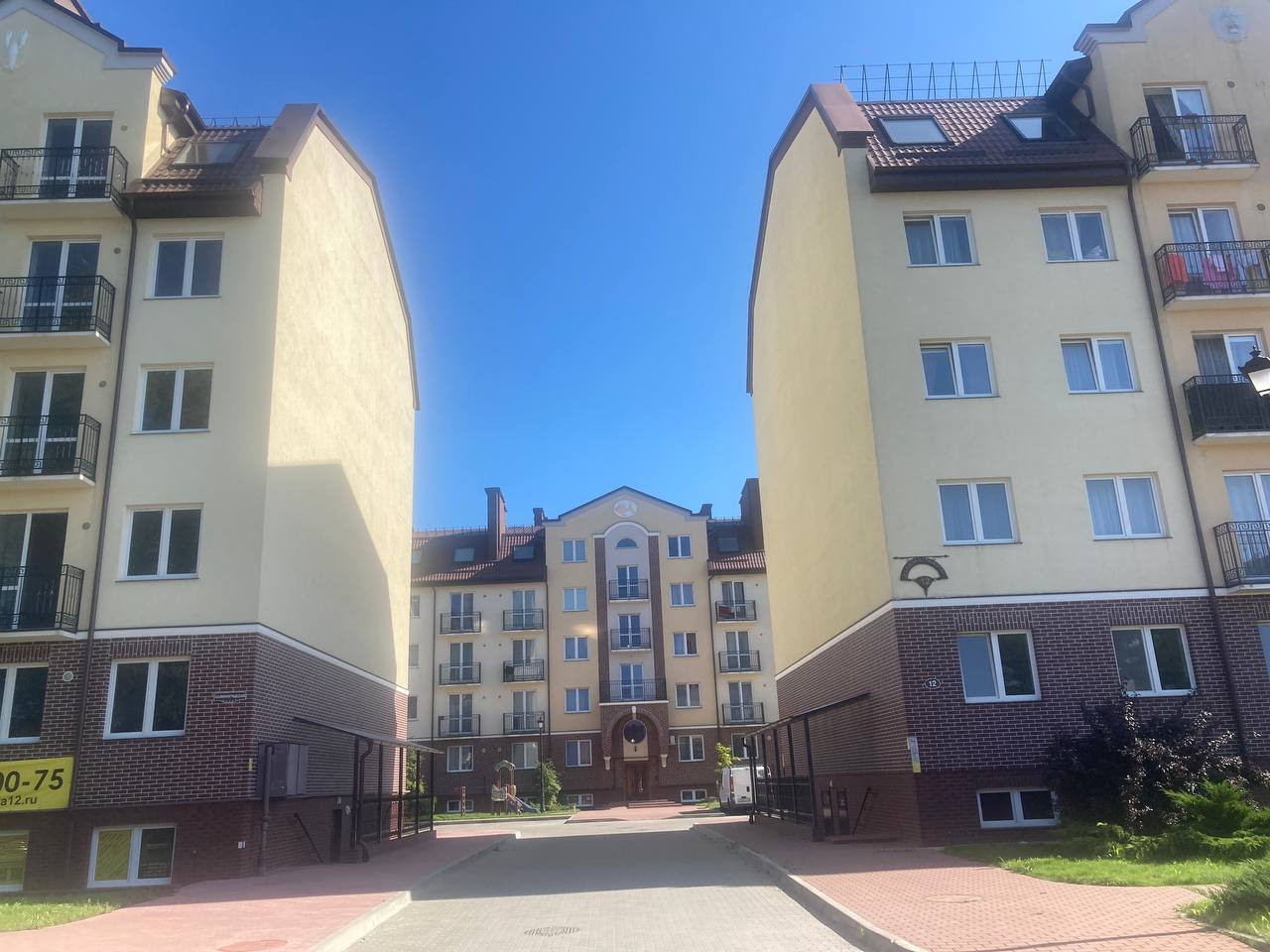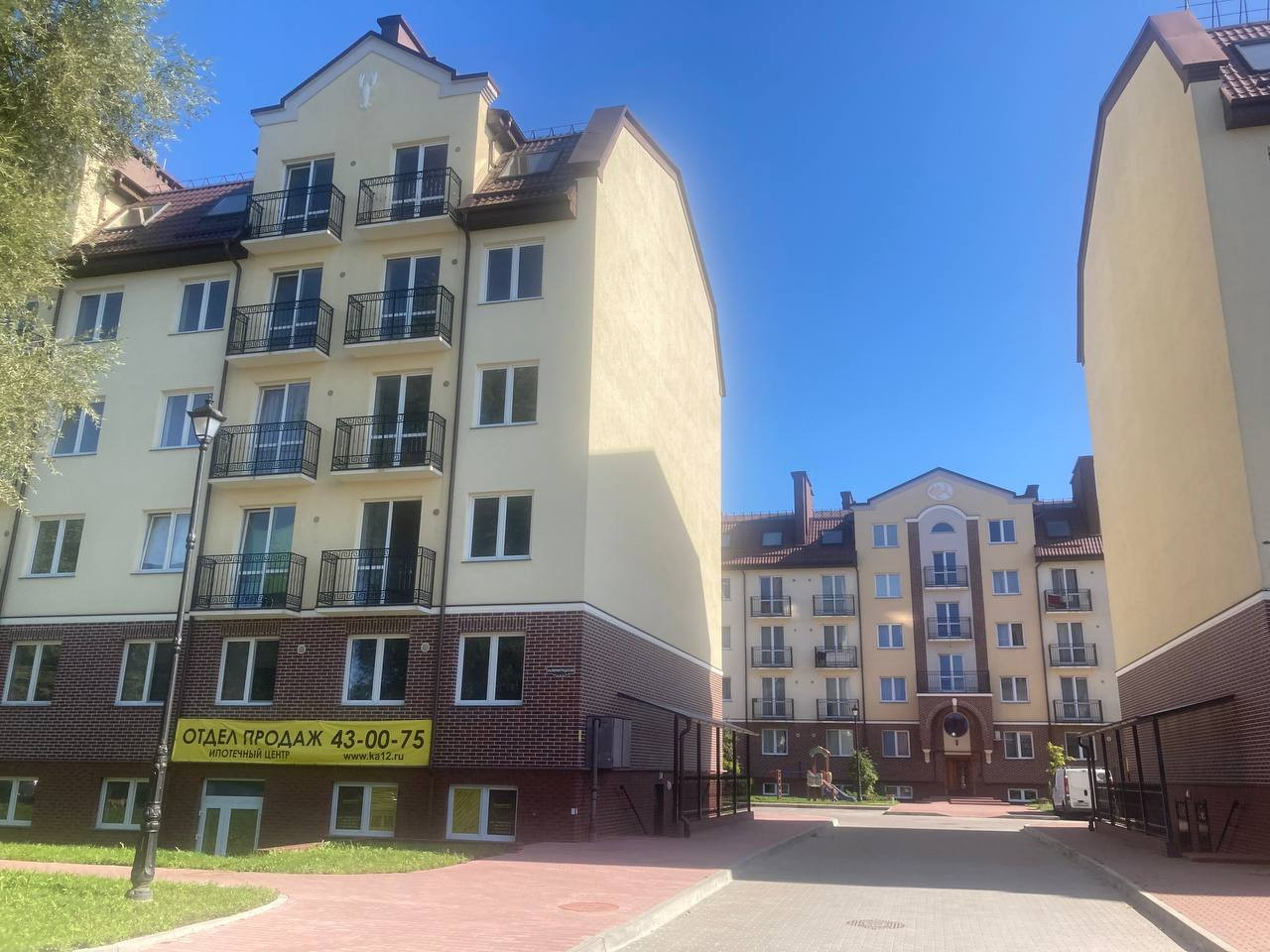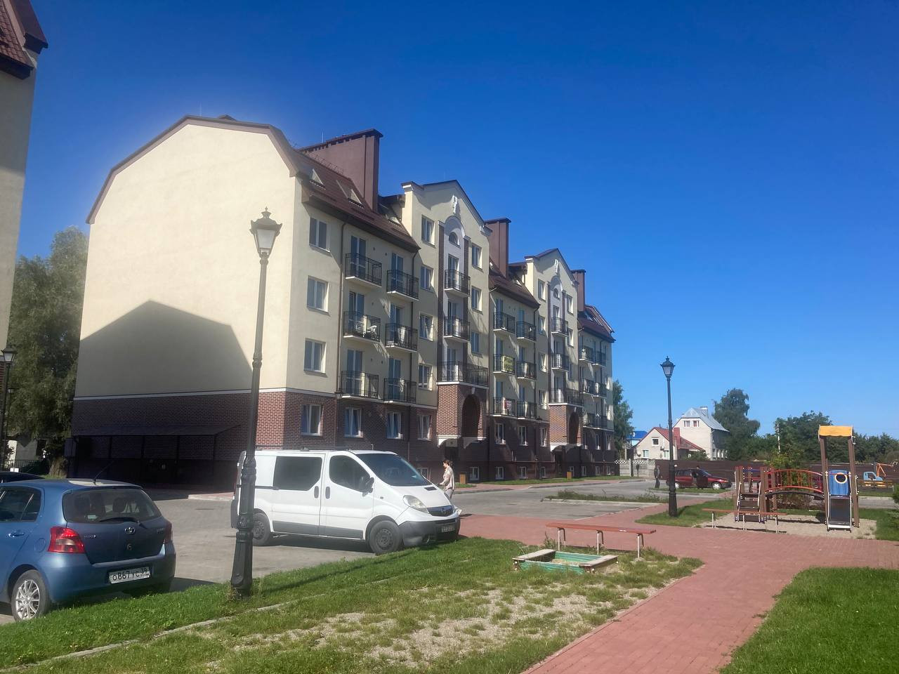 Во дворе детские и спортивные площадки, огромная парковка.