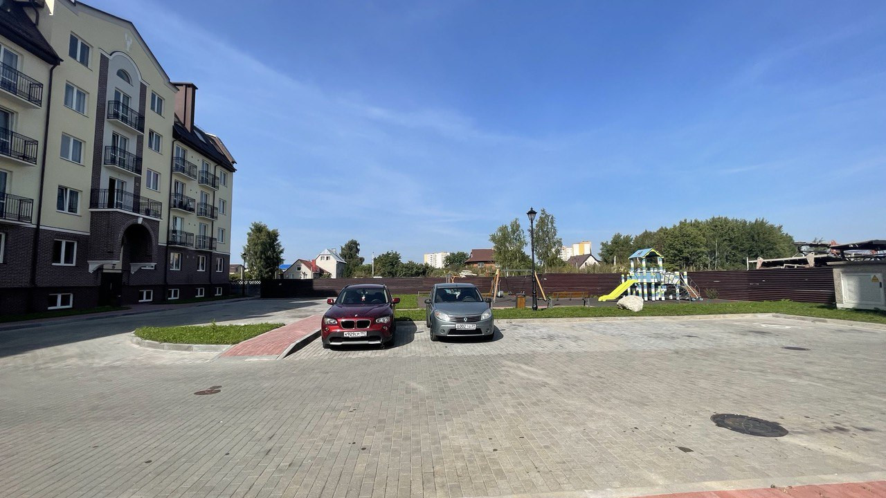 Во дворе детские и спортивные площадки, огромная парковка.