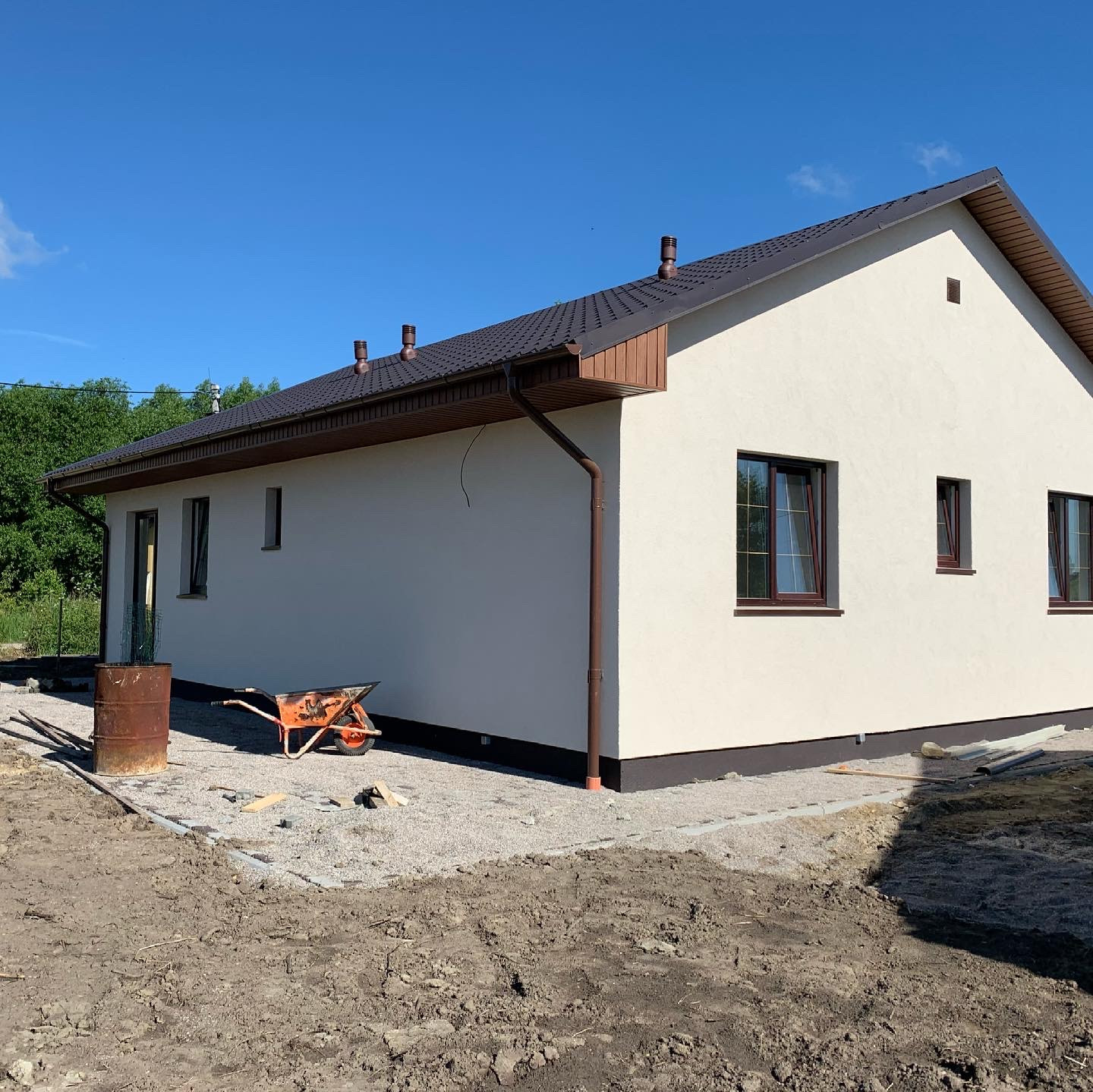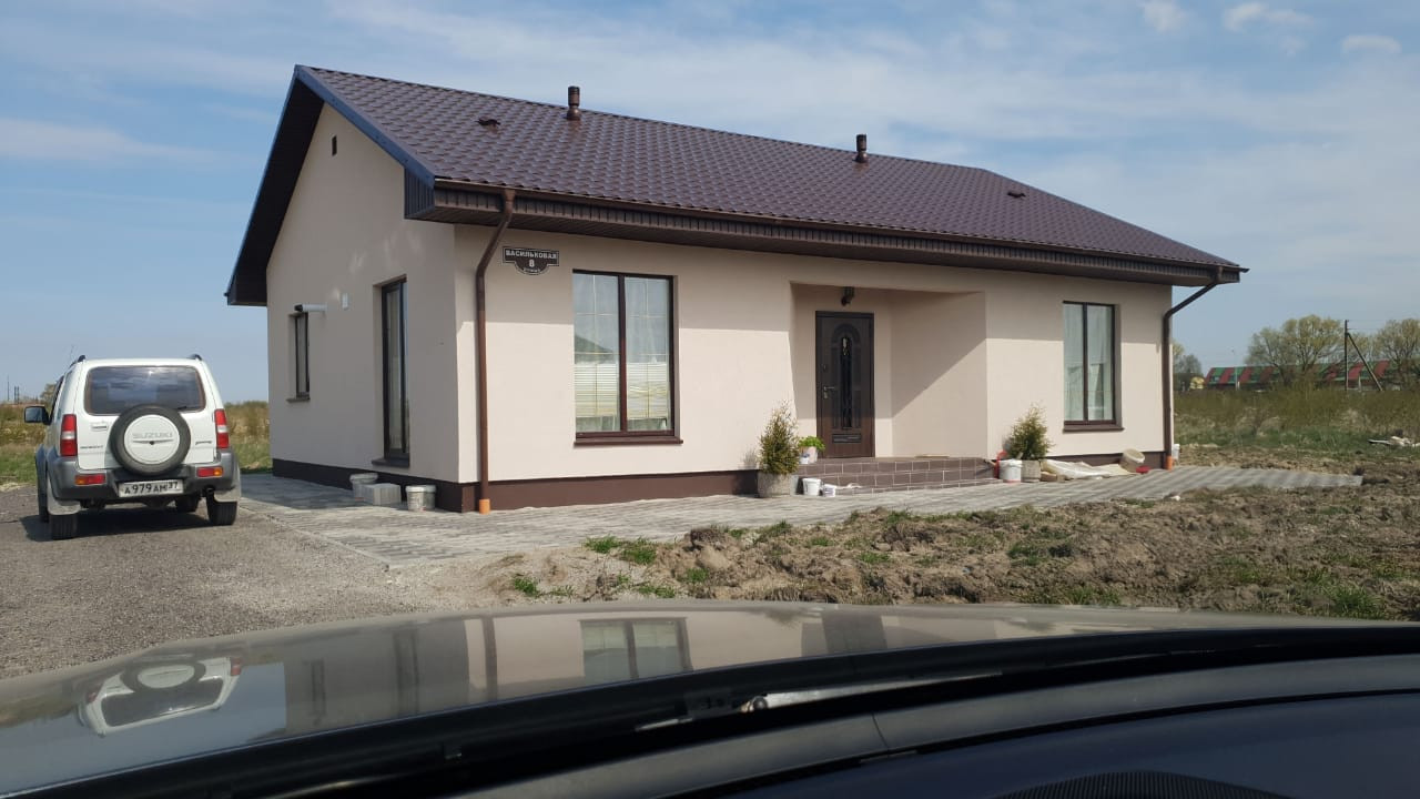 Вокруг дома выложена тротуарная плитка. Участок выровнен и завезена плодородная почва и засеян газонной травой.