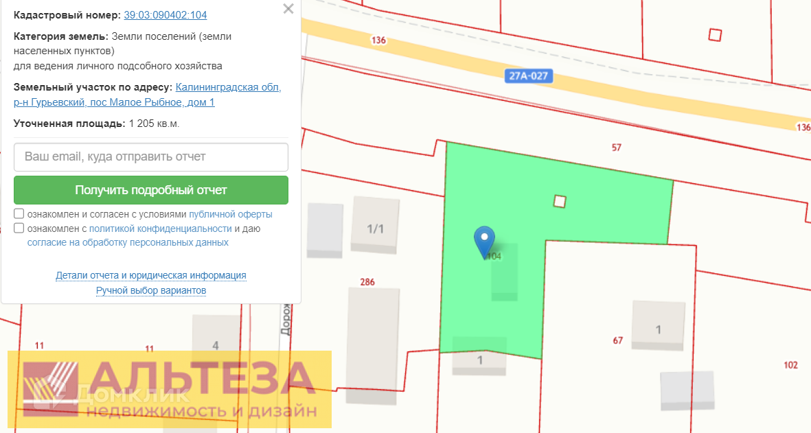 Земельный участок по адресу: Калининградская обл, р-н Гурьевский, пос Малое Рыбное, дом 1
