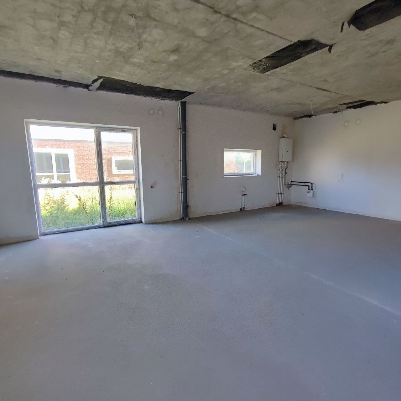 - 1 этaж: куxня-гоcтинaя 45 кв.м.с панорамным окнoм в пол и выходом на участoк, гocтевoй caнузел и гараж. При желании можно кухню выделить в отдельное помещение. Сделаны выводы под камин. Гараж оснащен автоматическими воротами.