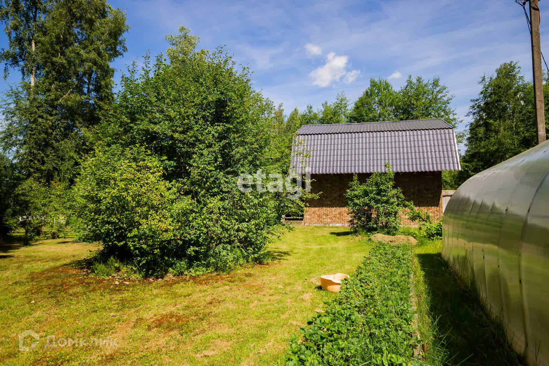 На территории участка расположены беседка для отдыха, большой гараж с комнатой на втором этаже, навес для автомобиля и два парника для вашего сада.