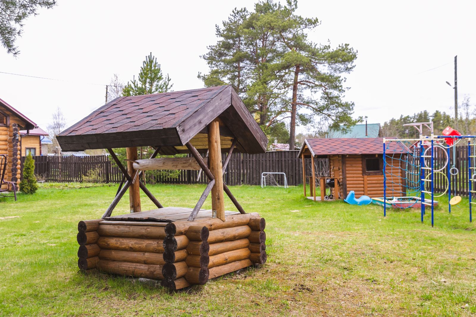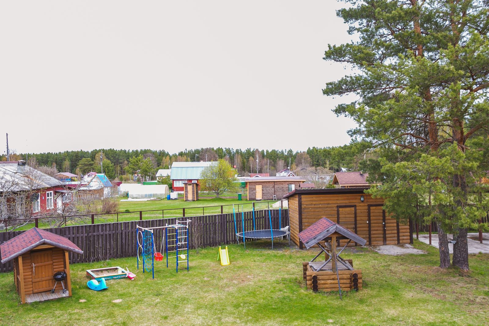 Детская игровая площадка с домиком, батутом, горкой.