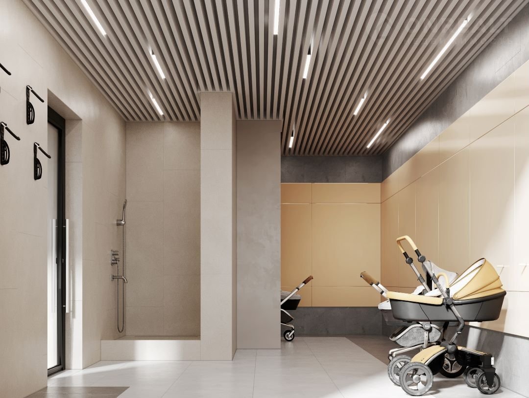 - В каждом лобби спроектированы общественный санузел, мягкая зона для комфортного ожидания курьера или такси, предусмотрены отдельные помещения для хранения колясок, велосипедов и самокатов, а также помещения для мойки лап собакам