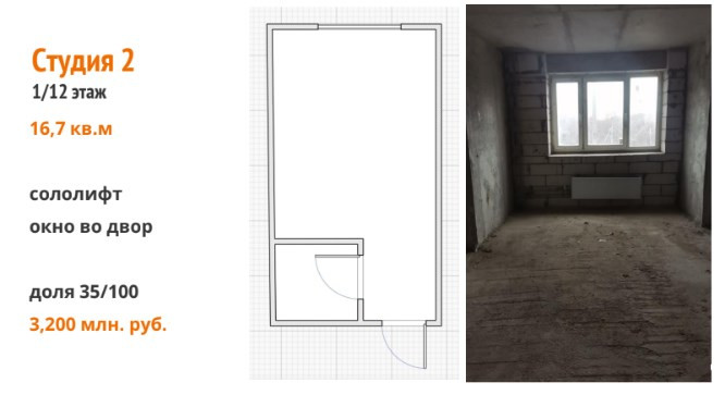 О студии: 17 м2 Совмещенный санузел, окно- пластик выходит во двор. Квартира на 1 этаже, Состояние: состояние среднее, чистая, требуется ремонт. В стоимость студии входит: установка добротной входной металлической двери, установка приборов учета на воду и свет, качественный ремонт в коридоре, заведение всех коммуникаций в студию.