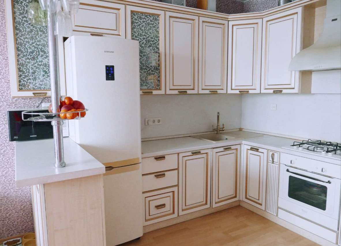 Просторная кухня-гостиная 21кв.м., кухонный гарнитур из массива дерева, плита и духовка газовые, посудомоечная машина Electrolux, холодильник Samsung. Установлен качественный мембранный фильтр для питьевой воды.
