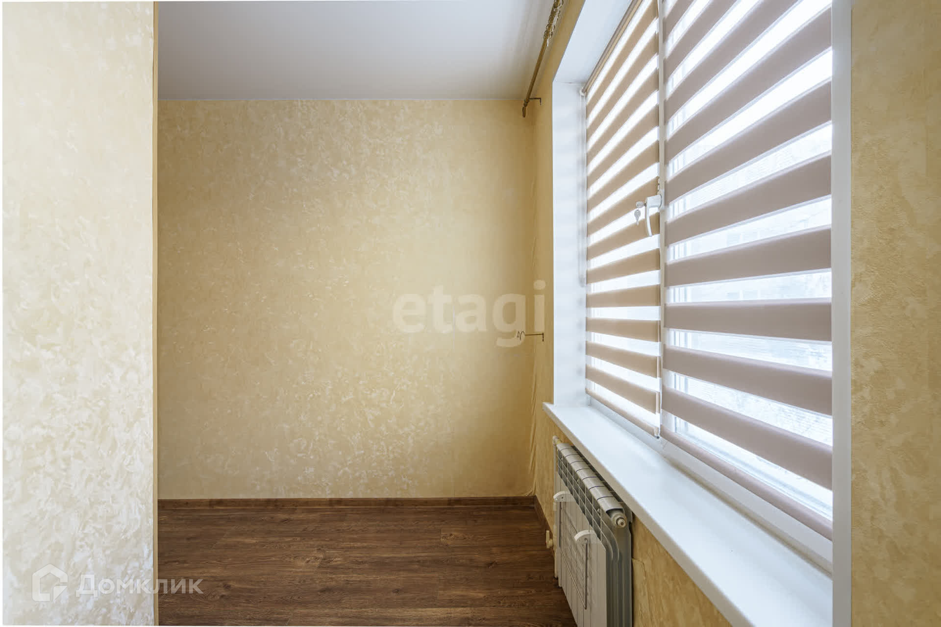 Большая застекленная лоджия имеет два выхода: со стороны кухни и комнаты. Нижняя часть остекления лоджии затонирована.