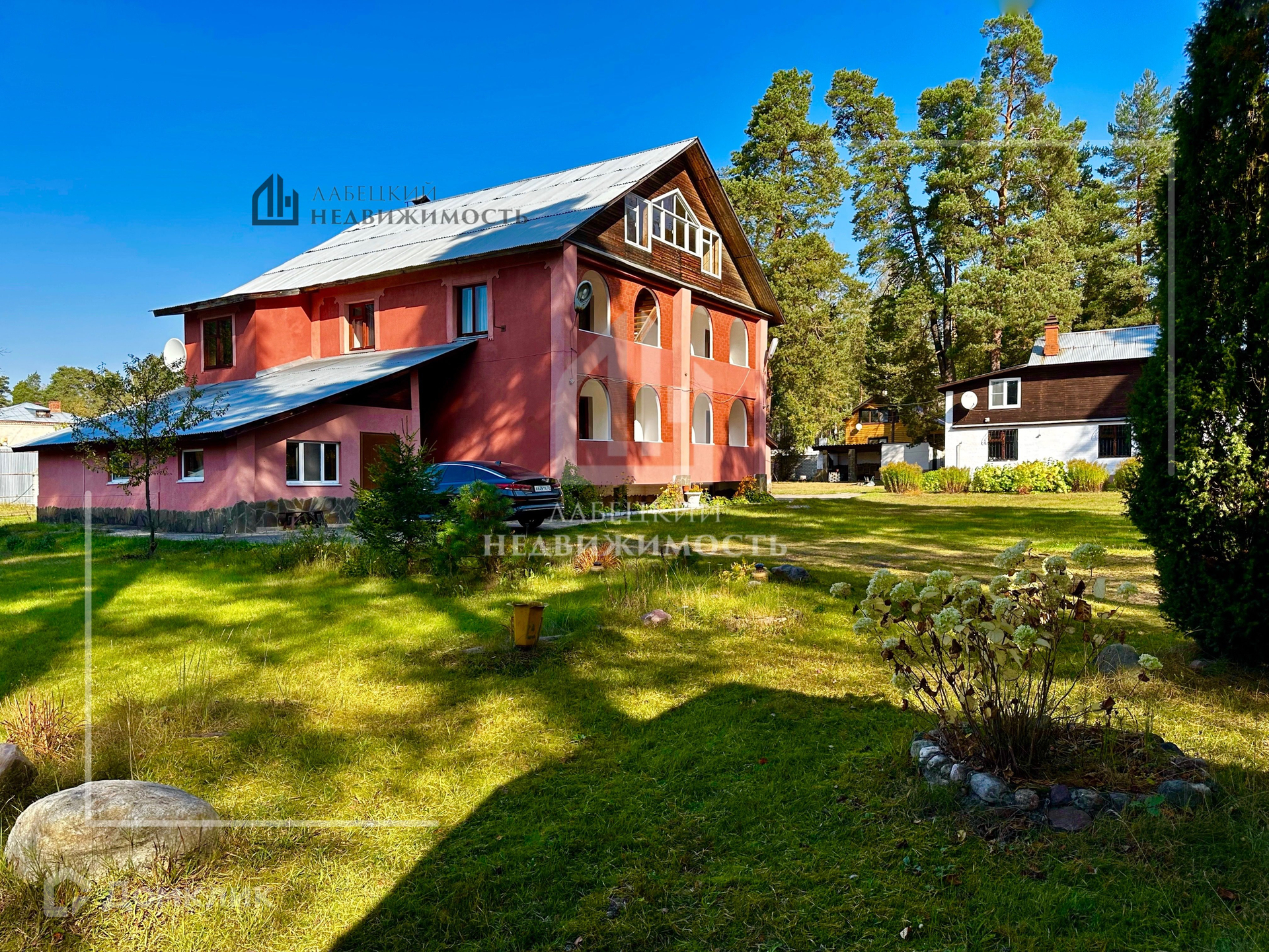Дом зарегистрирован на 2-х участках соснового бора площадью  30.65 соток.   На территории есть плодовые деревья и кустарники, вековые сосны, чайный домик, баня. Сам участок правильной формы, ровный, сухой с ухоженным газоном и красивыми цветами. По периметру капитальный забор.