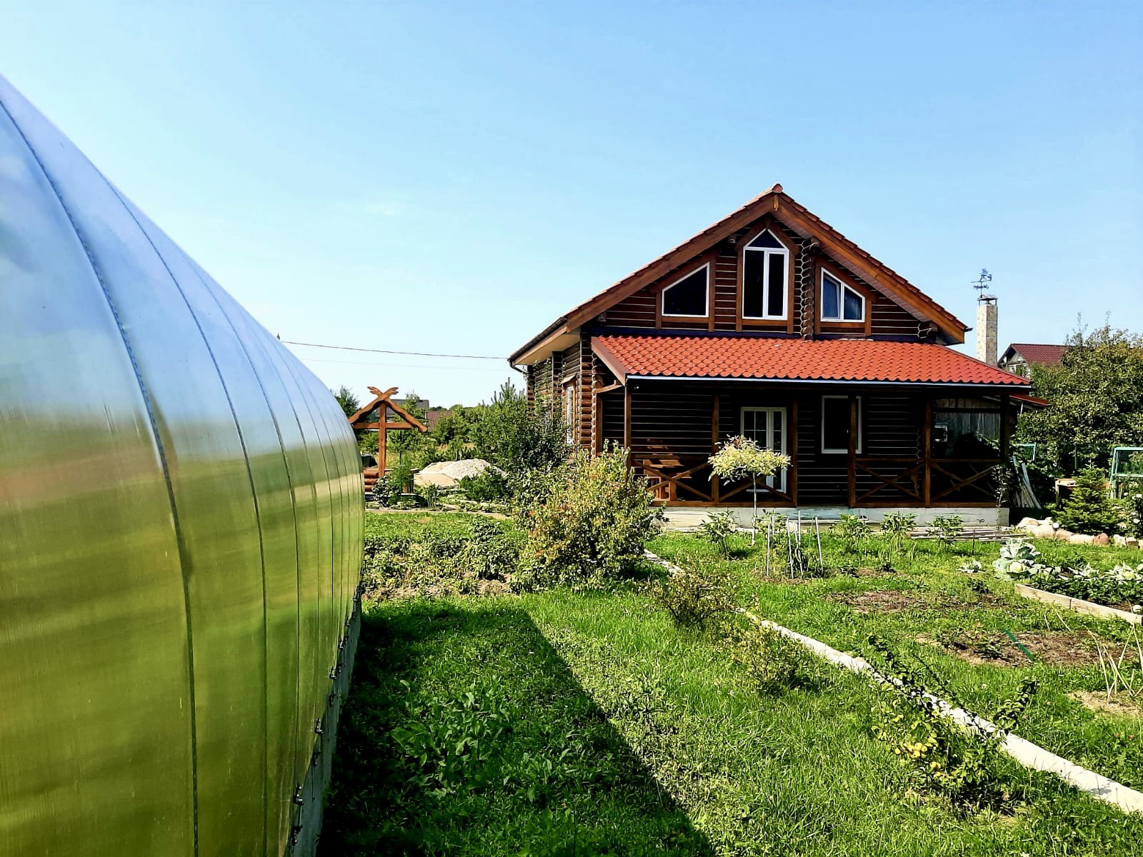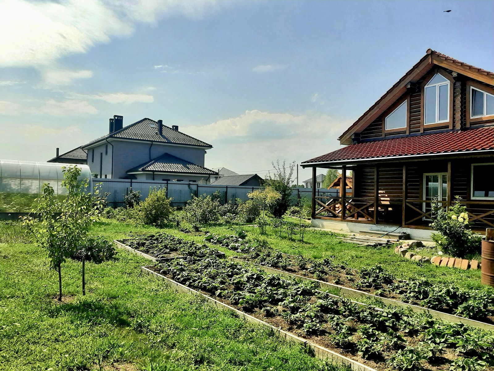 Ухоженный участок с фруктовыми деревьями и кустарниками. Есть теплица.