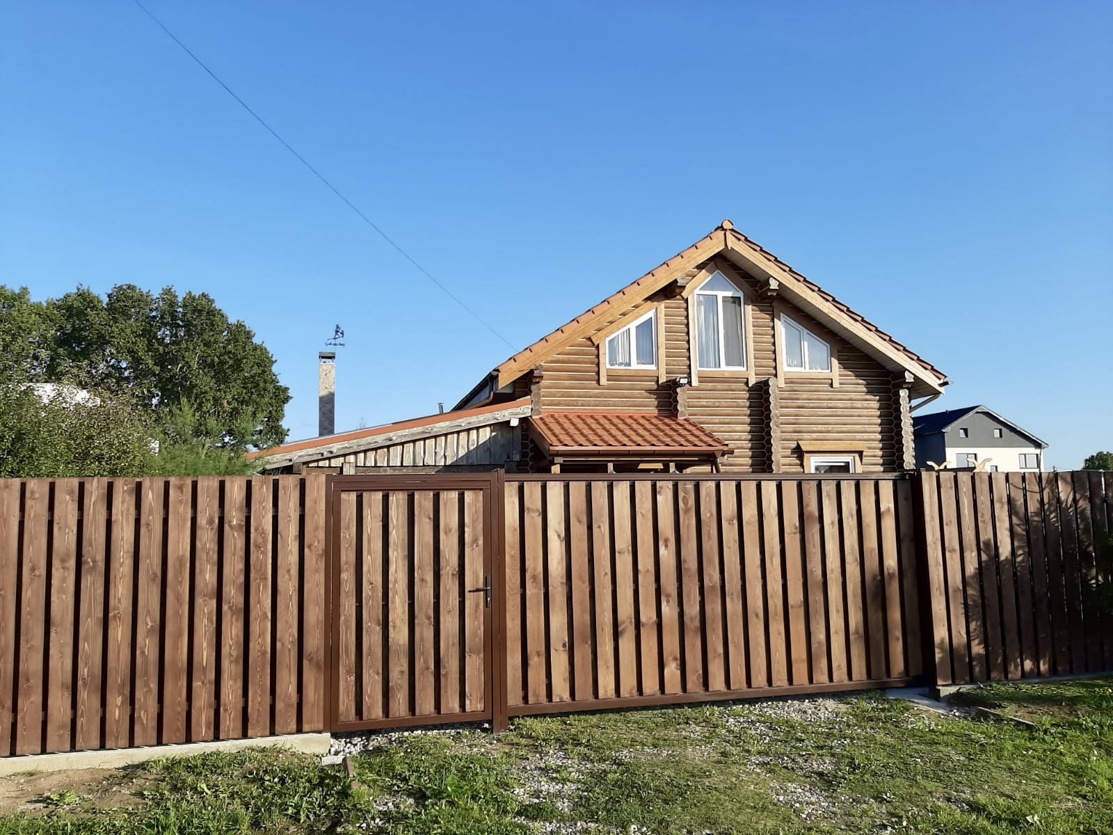 Территория дома огорожена. Два заезда на участок, с откатными воротами.