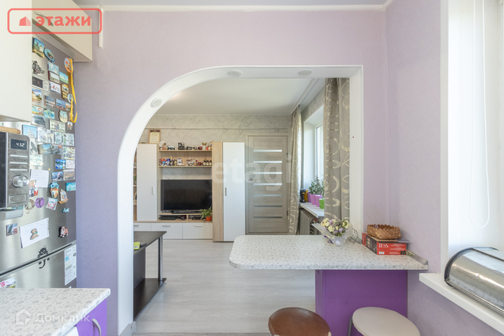 В результате допустимой перепланировки зона кухни через арочное пространство была удобно объединена с гостиной, что благоприятно отразилось на функциональности самой квартиры, позволило использовать коридорное пространство под размещение холодильника, увеличить обеденную зону и вместимость кухни. Несущие перегородки не затронуты.