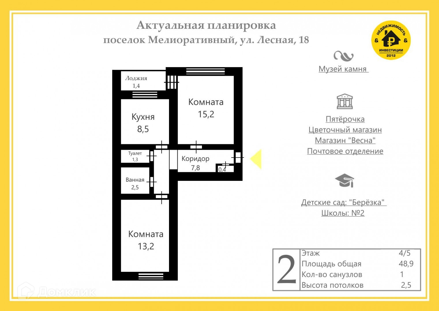 2-комнатная квартира, 48.9 м2, этаж 4 / 5, на продажу в посёлке Мелиоративном, Лесная улица, 18