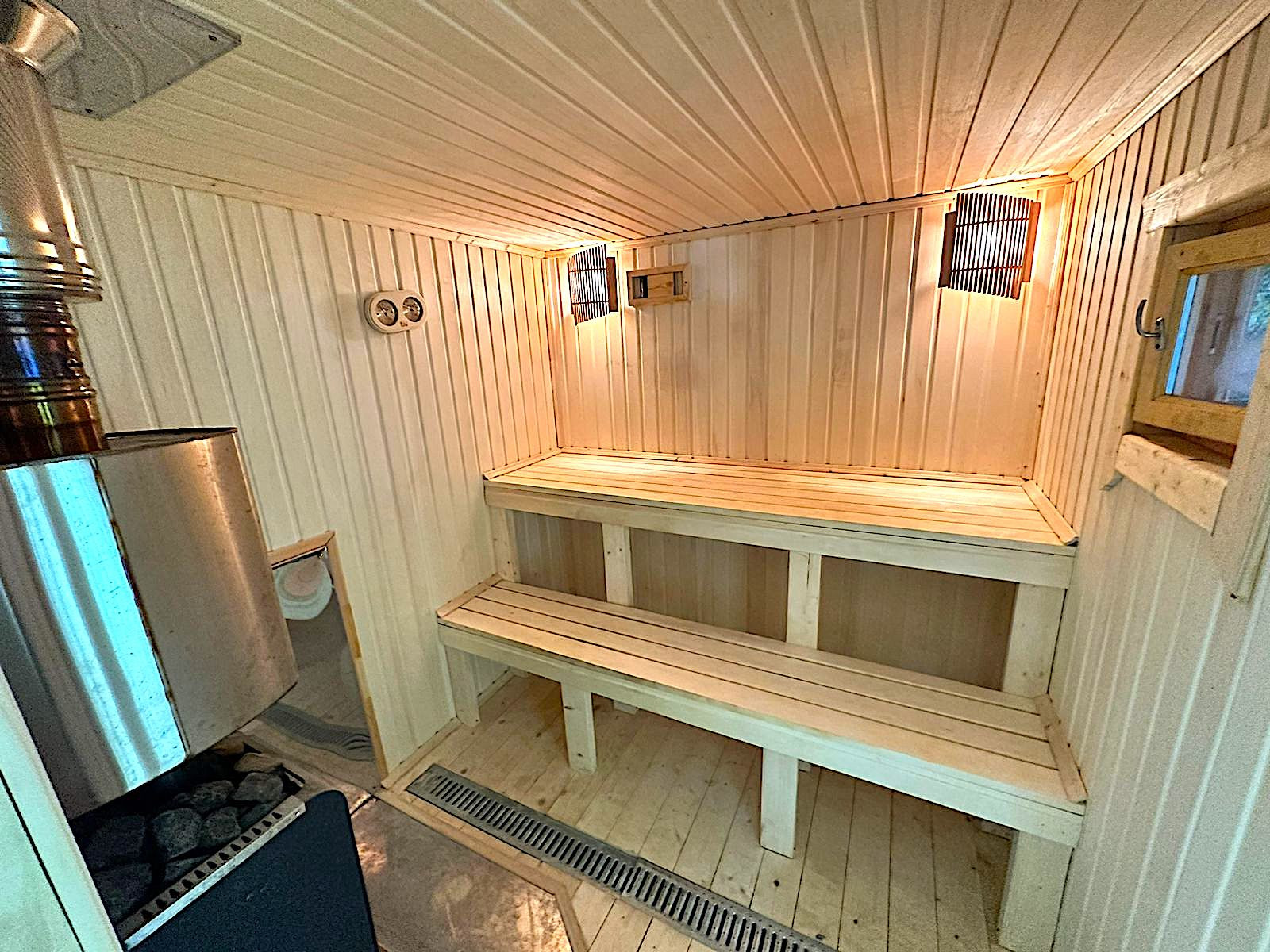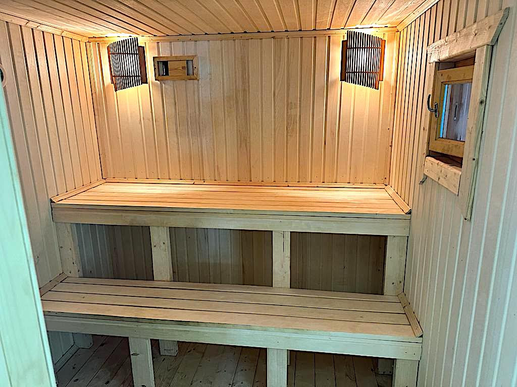 Размер бани 3,5х8 = 28 кв.м., стены - брус 100х150 мм, двухскатная кровля – металлочерепица, печь – «Ермак 16 ПС». Веранда 3х8 = 24 кв.м., полы – террасная доска.