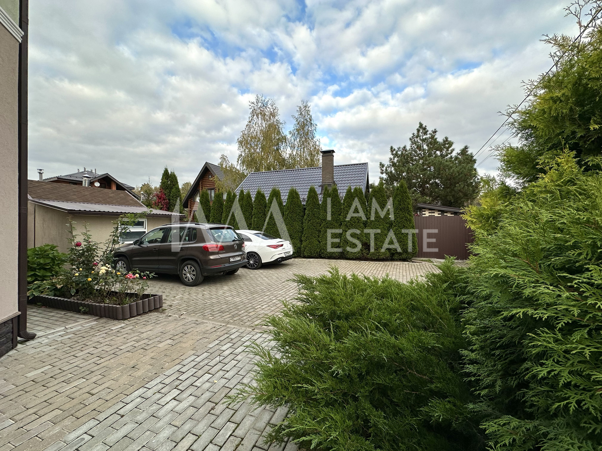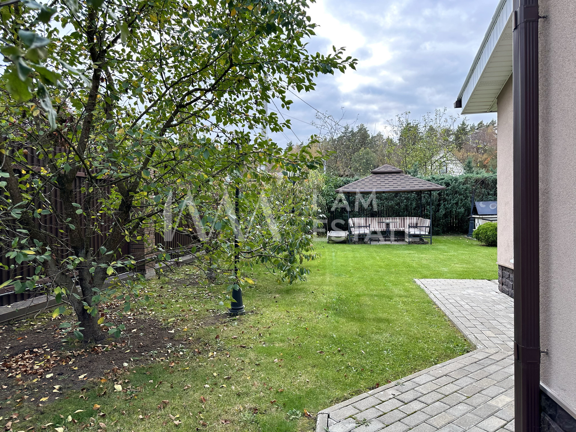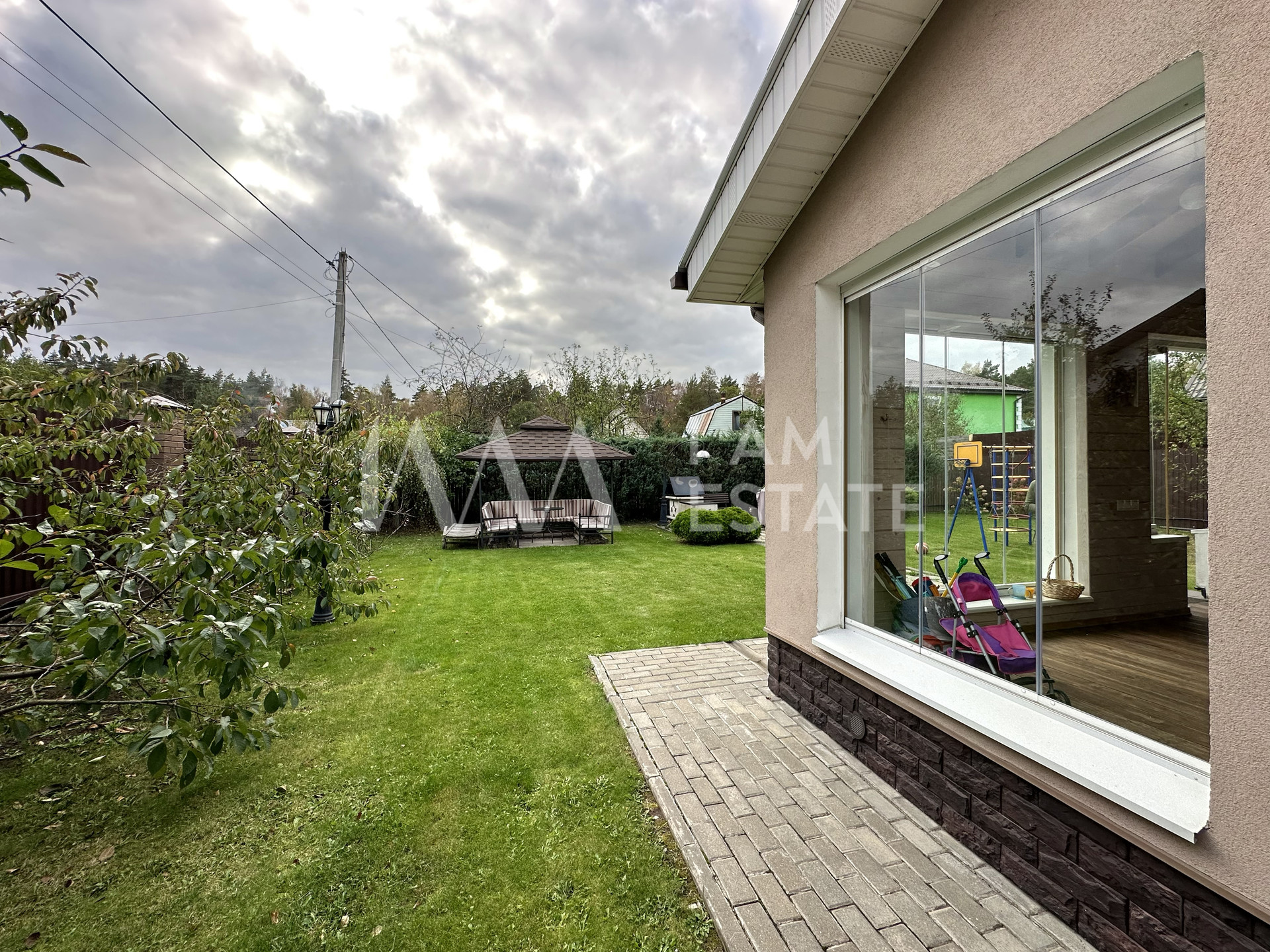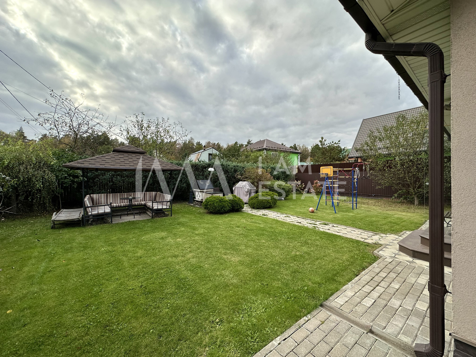 Придомовая территория ухожена, ландшафт ровный, высажены растения и деревья. Есть закрытая беседка, детская площадка, а также площадка для двух автомобилей.