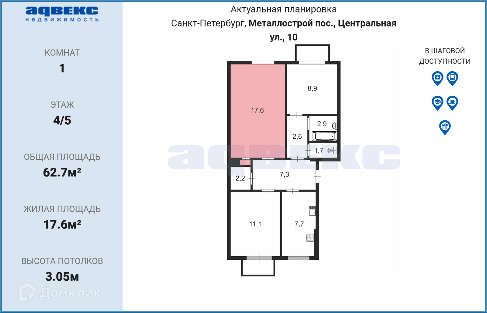 Общая площадь 62.7 м2