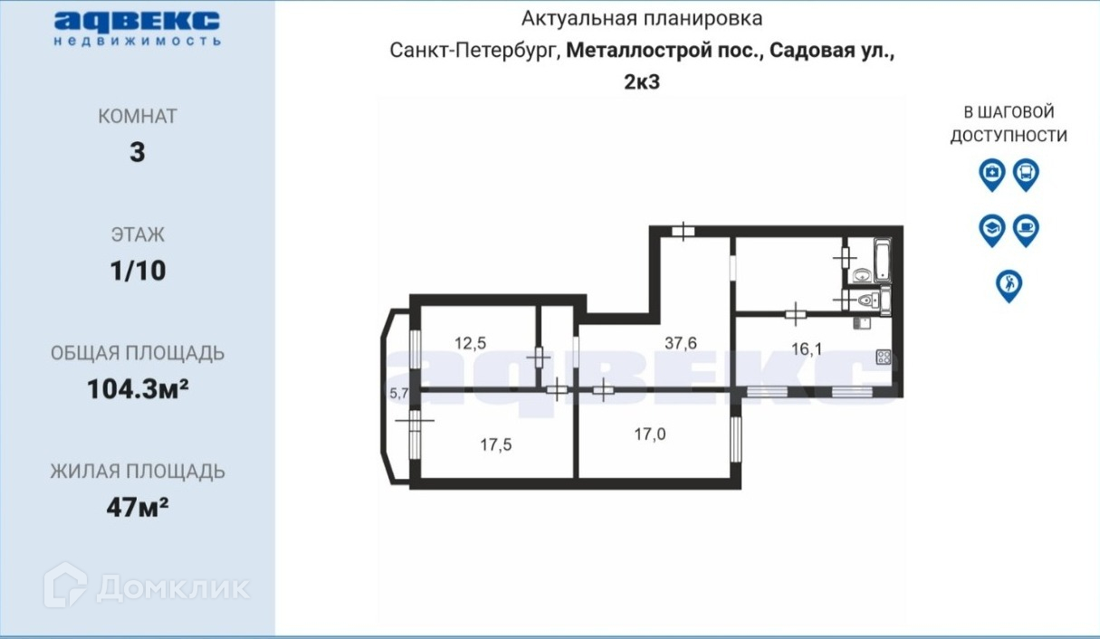 3-комнатная квартира, 104.3 м2, этаж 1 / 10, на продажу в посёлке Металлострой, Садовая улица, 2к3