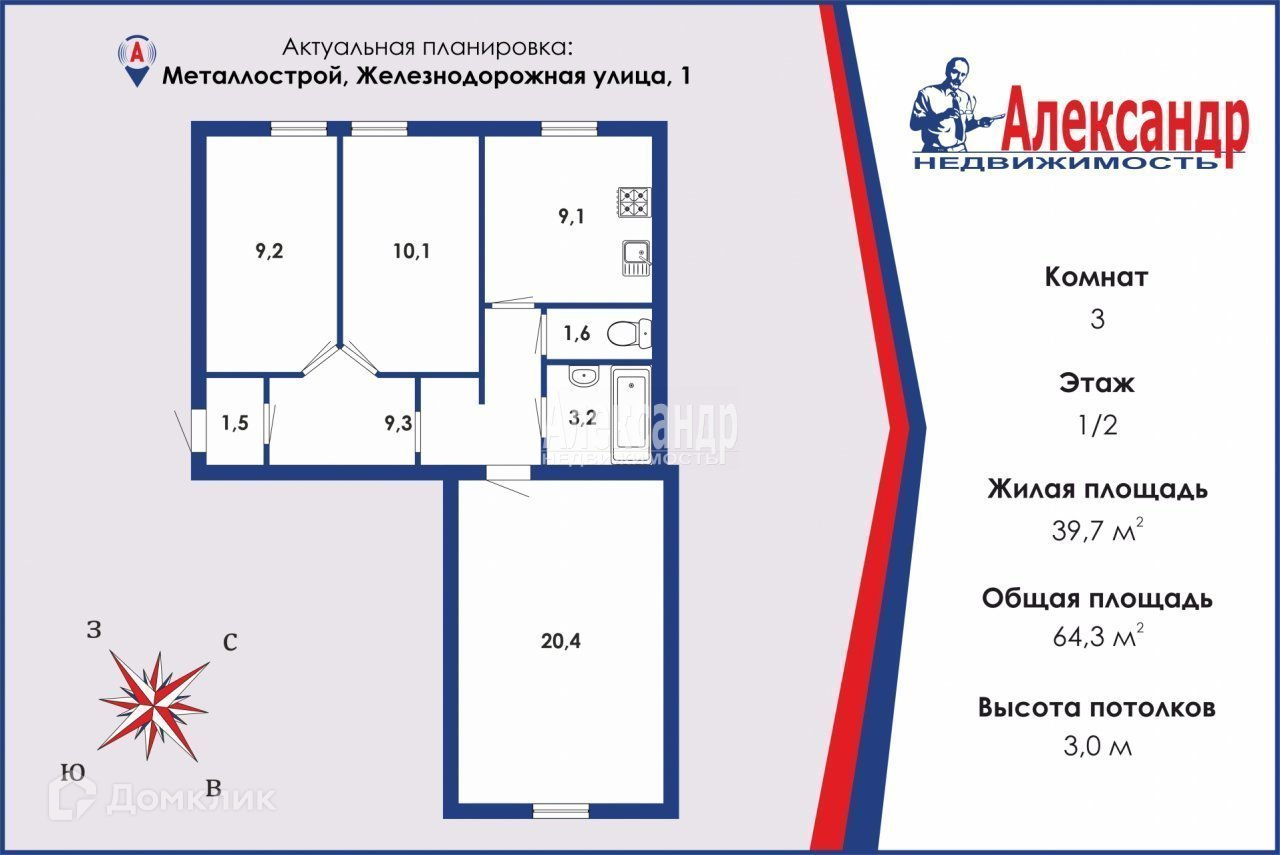 3-комнатная квартира, 64.3 м2, этаж 1 / 2, на продажу в посёлке Металлострой, Железнодорожная улица, 1