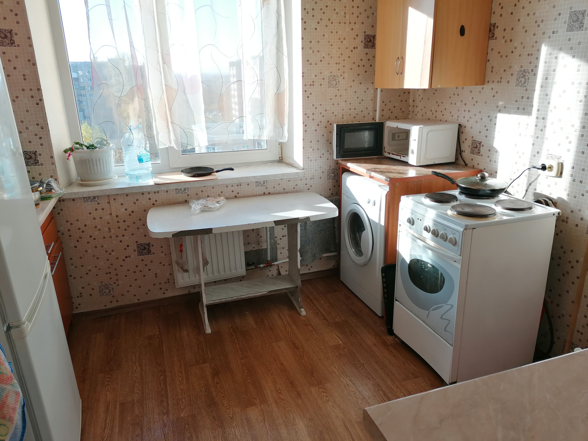 Мебель:кухонные шкаф и стол-тумба, обеденный стол,шкаф,кровать двухспальная.Бытовая техника:холодильник,стиральная машина.