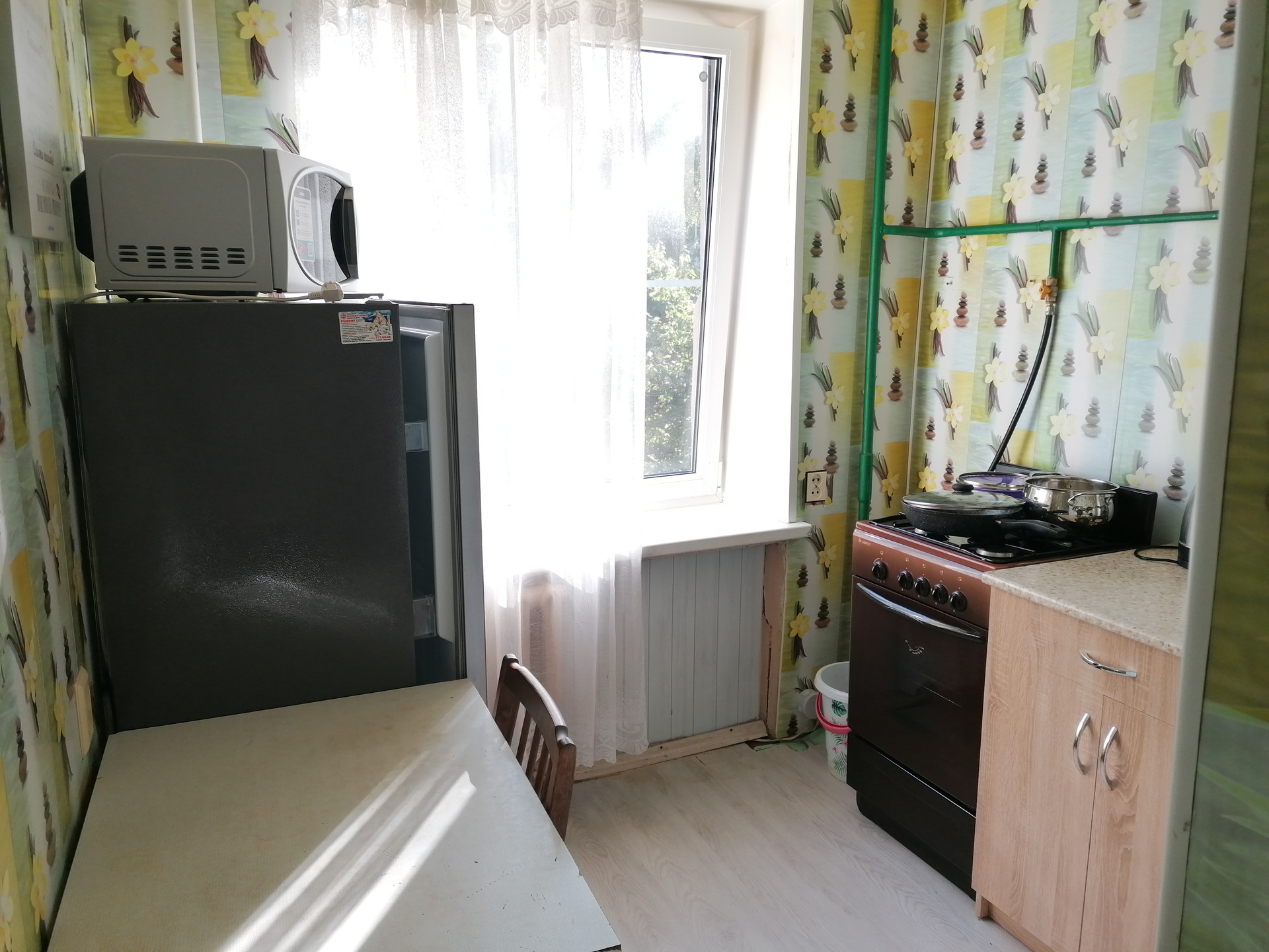 Есть вся необходимая мебель и бытовая техника:кухонная мебель,стенка,шкаф,столы,2 дивана,детская кровать,холодильник,стиральная машина,телевизор,микроволновая печь.