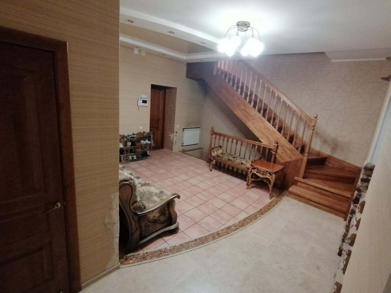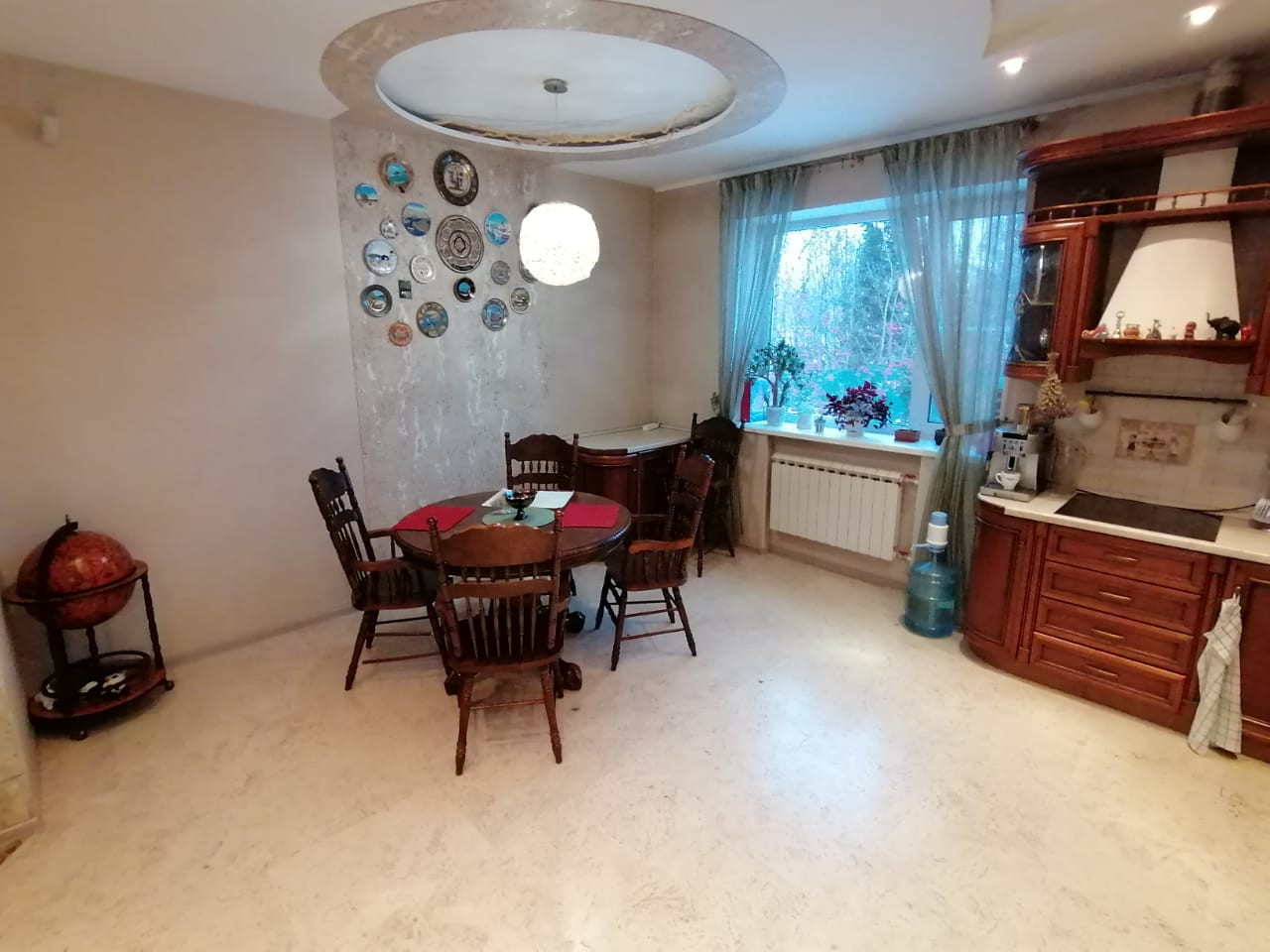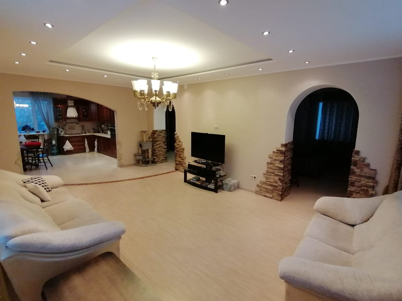 1 этаж: холл, кухня-столовая, гостиная, санузел (теплый пол, душевая кабина), гардеробная, комната для гостей, гараж на 2 машины и комнатой для хранения колес, комната свободного назначения с выходом во двор (встроенные шкаф-купе и шкаф с полками).