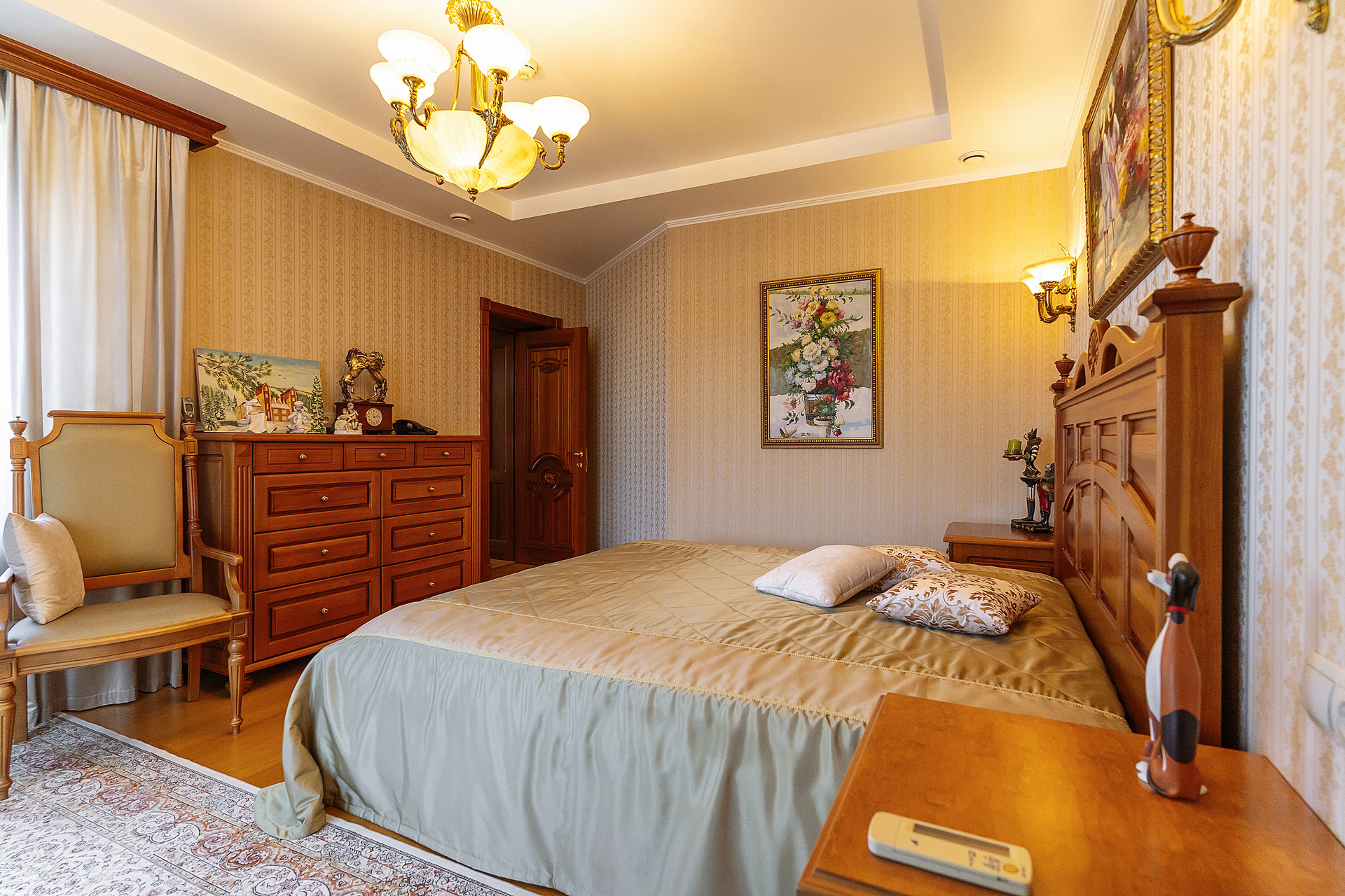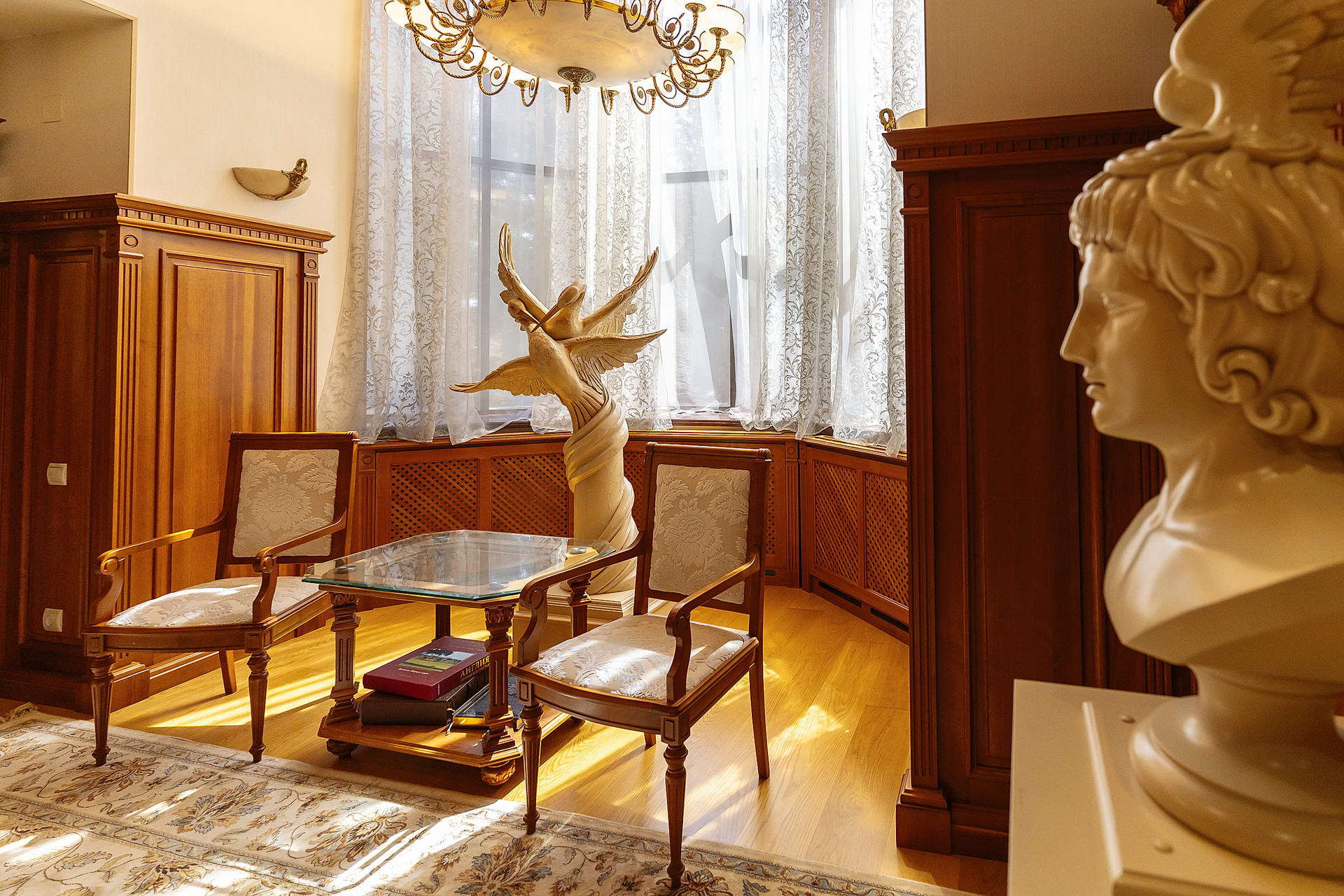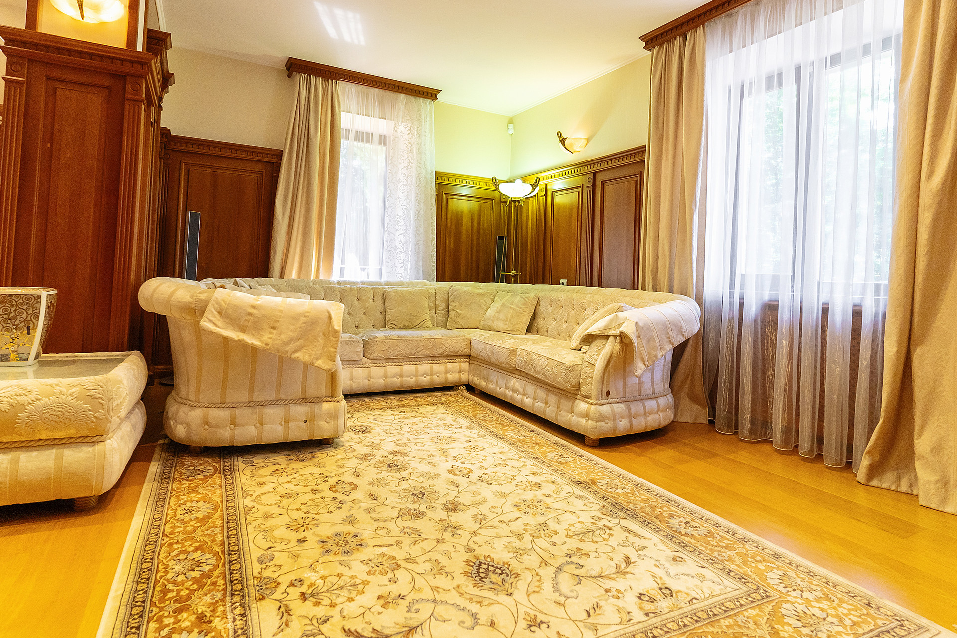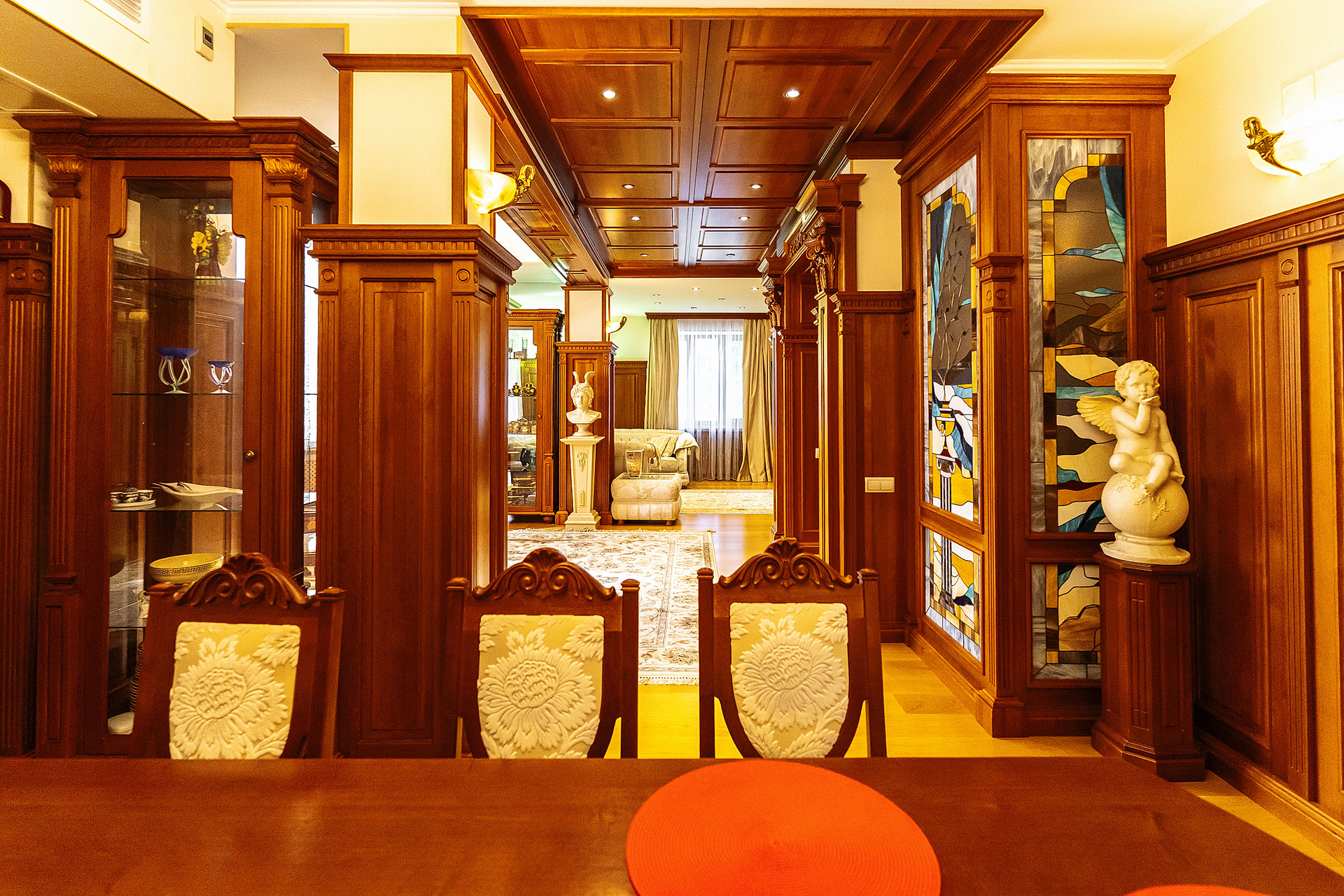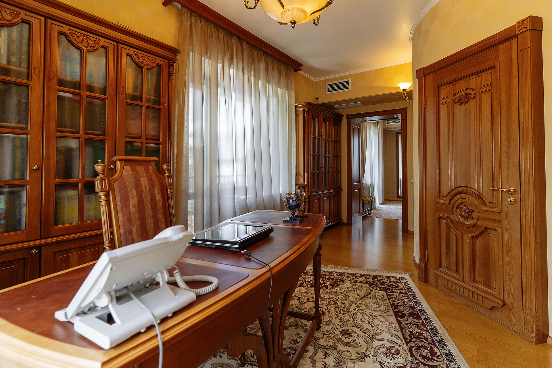 Вся мебель в доме выполнена по индивидуальным эскизам из дорогих пород дерева, вписана в интерьер известным дизайнером.