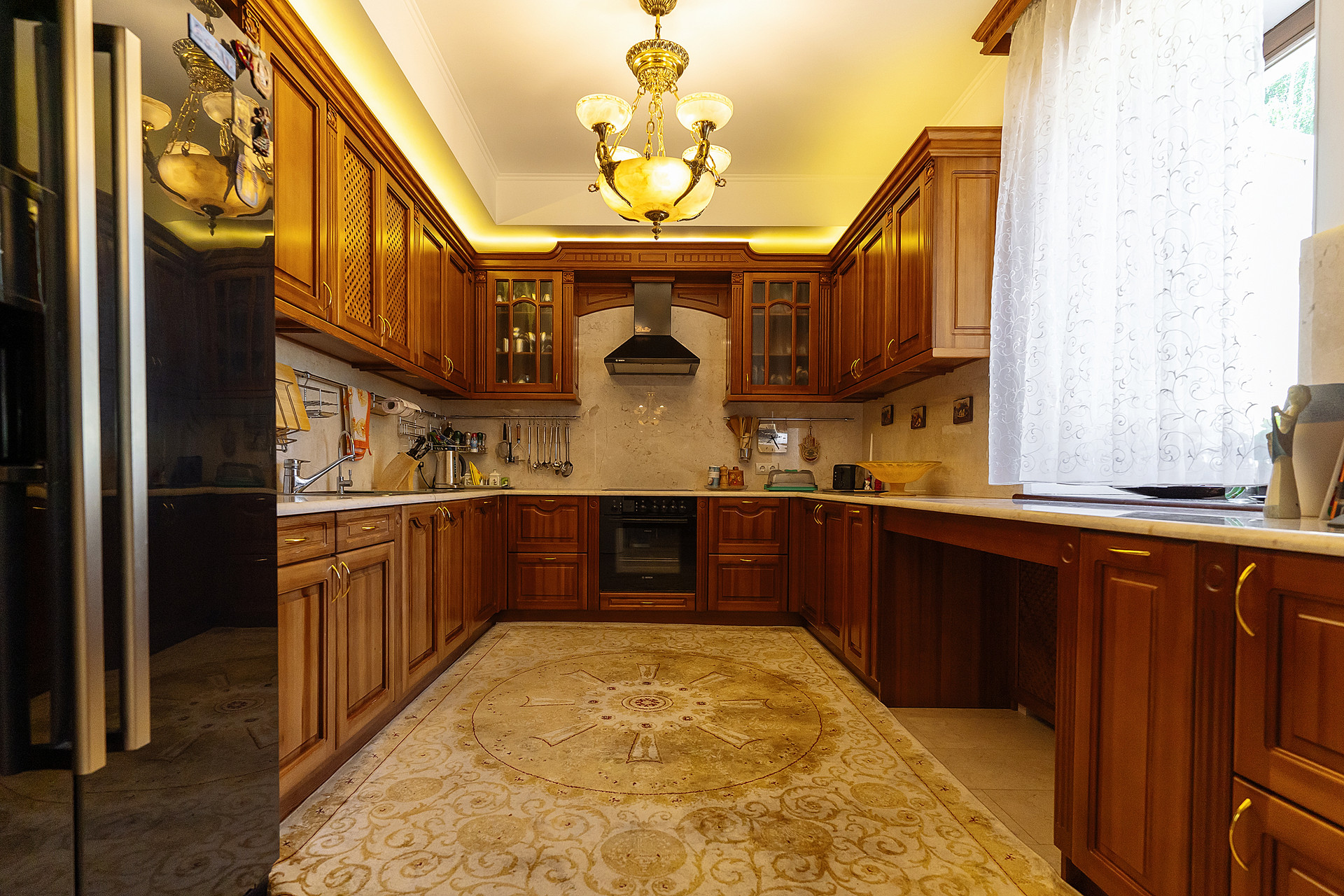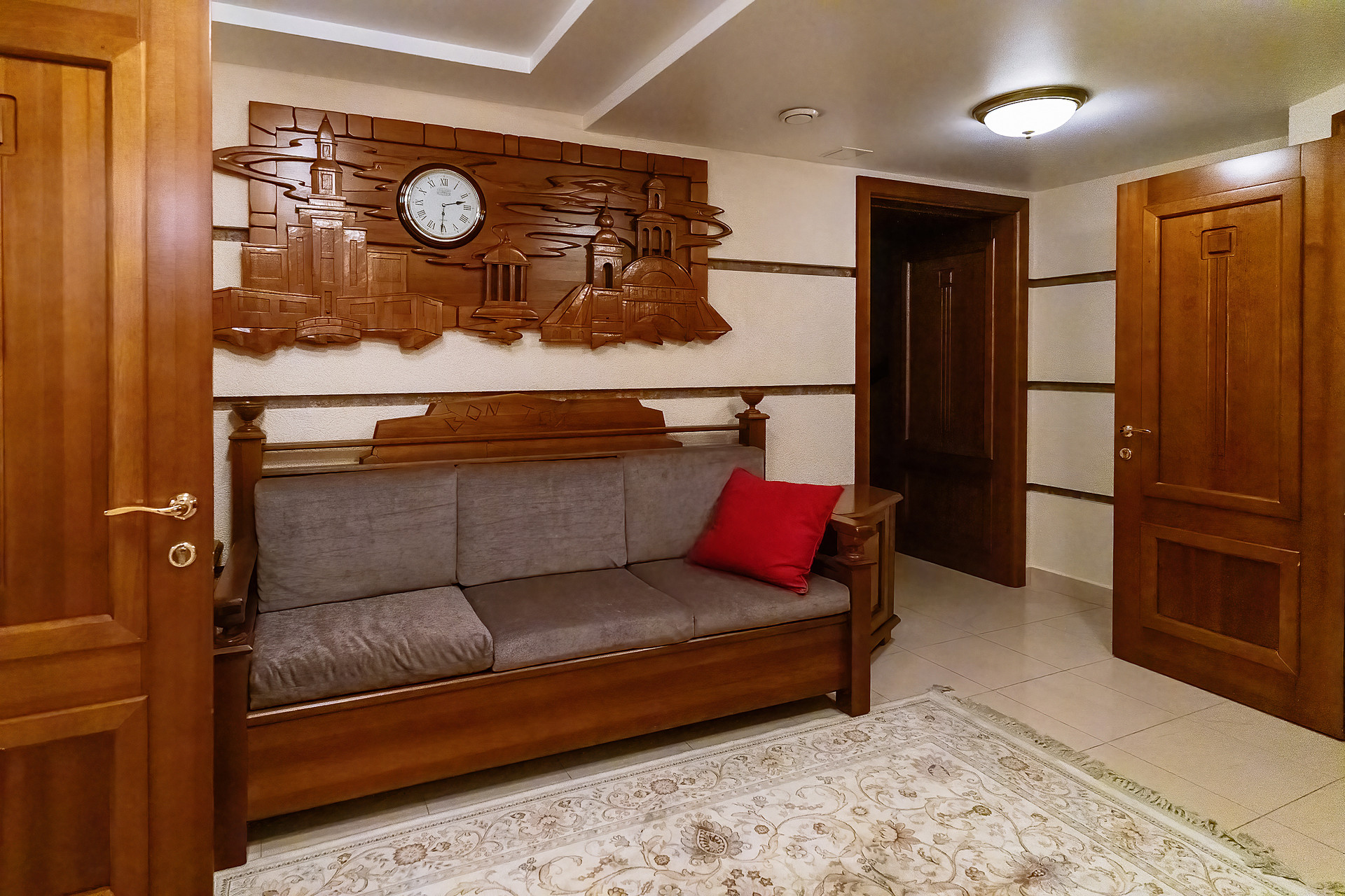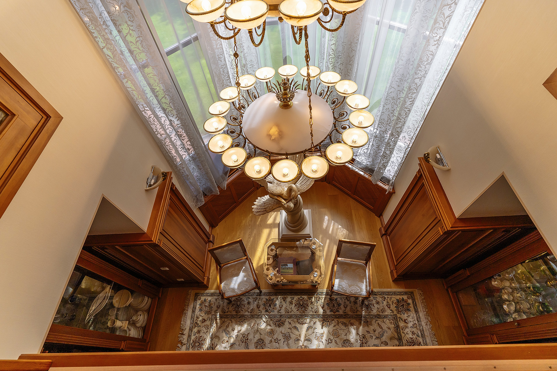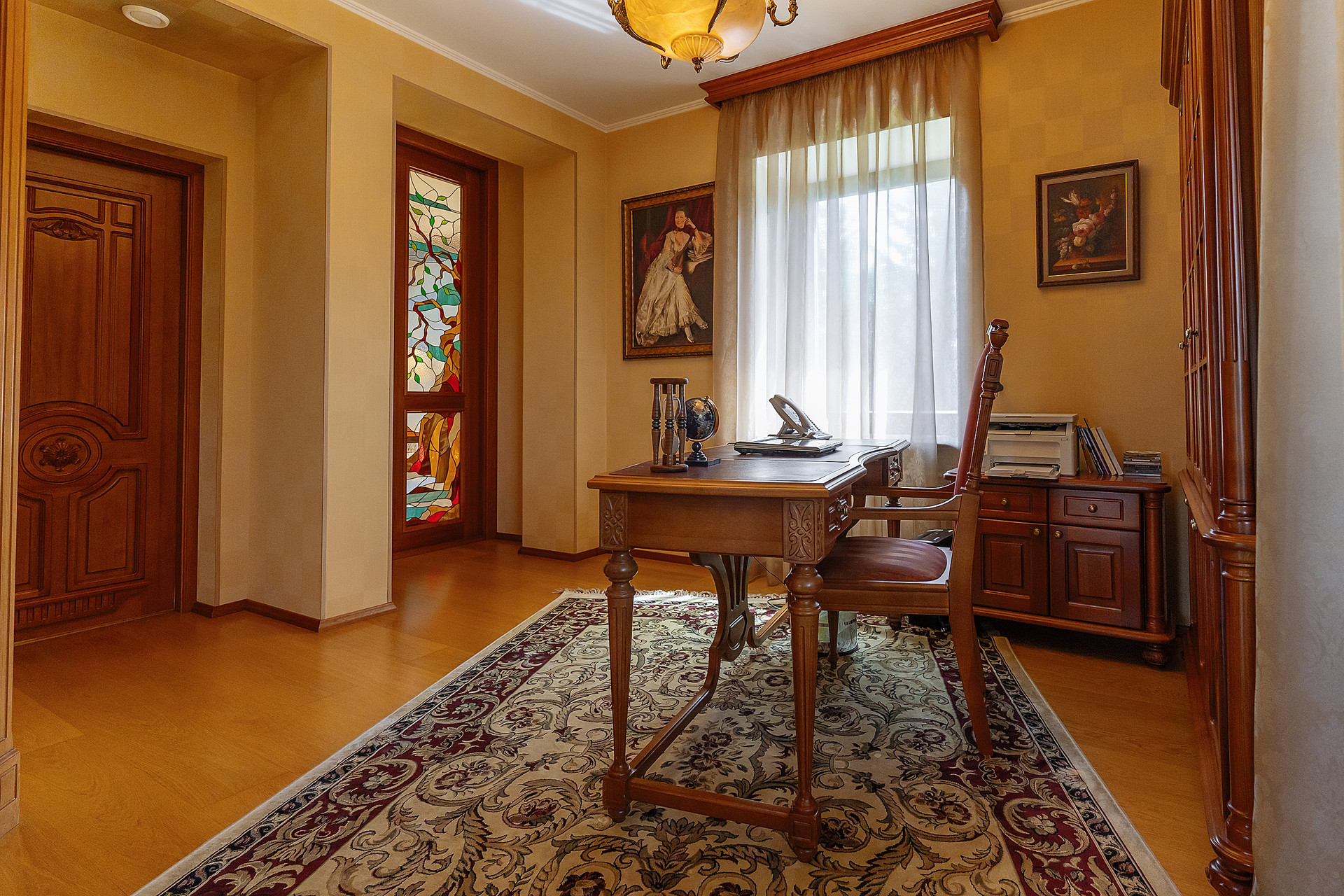 Вся мебель в доме выполнена по индивидуальным эскизам из дорогих пород дерева, вписана в интерьер известным дизайнером.