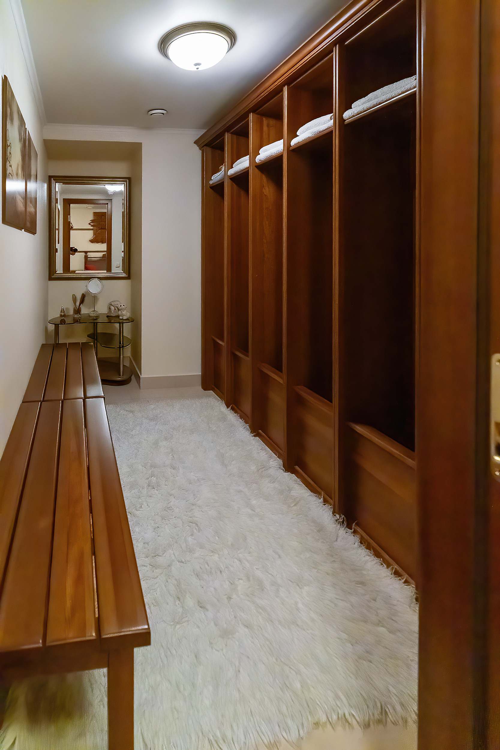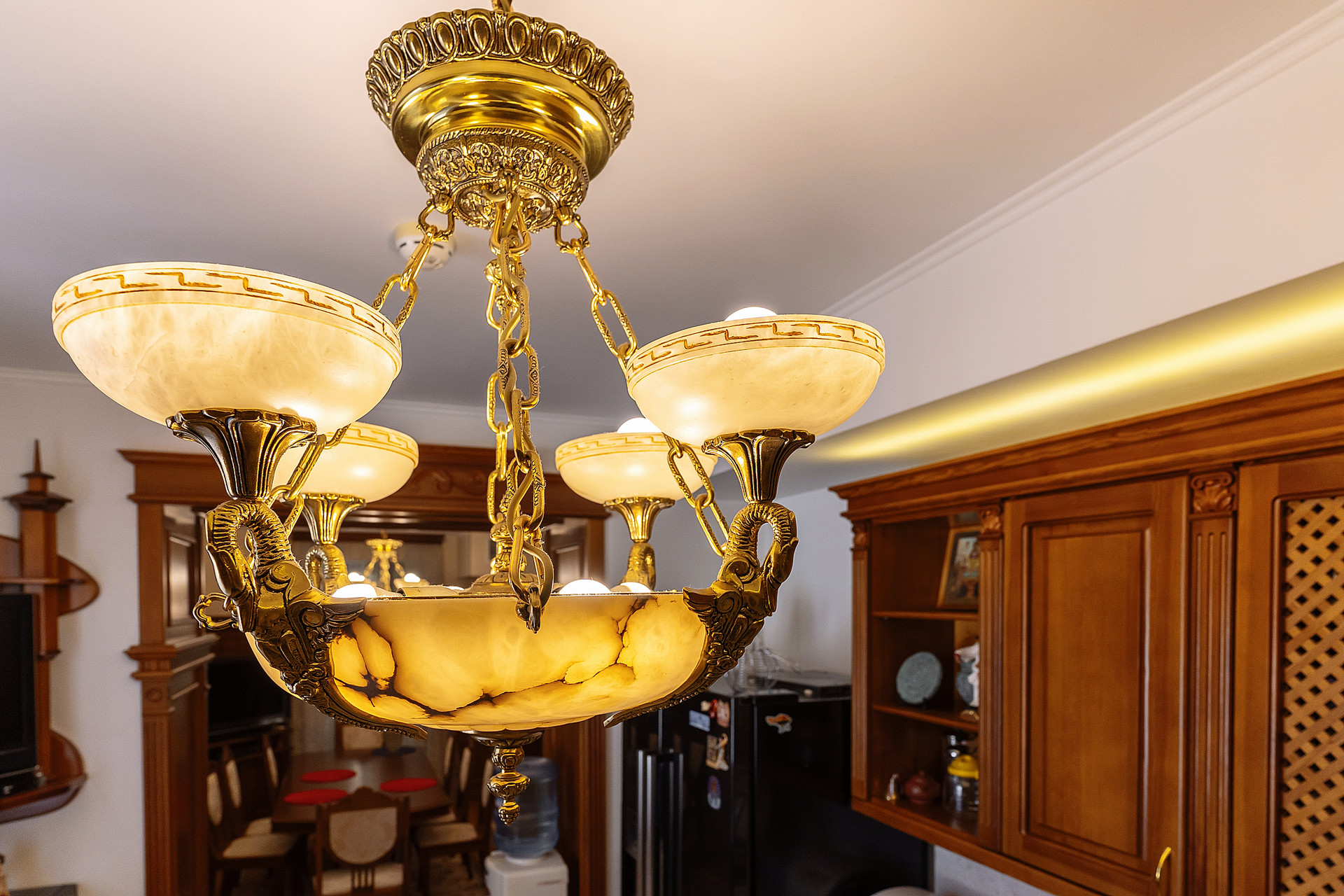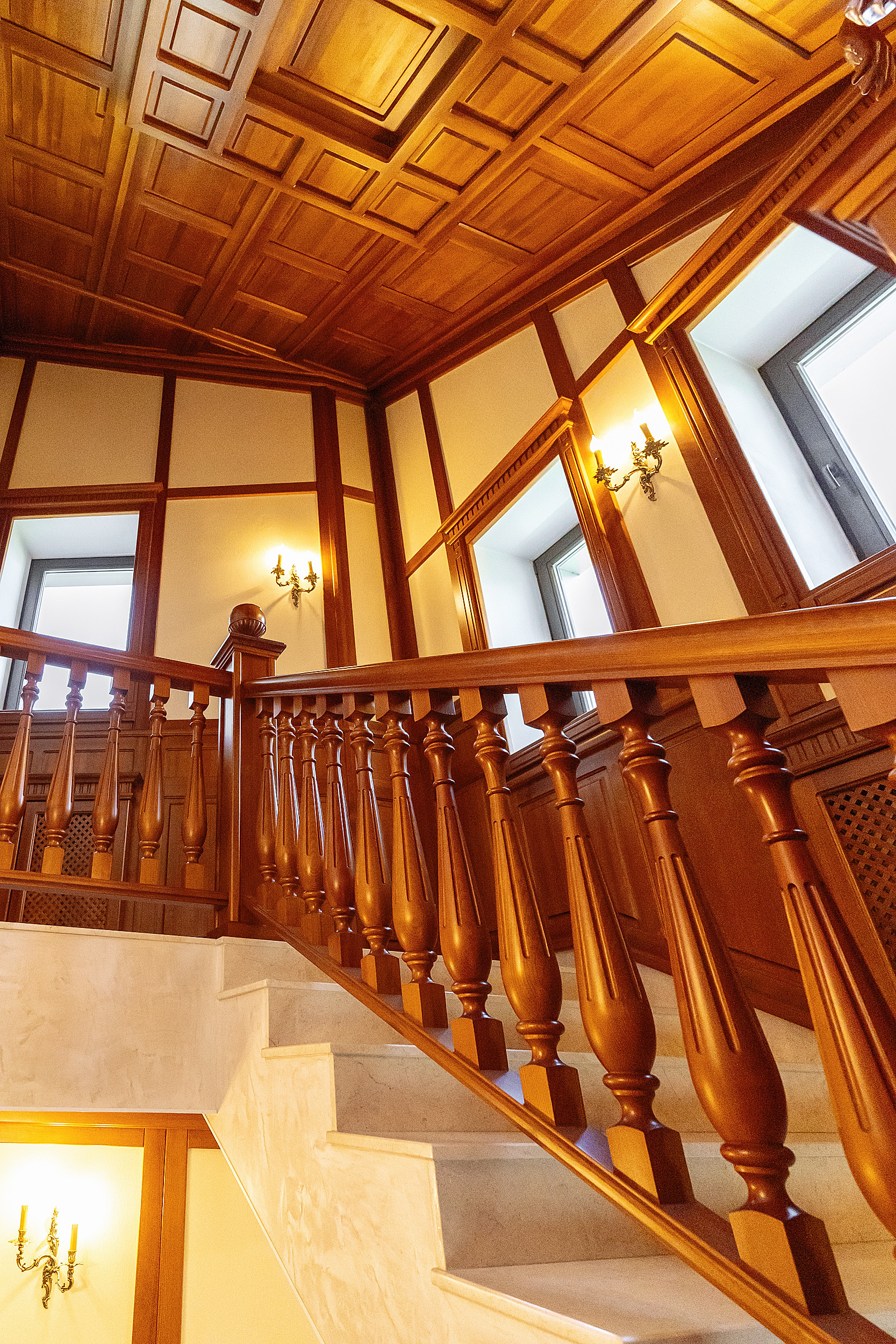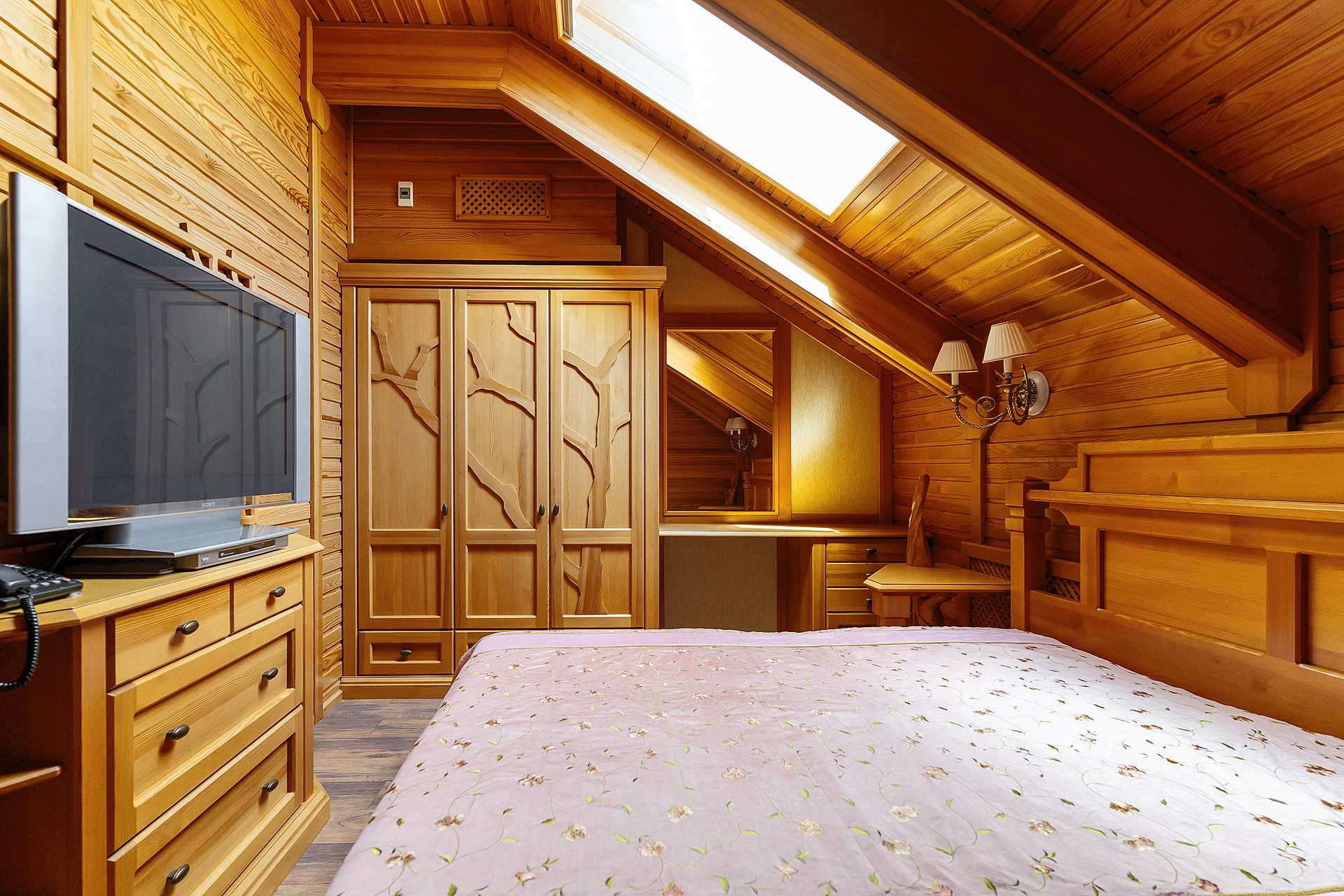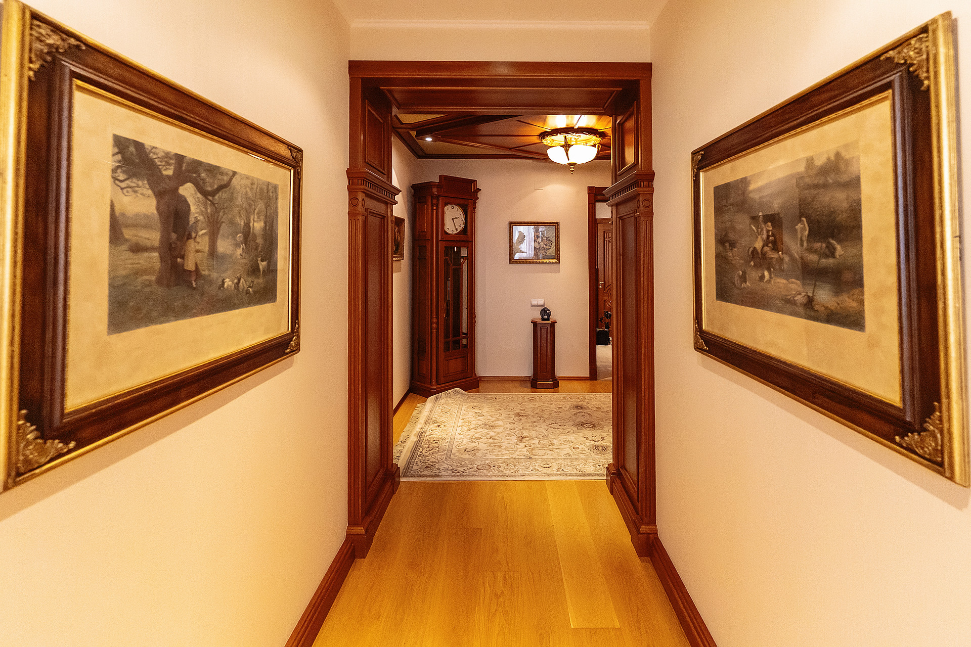 Вся мебель в доме выполнена по индивидуальным эскизам из дорогих пород дерева, вписана в интерьер известным дизайнером.