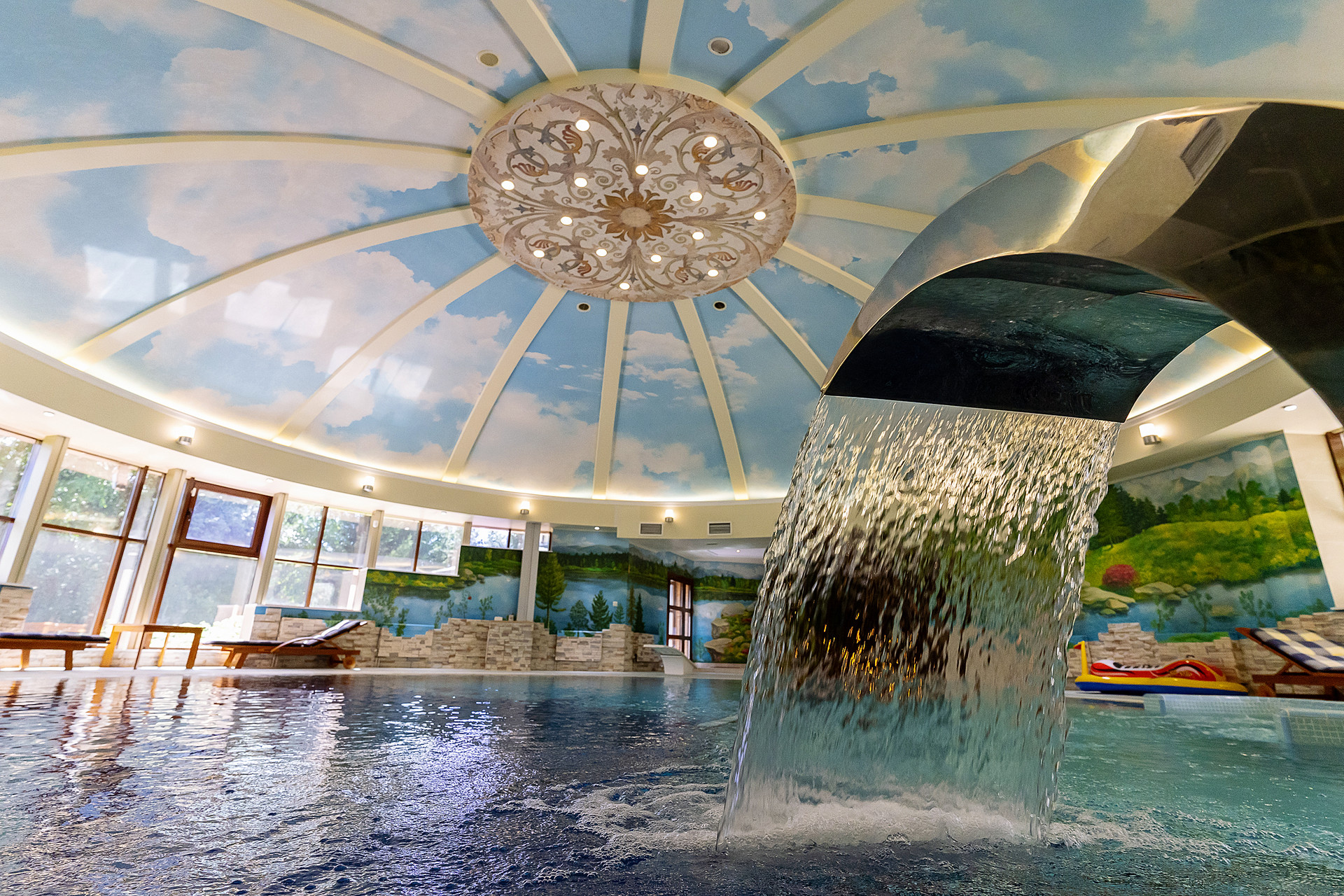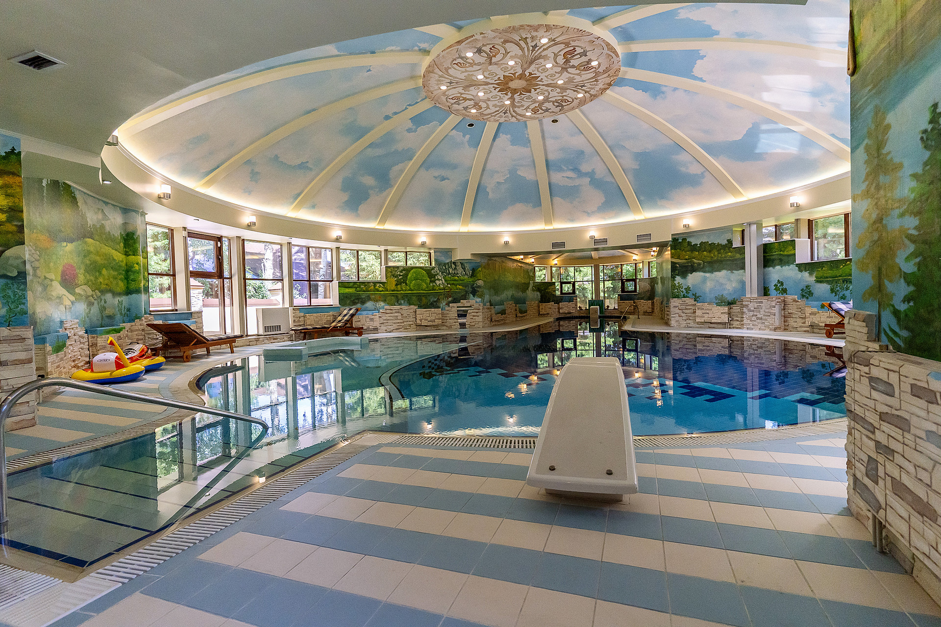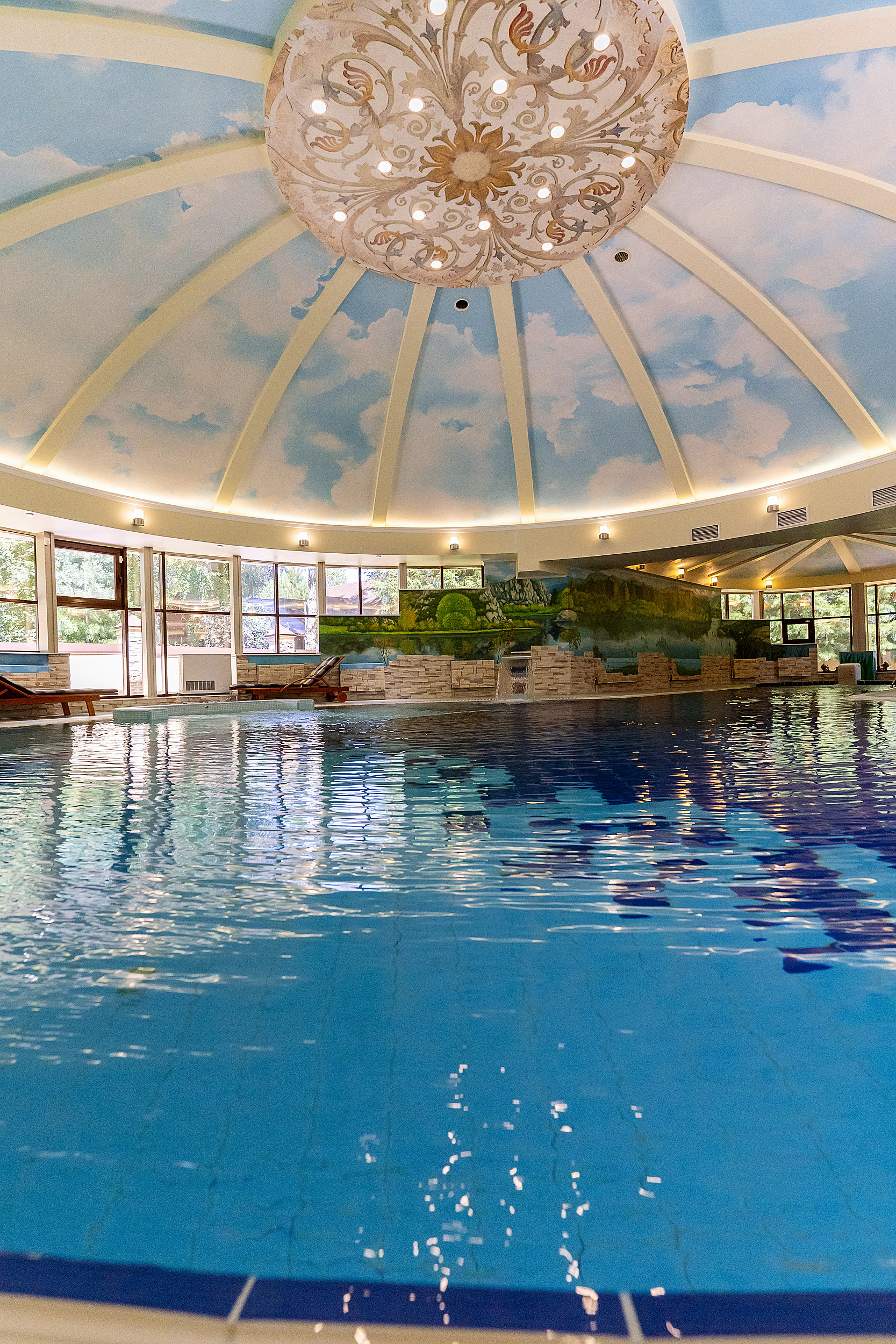 Бассейн расположен в отдельном крыле, работает автономно, имеет собственную мощную систему вентиляцию и очистки воды.