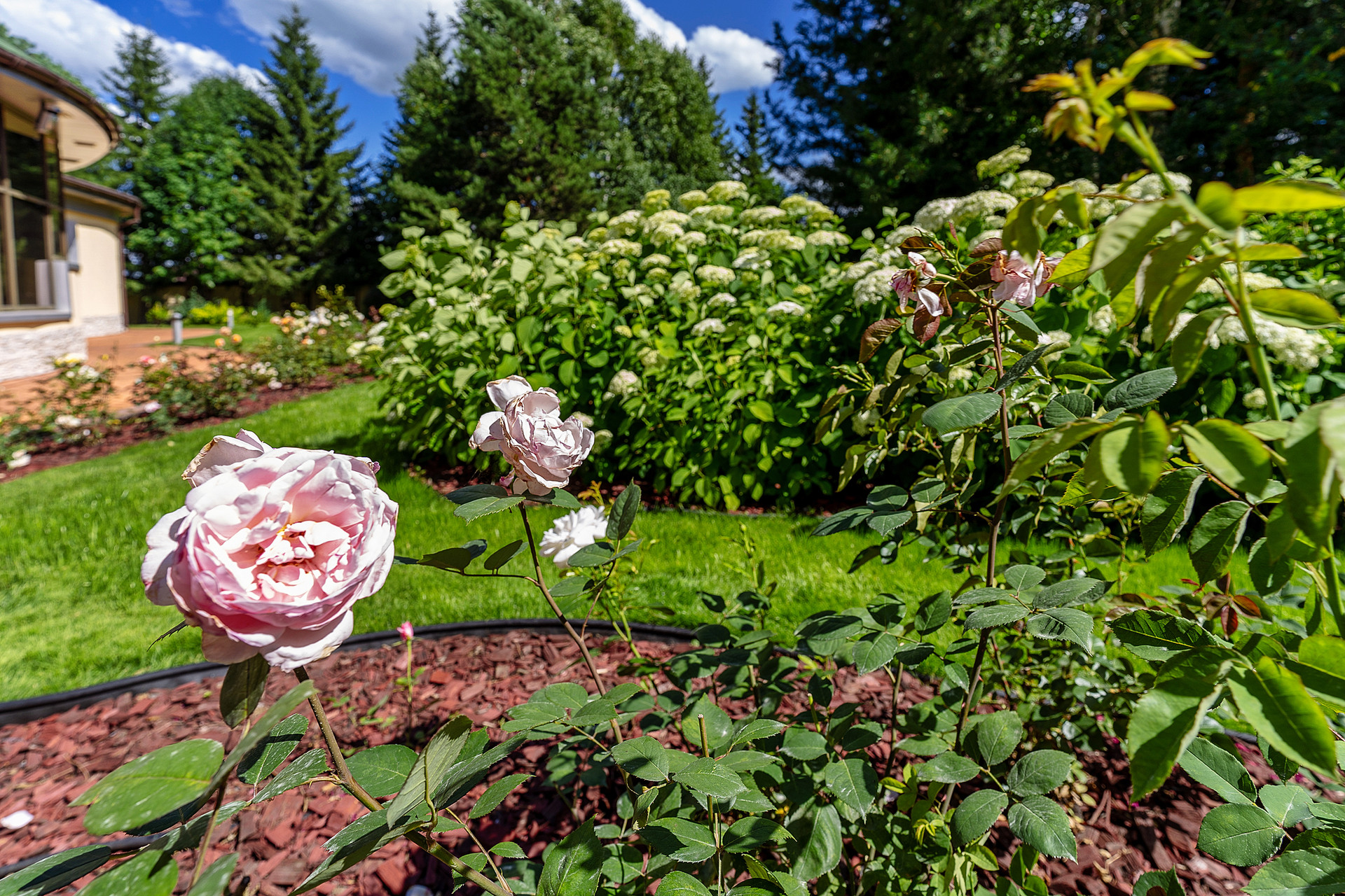 Ландшафтный дизайн с множеством кустов роз, гортензий и рокариями радует глаз.