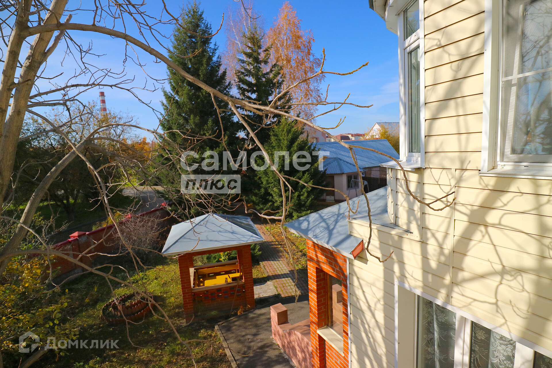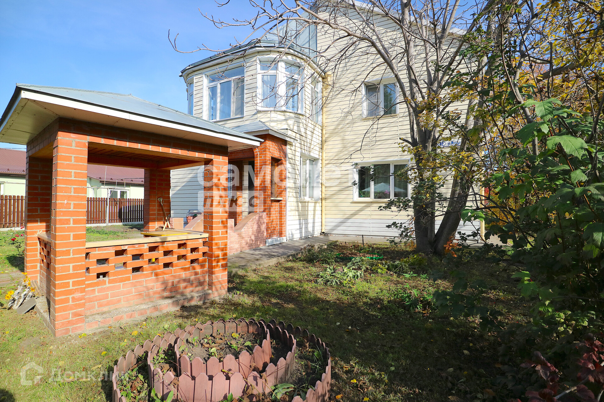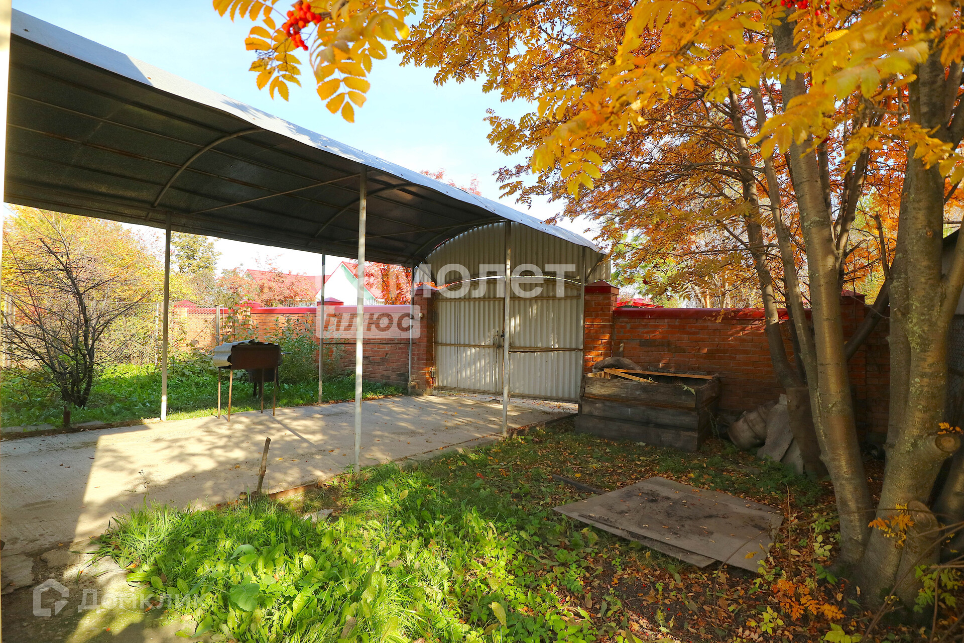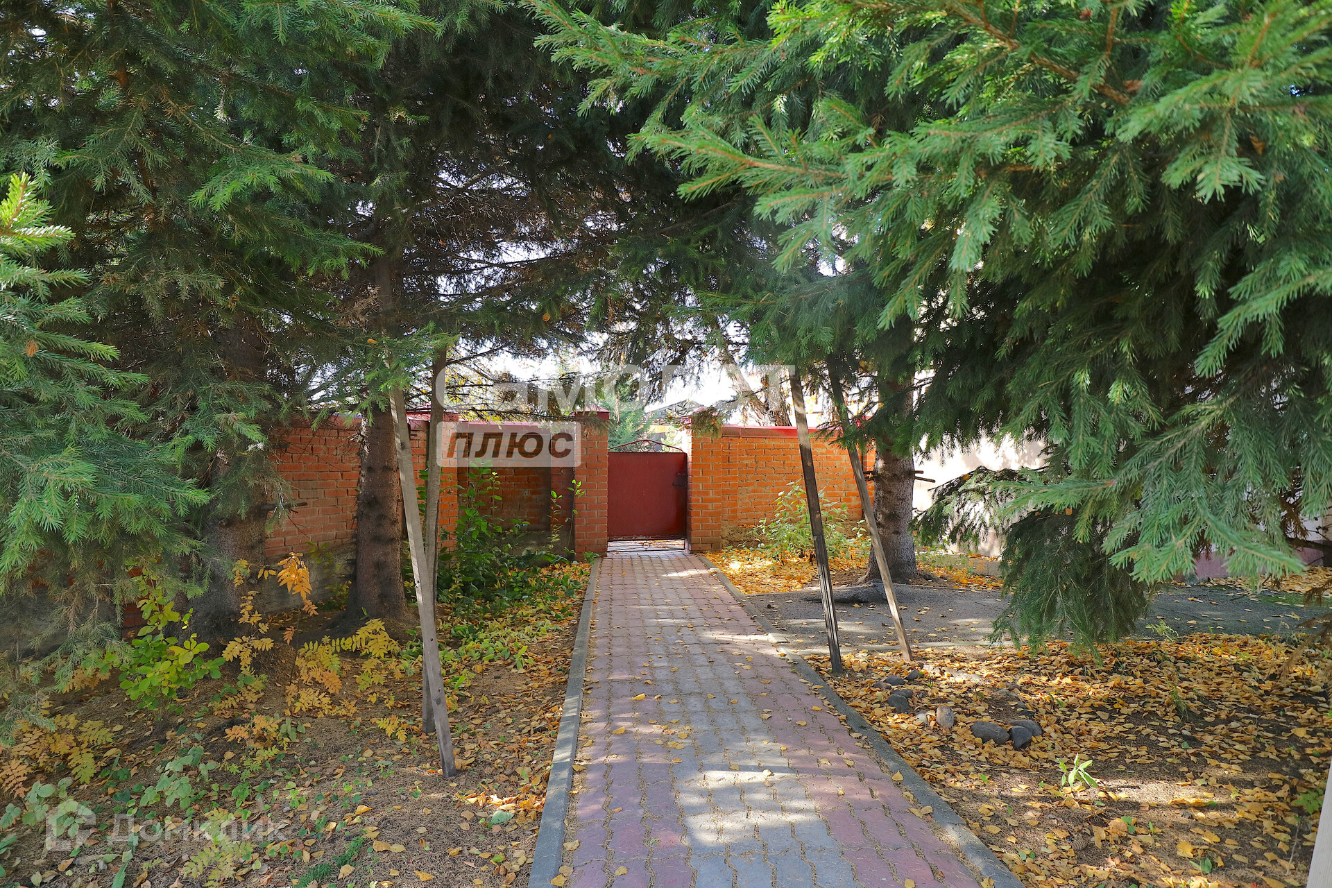 Территория коттеджа обнесена большим кирпичным забором по всему периметру.