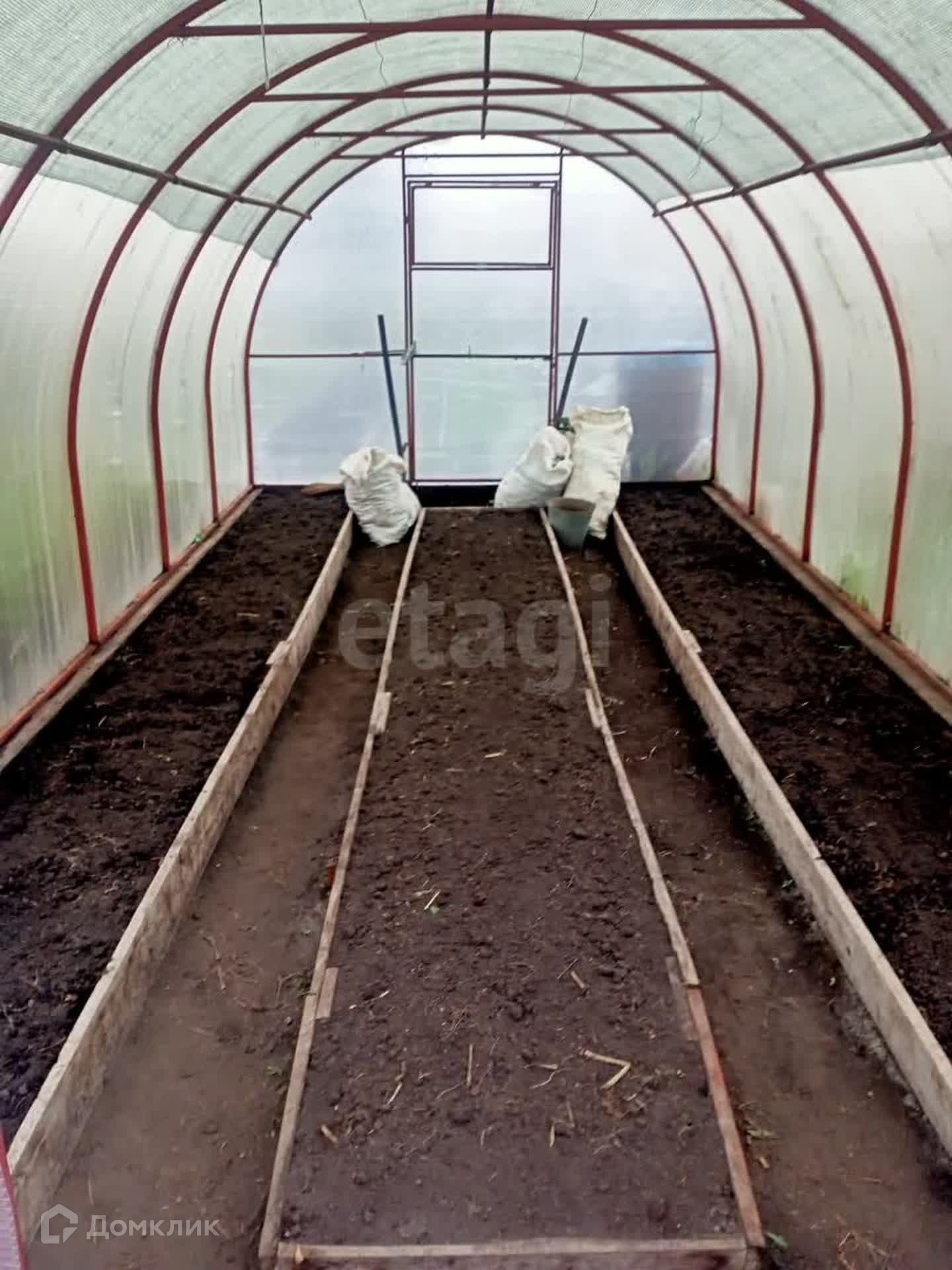 - Две большие новые теплицы с аккуратными грядками.