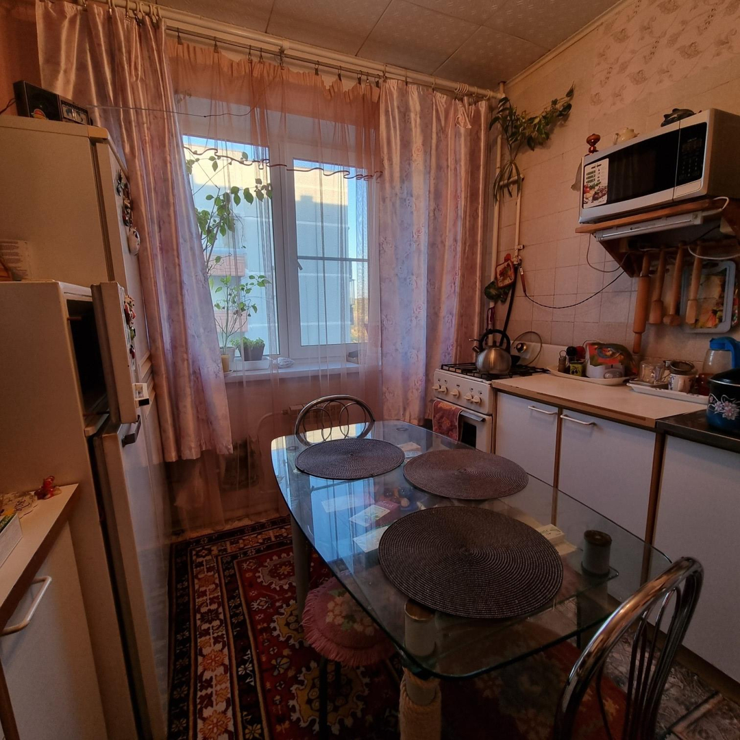 Квартира в обычном состоянии, без долгов, чистая, косметический ремонт, везде евроокна. Лоджия застеклена, есть кладовая, водонагреватель. Возможен обмен на квартиру в Озёрске.