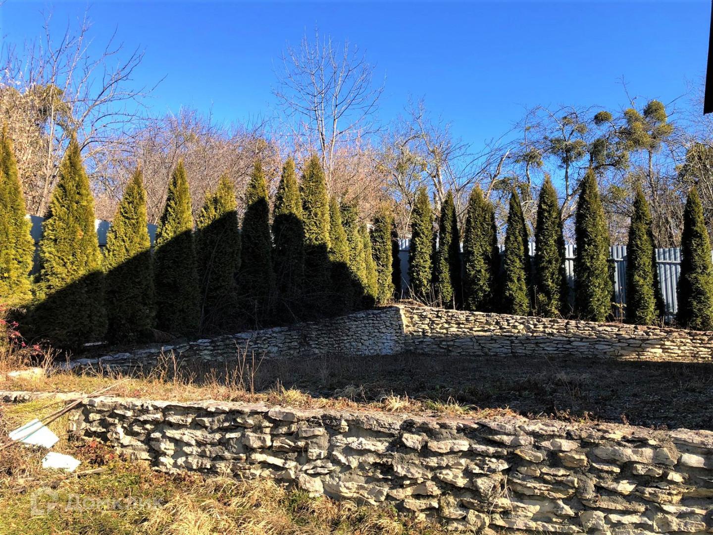 Участок угловой, расположен на возвышенности, огорожен забором из профлиста, высажены декоративные растения, установлена летняя беседка.