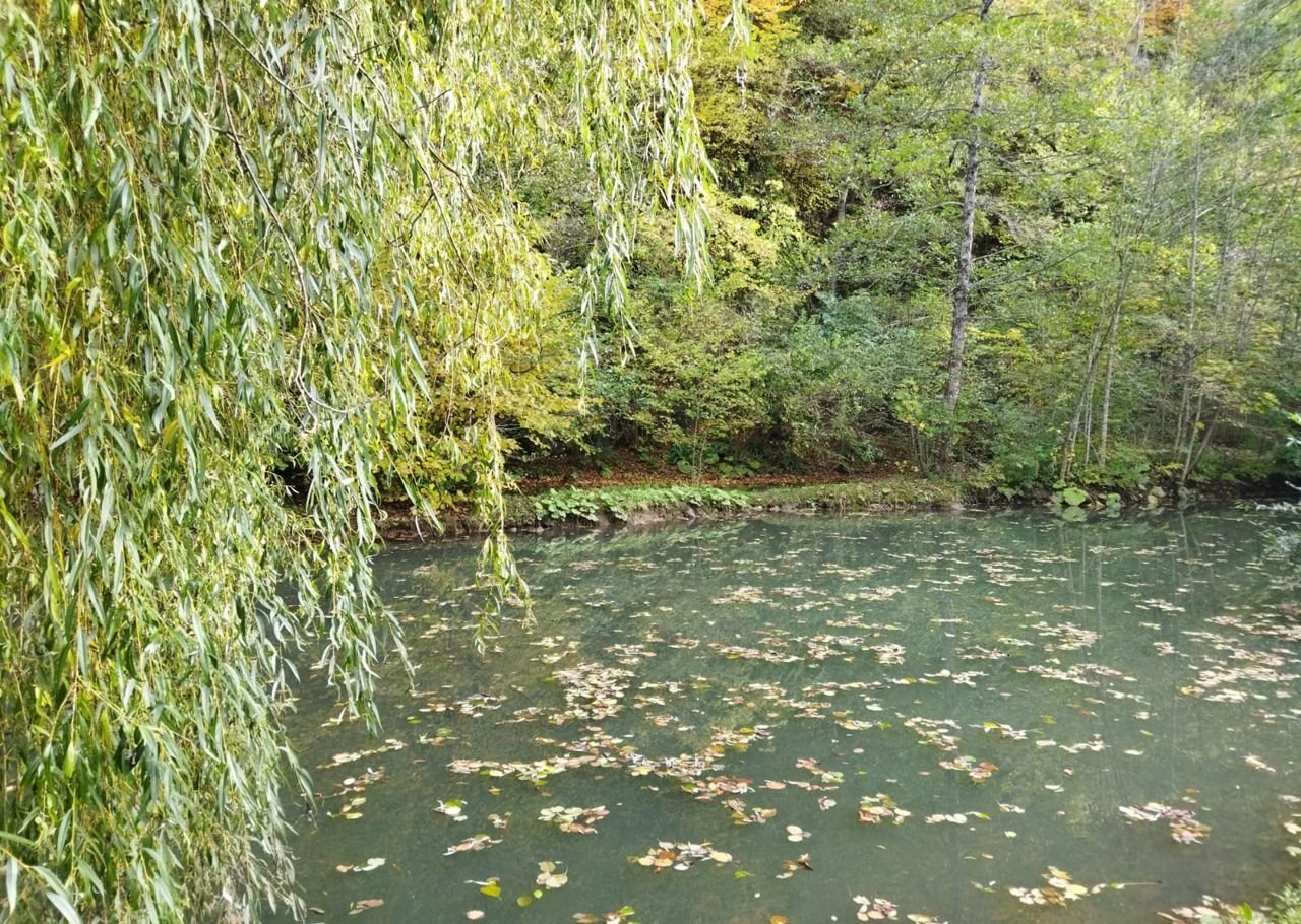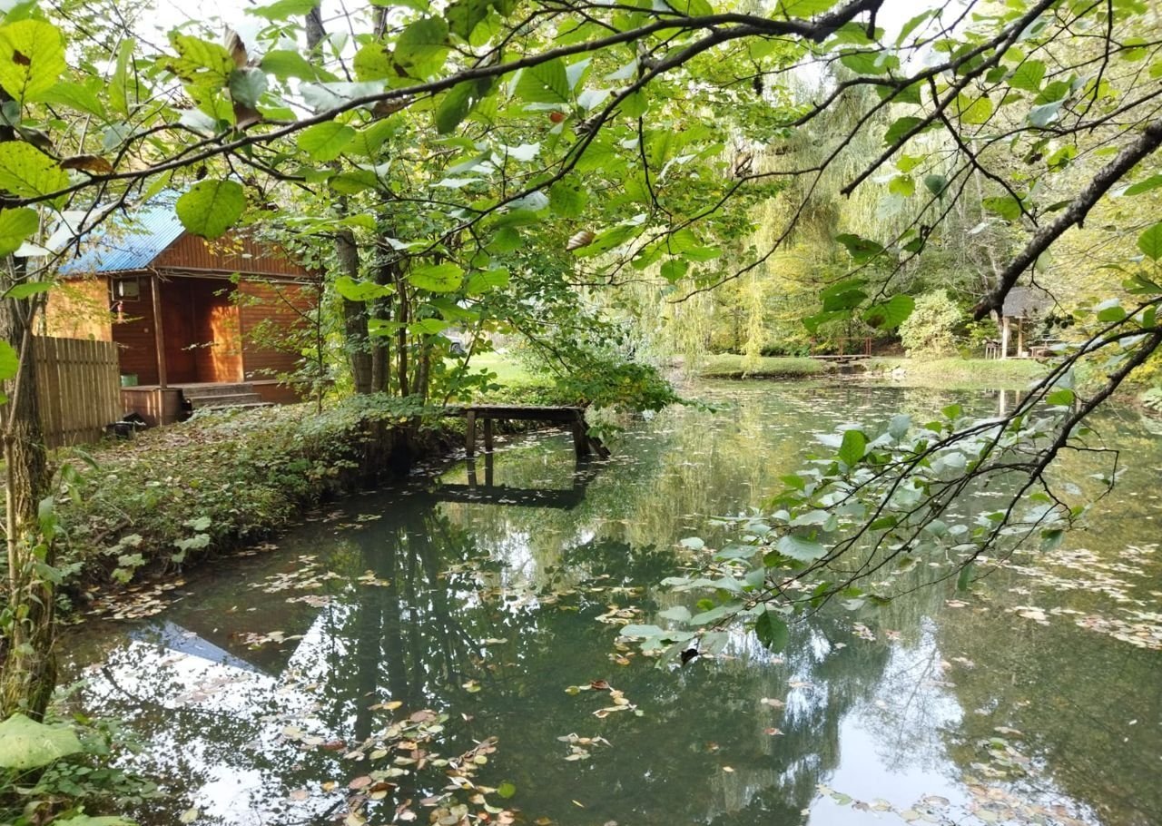 На территории озеро (пруд) 500 кв.м. и естественный водопад со скалы (граница участка с тыльной стороны проходит под небольшой скалой порядка 10 м).
