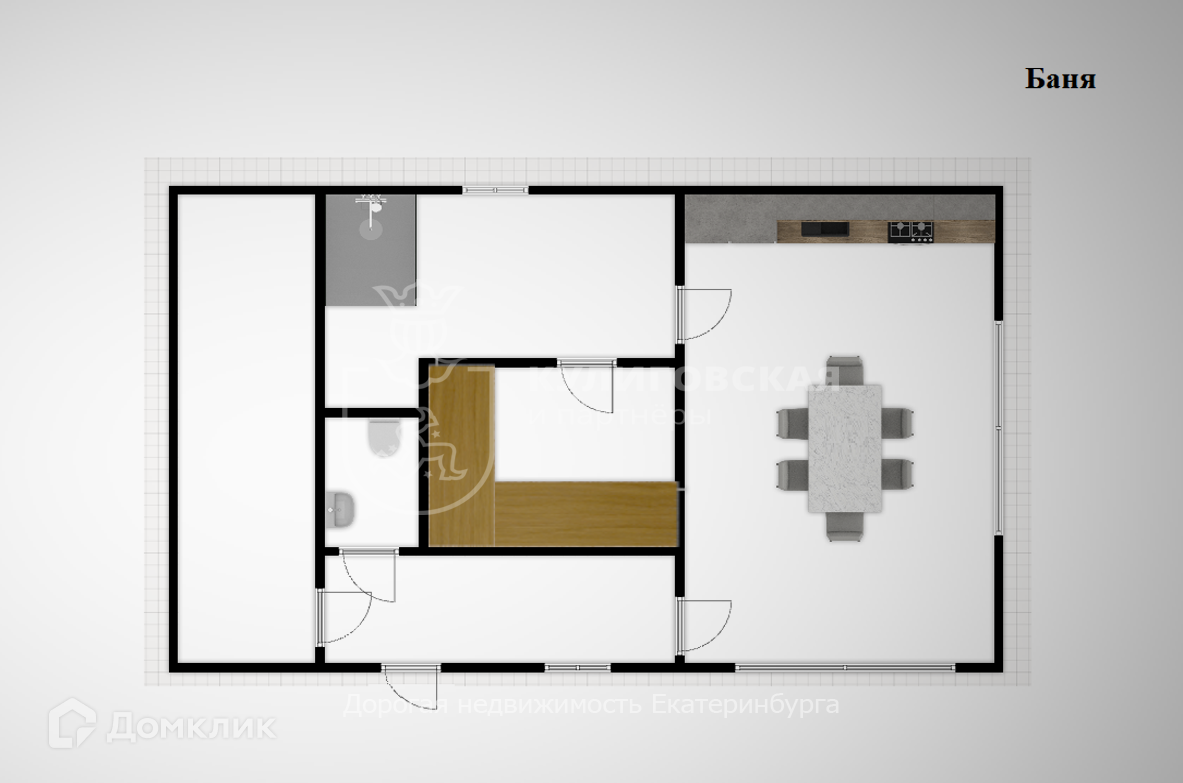 На первом этаже располагаются просторная гостиная с домашним кинотеатром и шикарным камином с трехсторонней топкой; кухня (немецкая кухня nobilia со встроенной премиальной техникой от Gaggenau); обеденная зона с массивным столом, привезенным из Индонезии; гостевая ванная комната с душевой кабиной; кладовая; котельная и гараж с теплым полом. На втором этаже детская комната; гостевая; ванная комната и мастер-спальня на 45 кв. м с огромной кроватью размером 2400x2000 см, совмещенная с гардеробной на 11 кв. м. Изголовье кровати и столешница под раковину на первом этаже сделаны из тика, которой привезли из Таиланда (Самуи). Кроме того, для особых ценителей, в доме предусмотрена винная комната с постоянной температурой +10. В отдельном здании расположена баня.