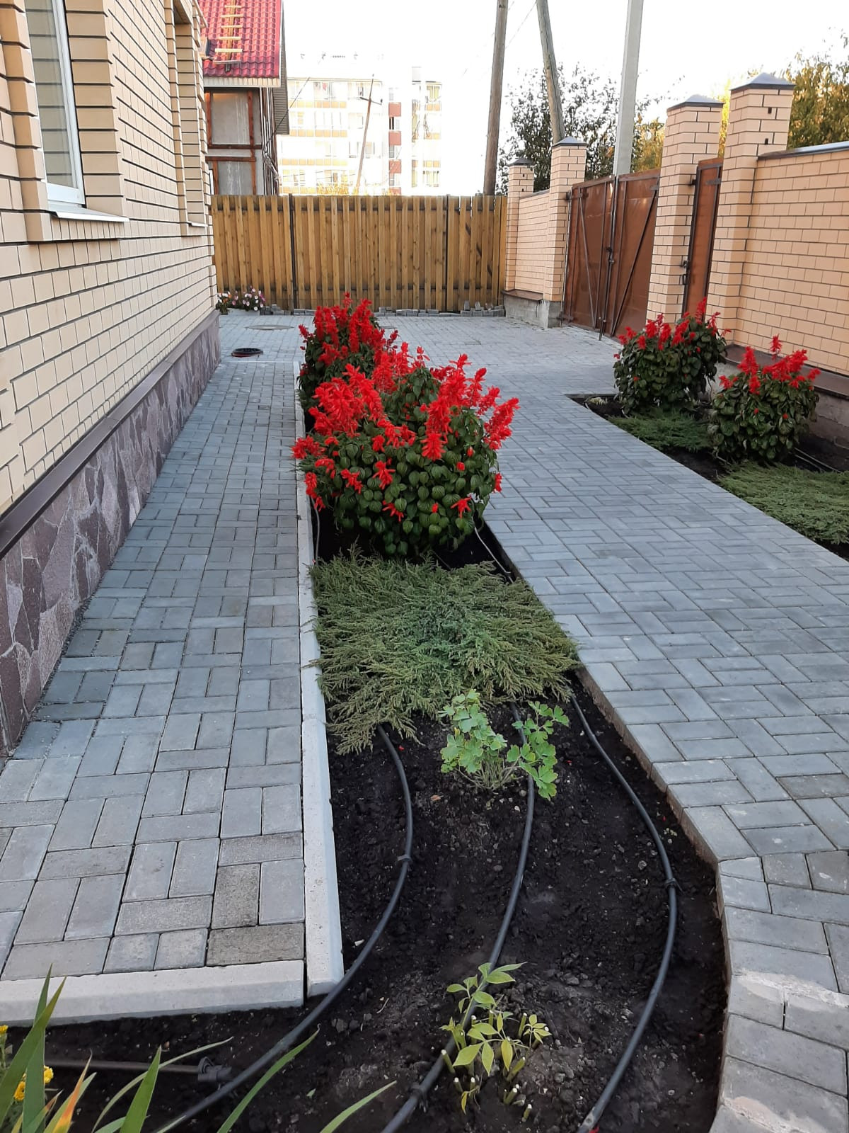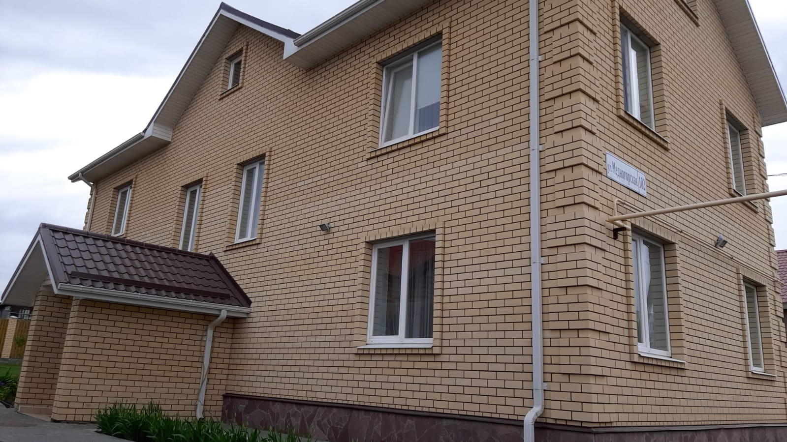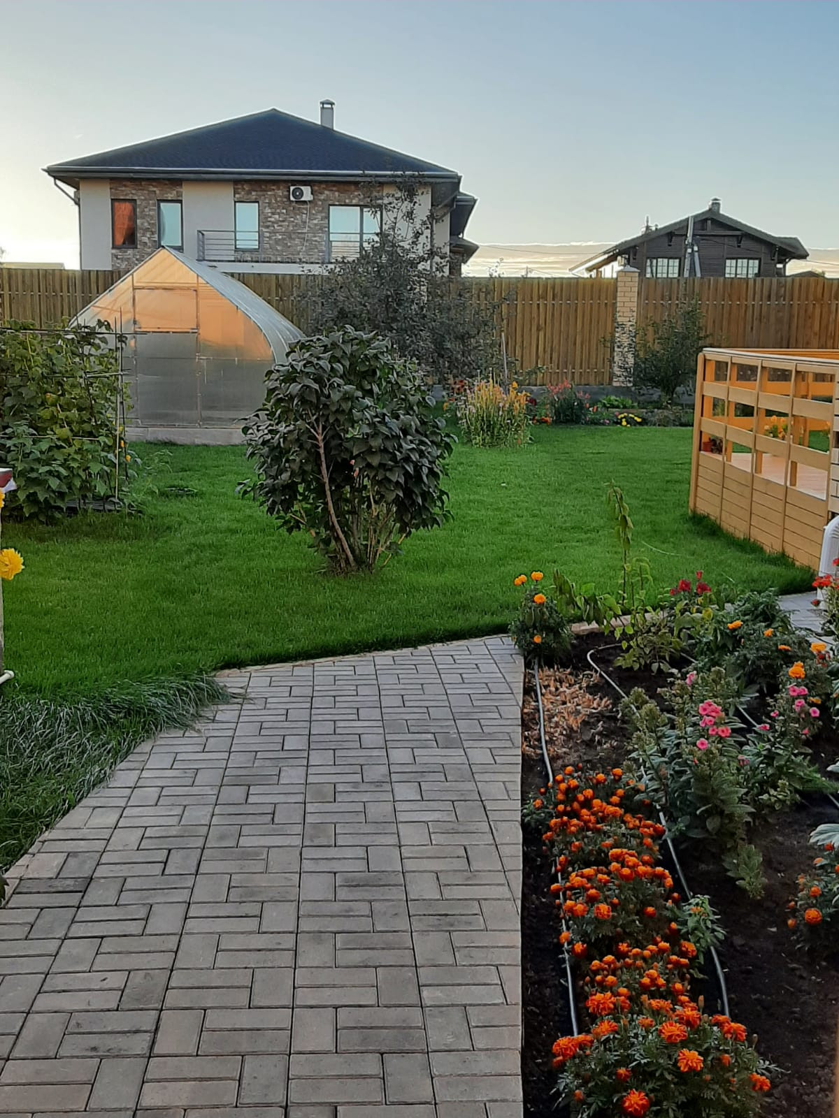 Дом расположен на участке 11 соток. Участок ухоженный, с различными декоративными посадками, плодовыми деревьями и ягодными кустарниками, газоном – 2 сотки. На участке расположены два хозблока, теплица. Участок оборудован системой автоматического полива. Вокруг дома территория выложена тротуарной плиткой.