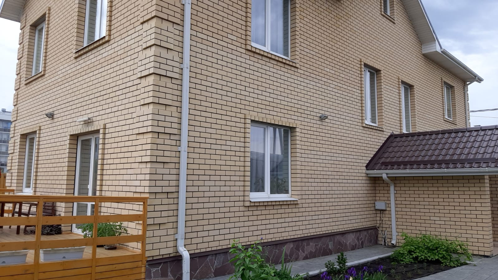 Стены выполнены из желтого (снаружи) и красного пустотелого кирпича (внутри дома), между которыми залит тепловой слой из полимербетона. В доме тепло зимой и прохладно жарким летом.
