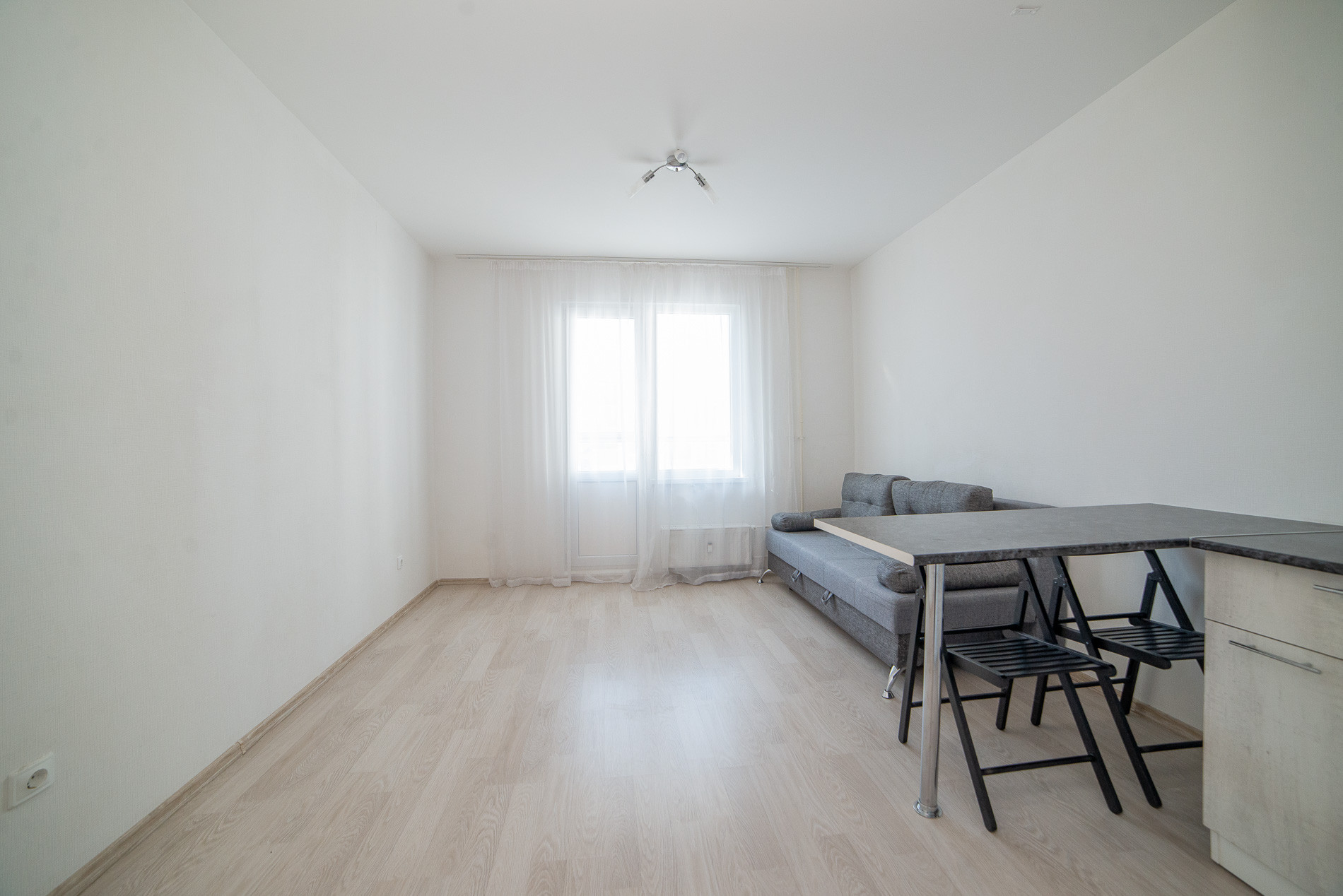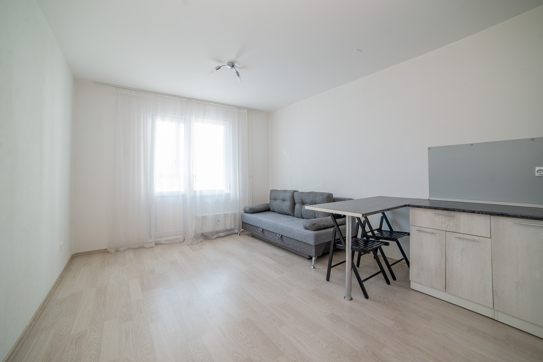 Просторная студия с мебелью и техникой в новом доме.