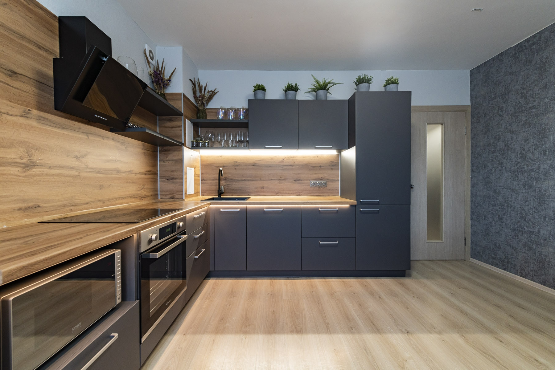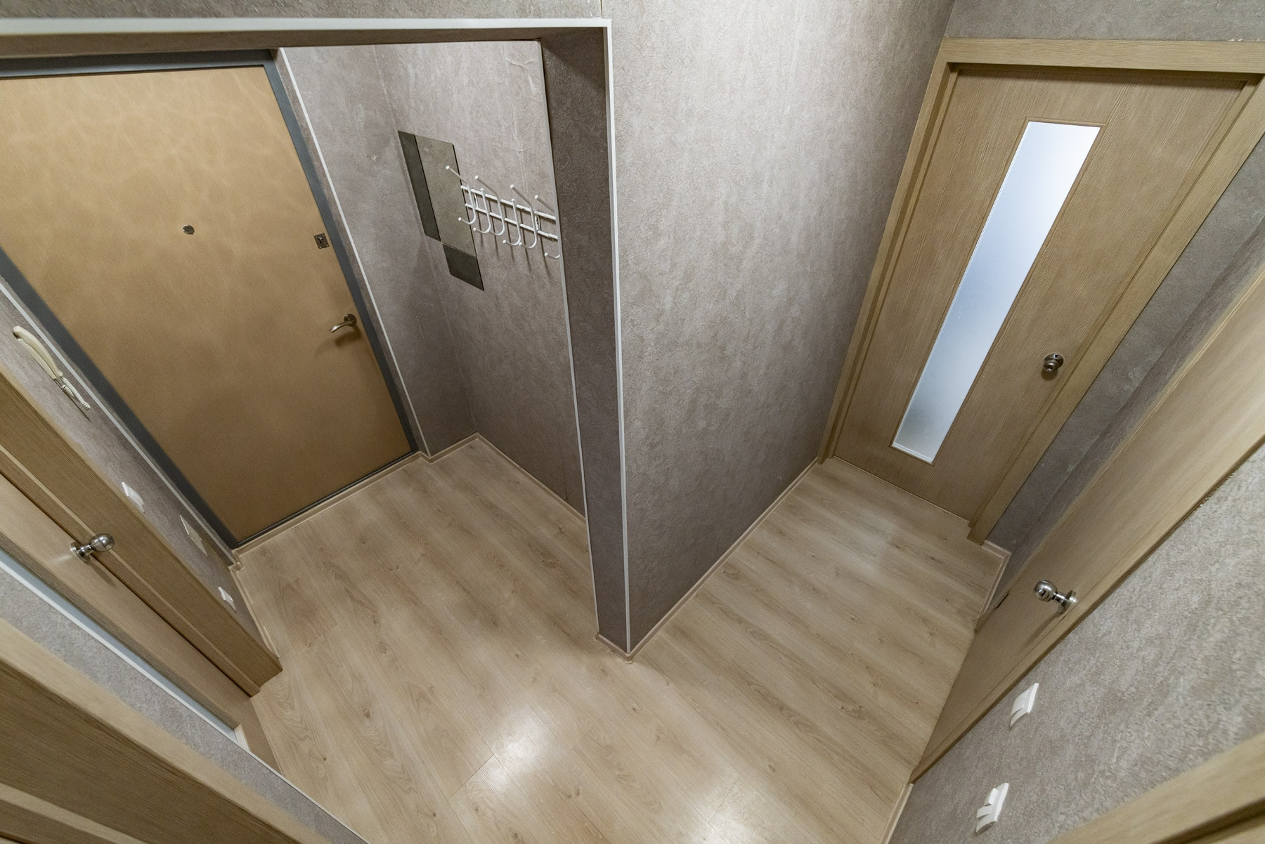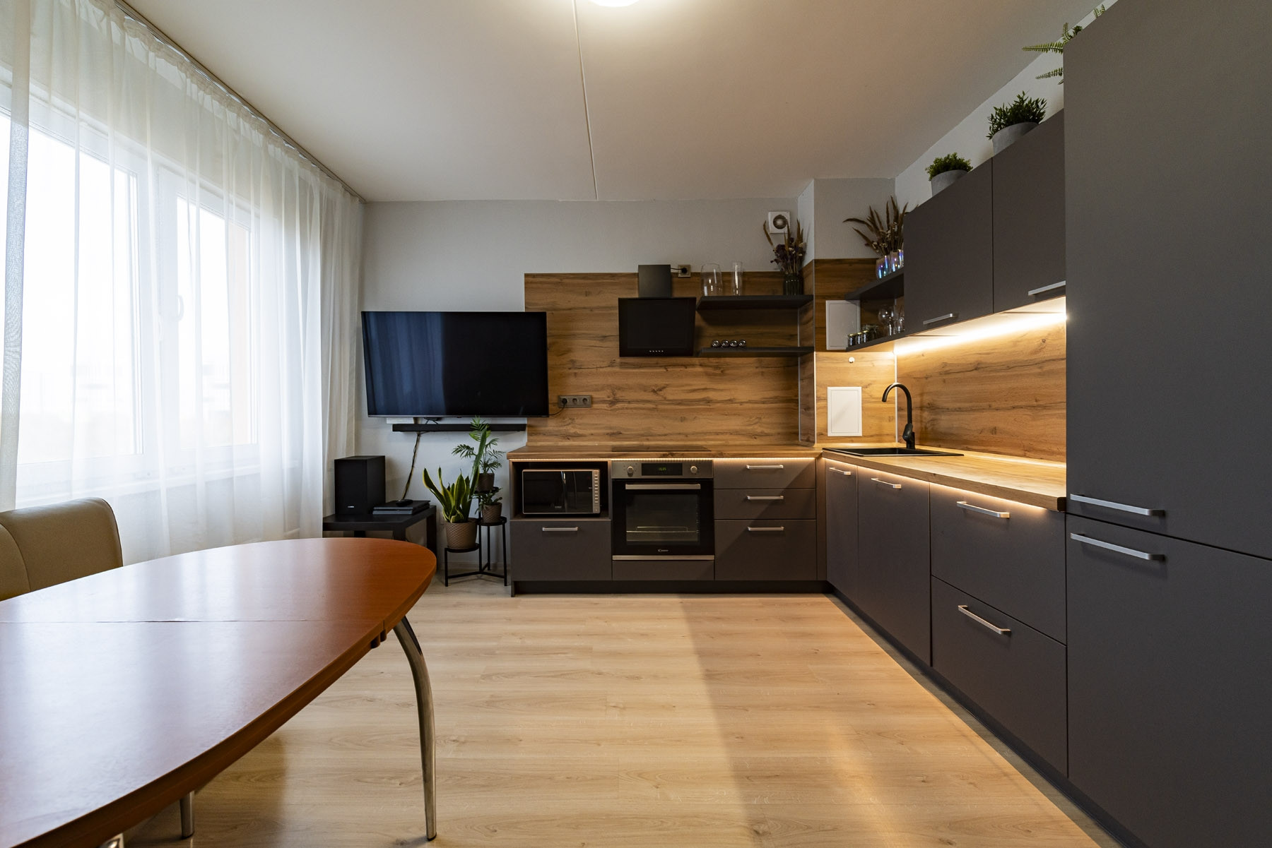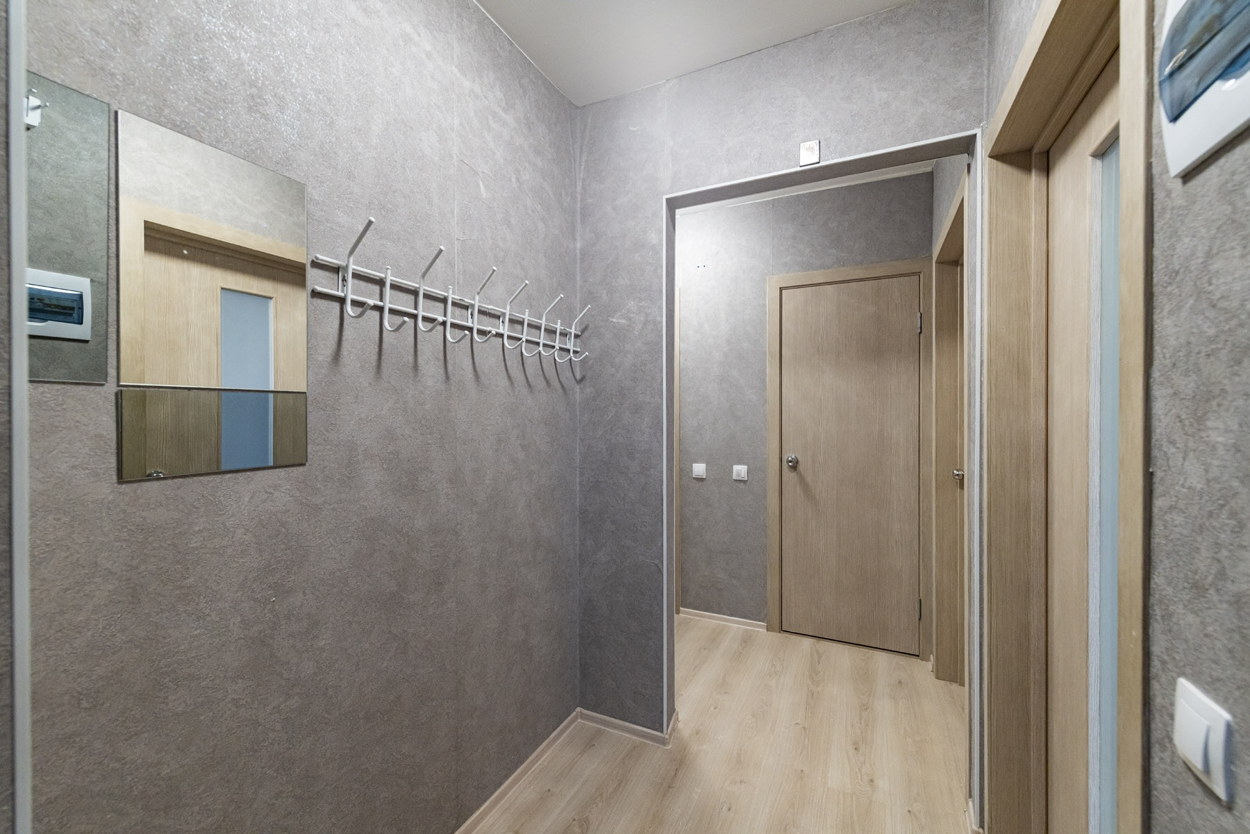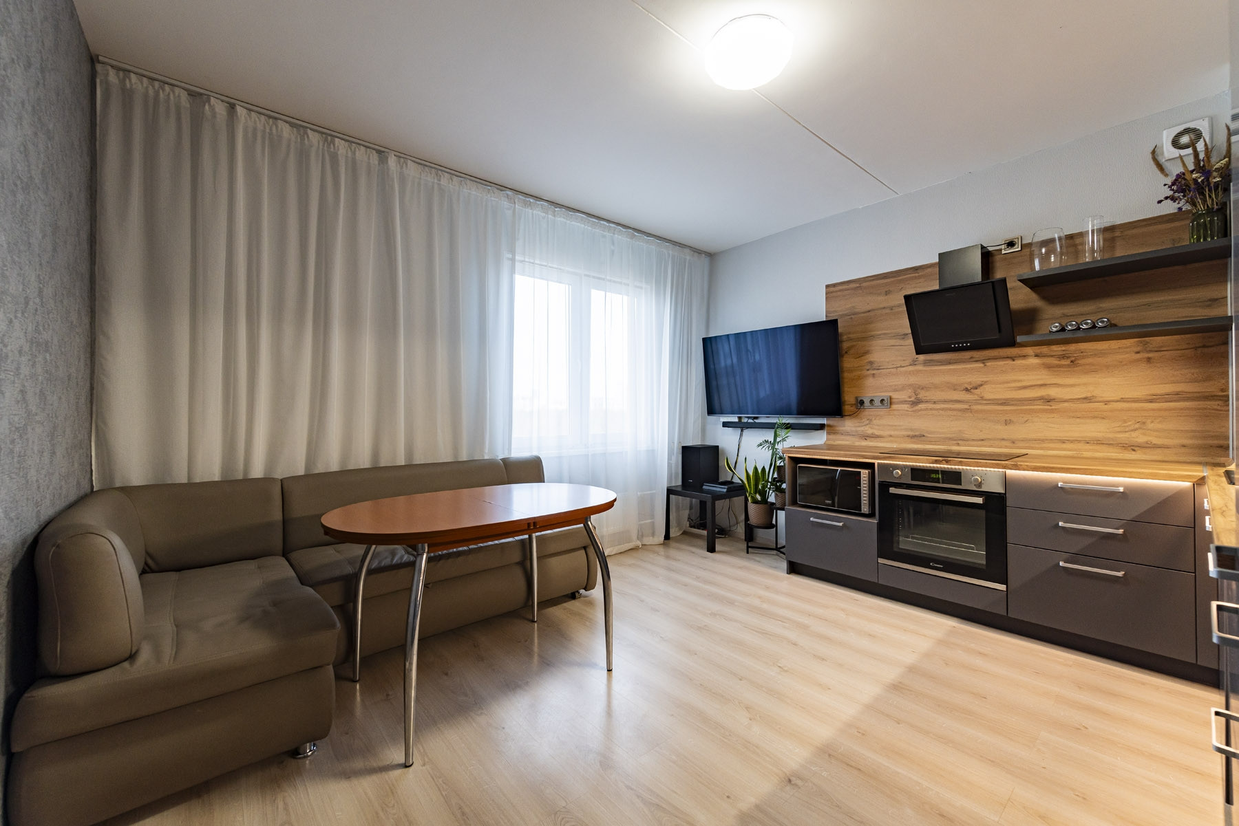 В квартире выполнена качественная отделка с использованием материалов европейского производства. Остаётся  встроенная мебель и техника на кухне (варочная панель Candy, духовой шкаф Candy, вытяжка Wiessgauf, посудомоечная машина Hansa, холодильник Gorenje).