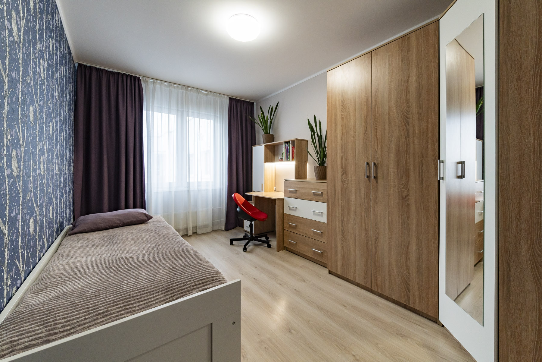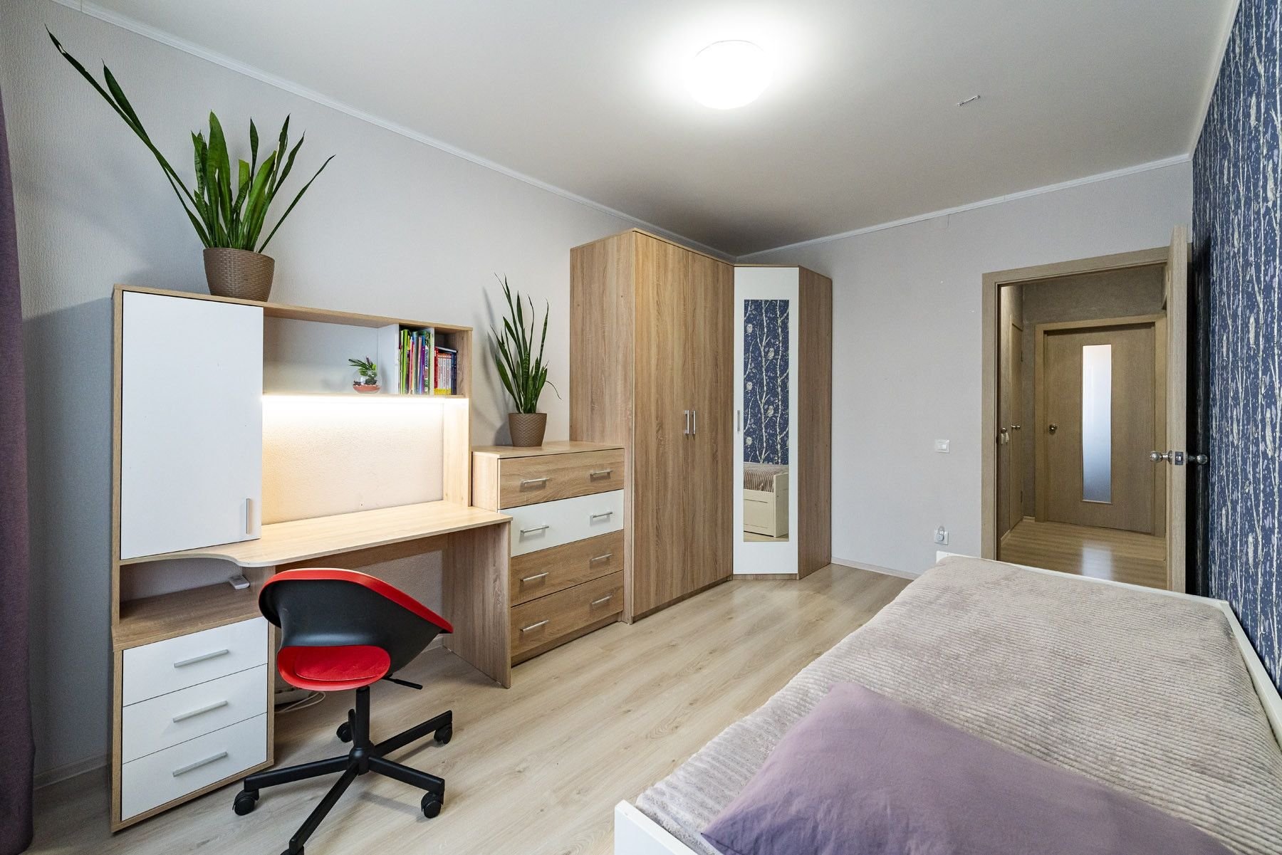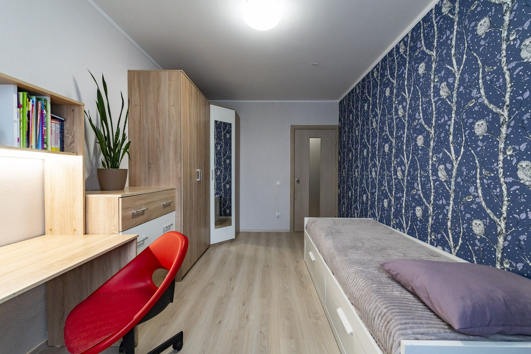 Подарок новому собственику - обеденная зона с раздвижным столом и диваном. Помимо этого из мебели остаётся спальный гарнитур (двуспальная кровать с подъемным механизмом, трехстворчатый шкаф, 2 прикроватные тумбочки, комод). В деткой кровать IKEA, шкафы, письменный стол.