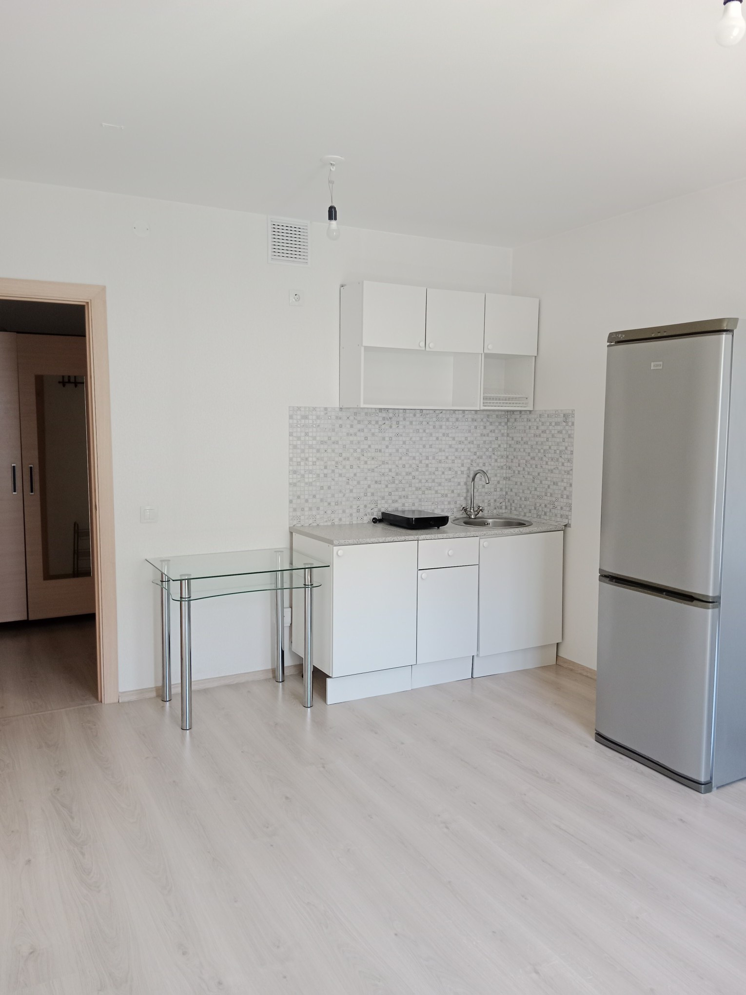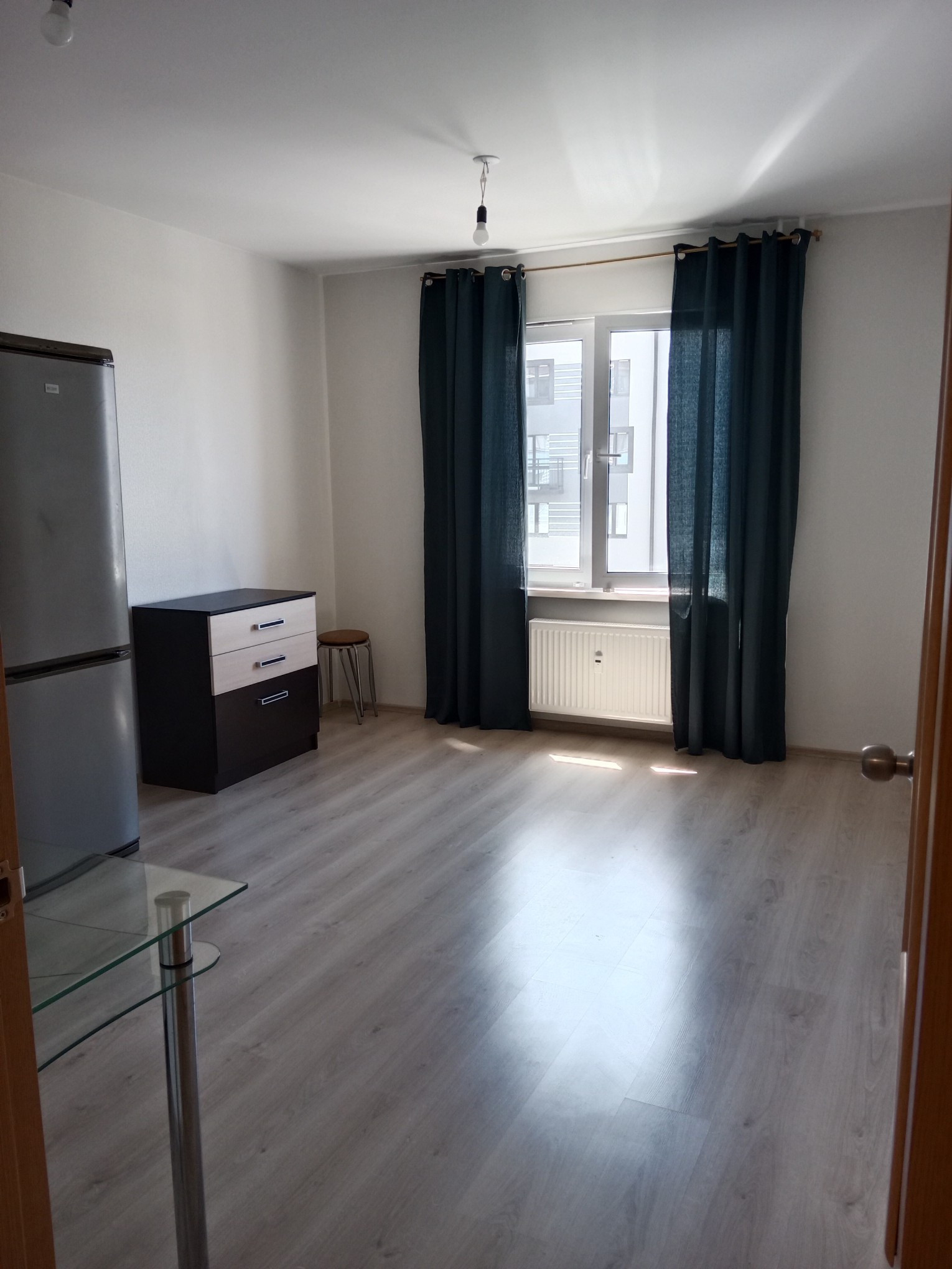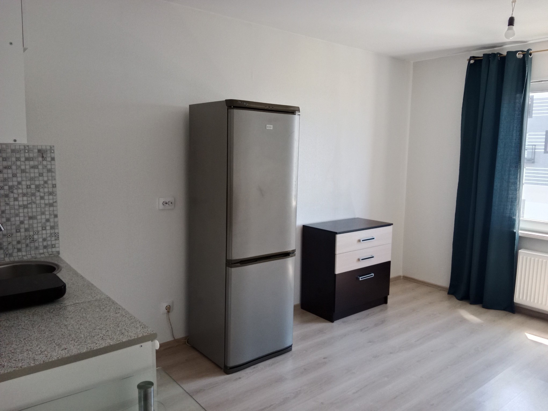 Студия имеет удачную планировку, все помещения правильной формы. Комната просторная, светлая, легко выполнить зонирование. Отделка от застройщика: в коридоре и комнате обои под покраску, ламинат, в санузле - керамическая плитка, водостойкая краска.